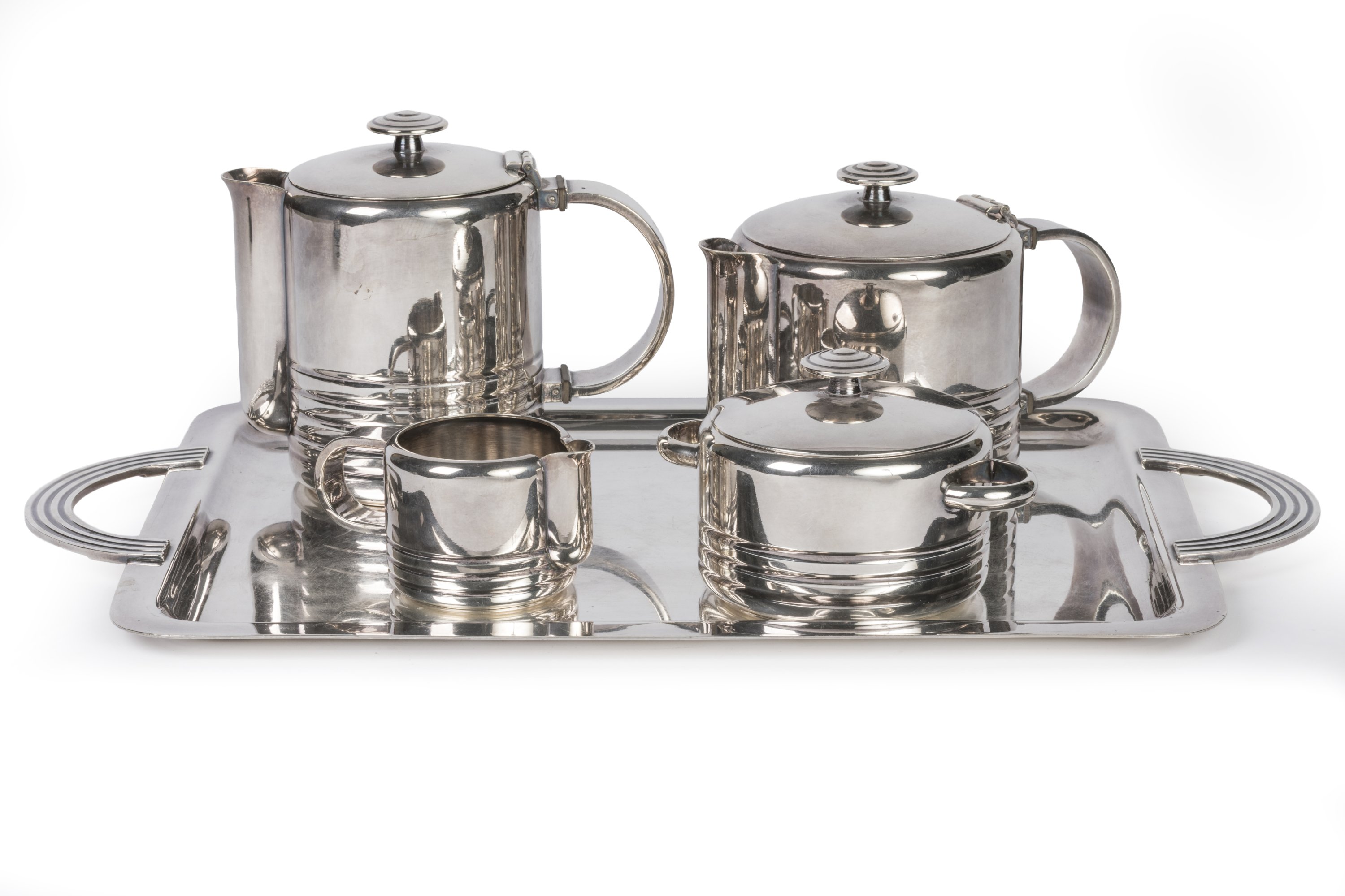 Comprenant : cafetière théière, sucrier, pot à lait et plateau.