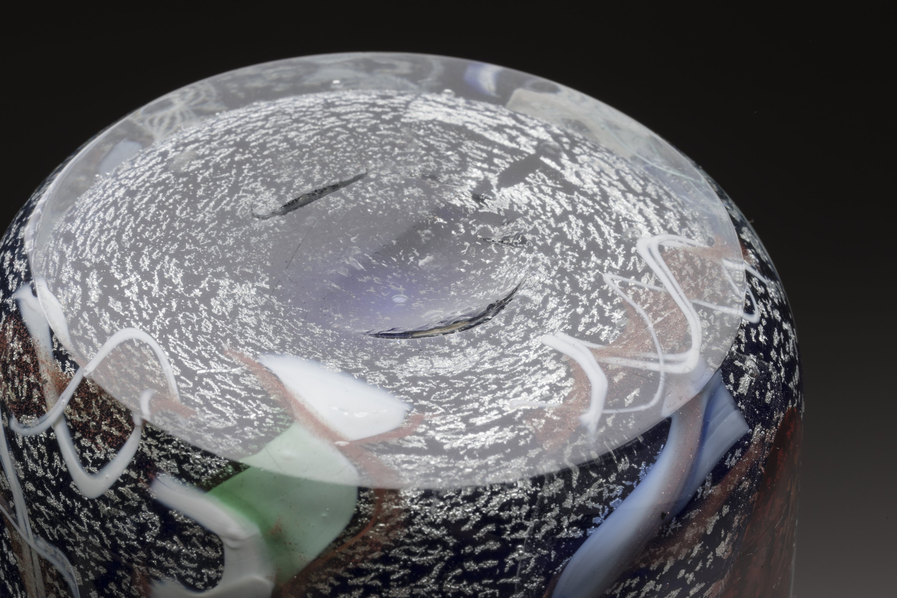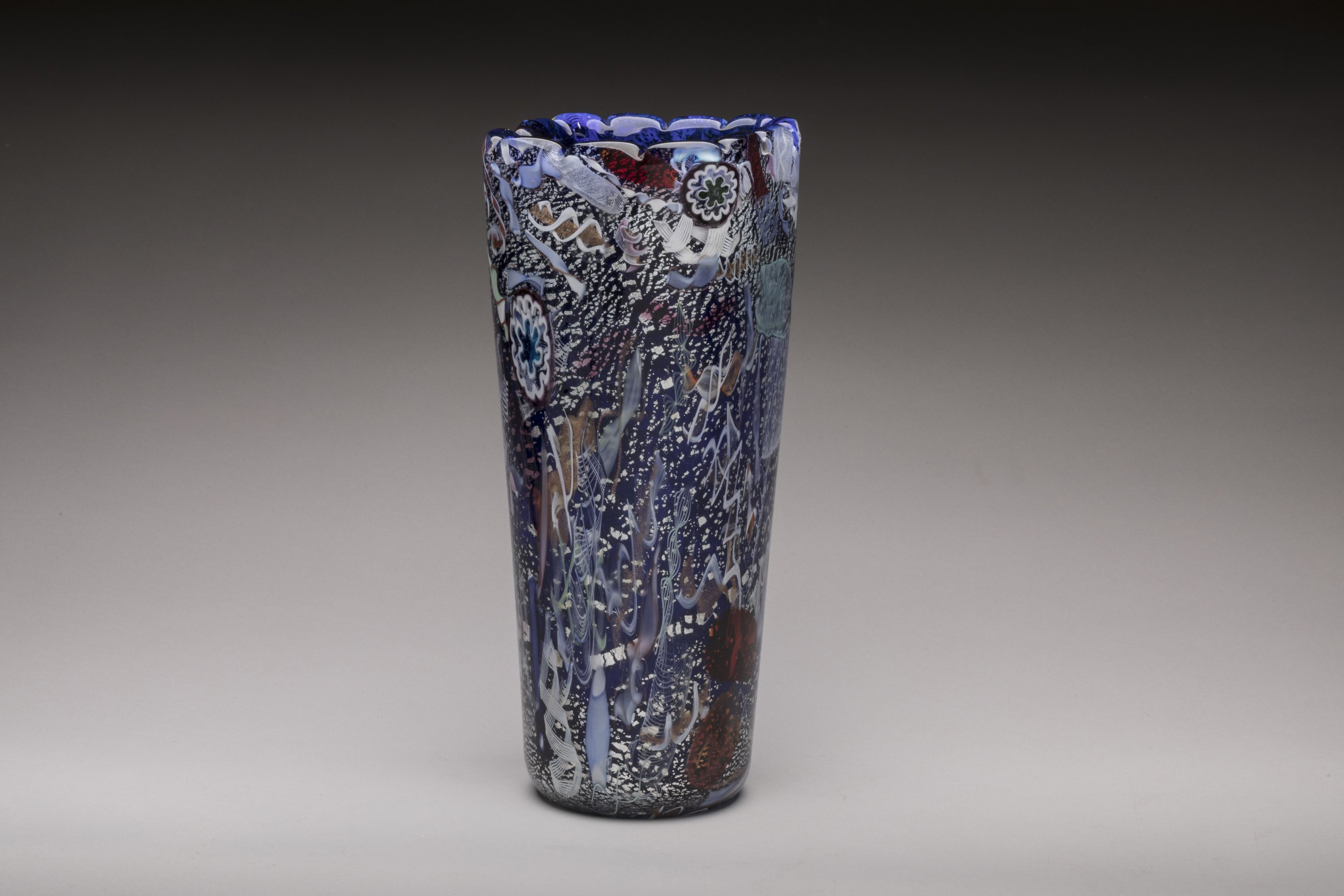 Le vase droit au col relevé à fond bleu paillé d'argent.