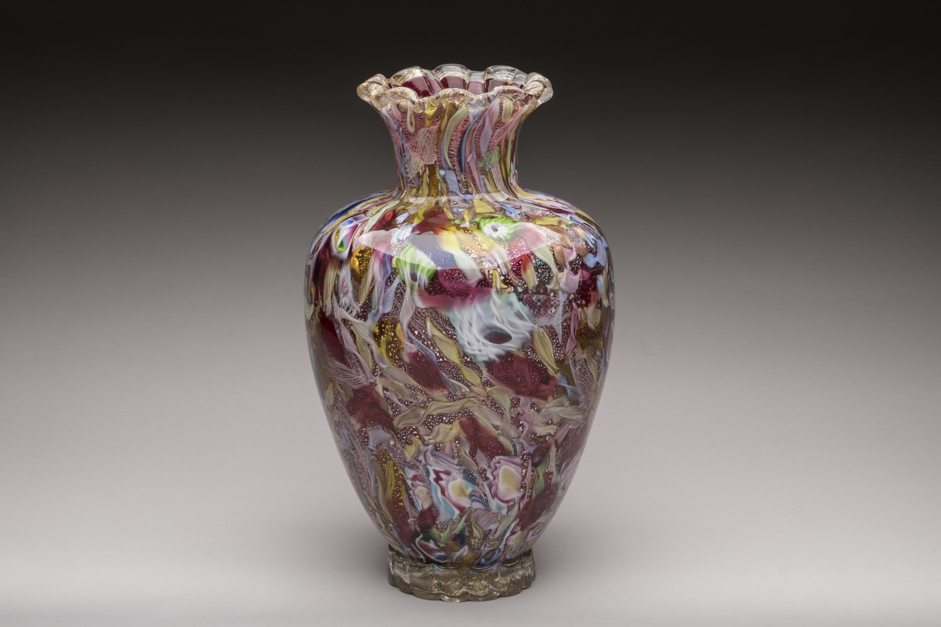 Le vase potiche au col pincé à fond rose paillé d'argent et de mika.