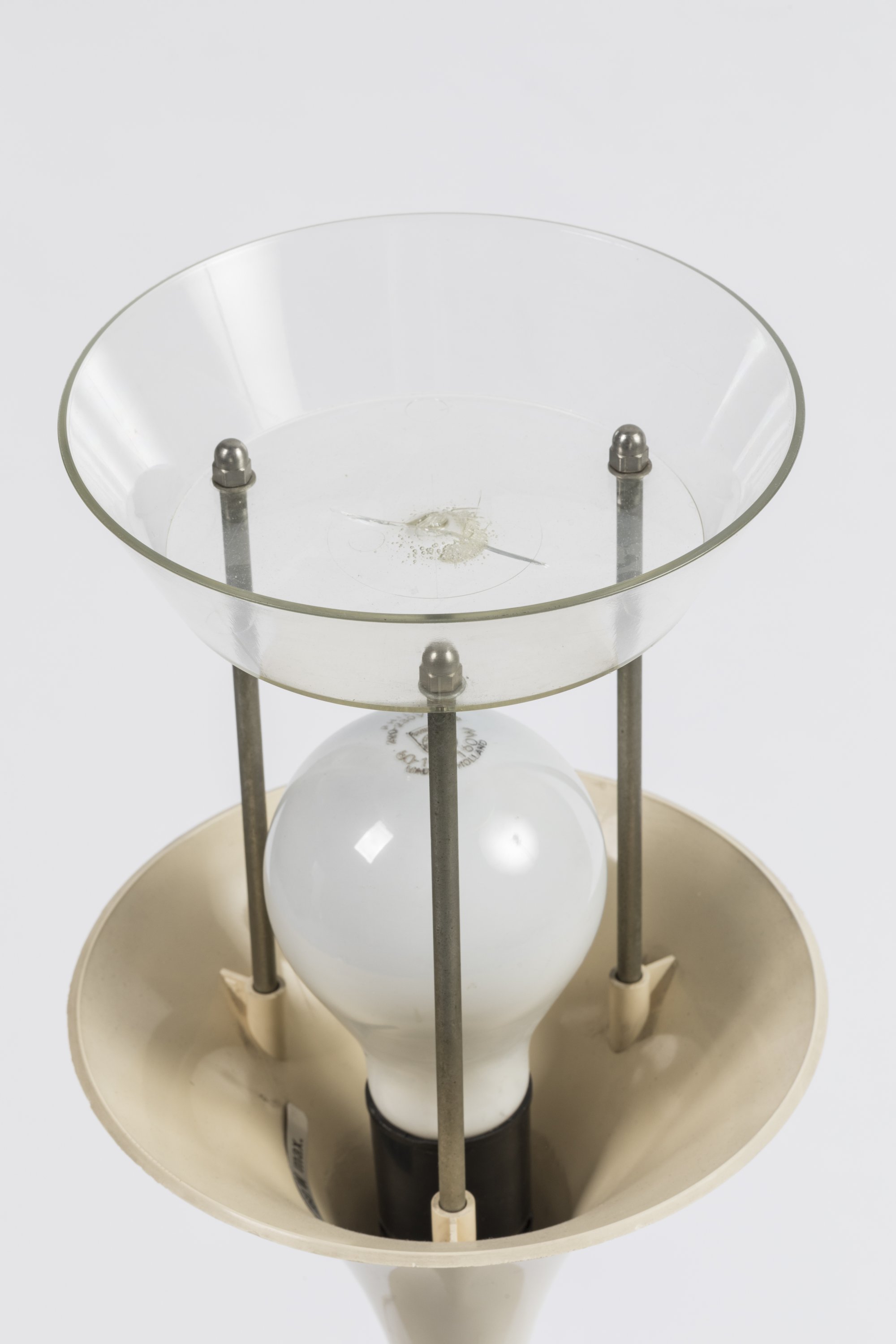 Plastique ABS blanc pour le pied et opalin pour l'abat-jour.