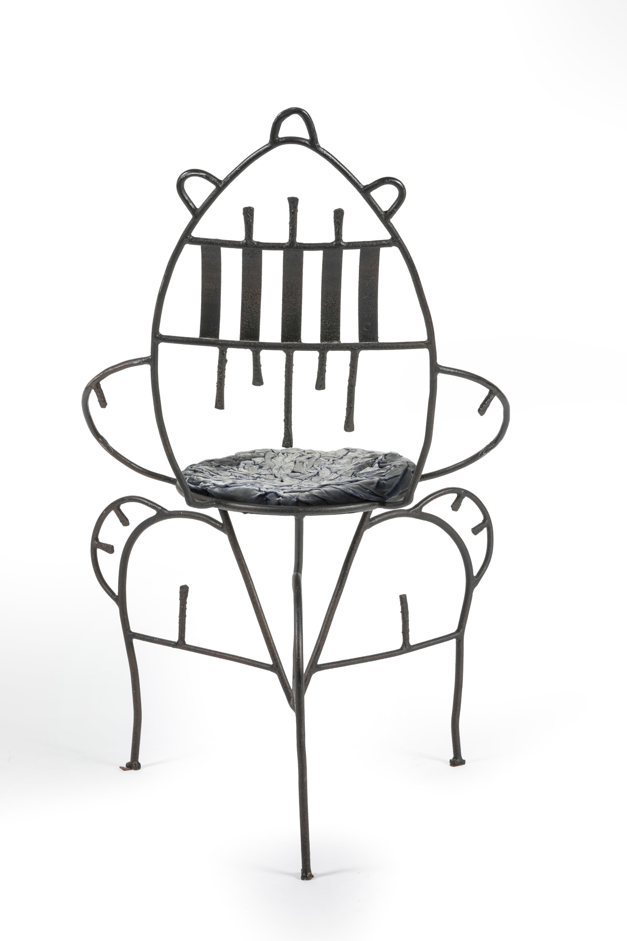 Fer forgé et son coussin bleu roi d'origine en velours et soie.