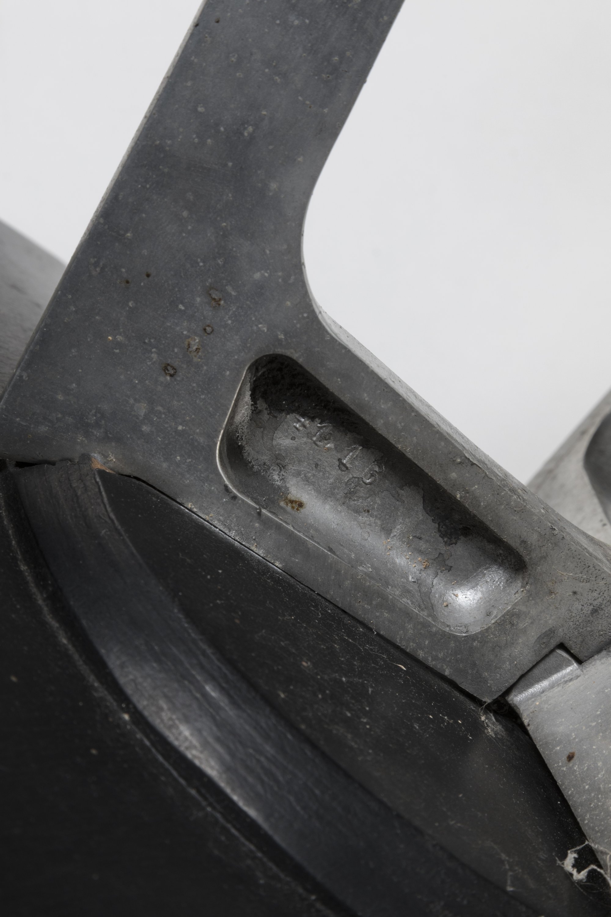 Assise et dossier en contreplaqué moulé, teinté, verni et piètement en aluminium.