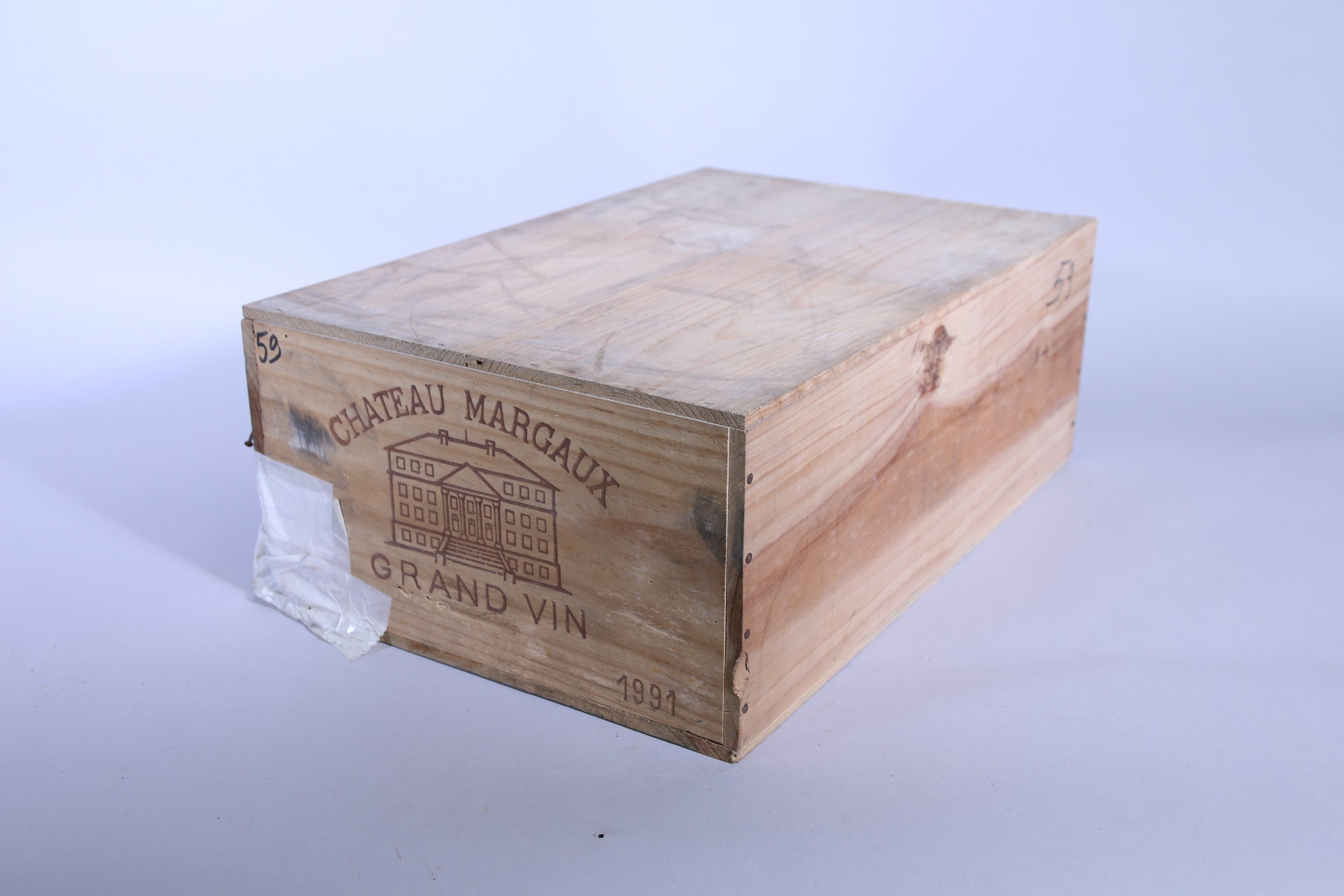 Margaux, Château Margaux, 1er Grand Cru classé, 1991, 12 bouteilles. Caisse en bois d'origine abimée (numérotation au feutre).