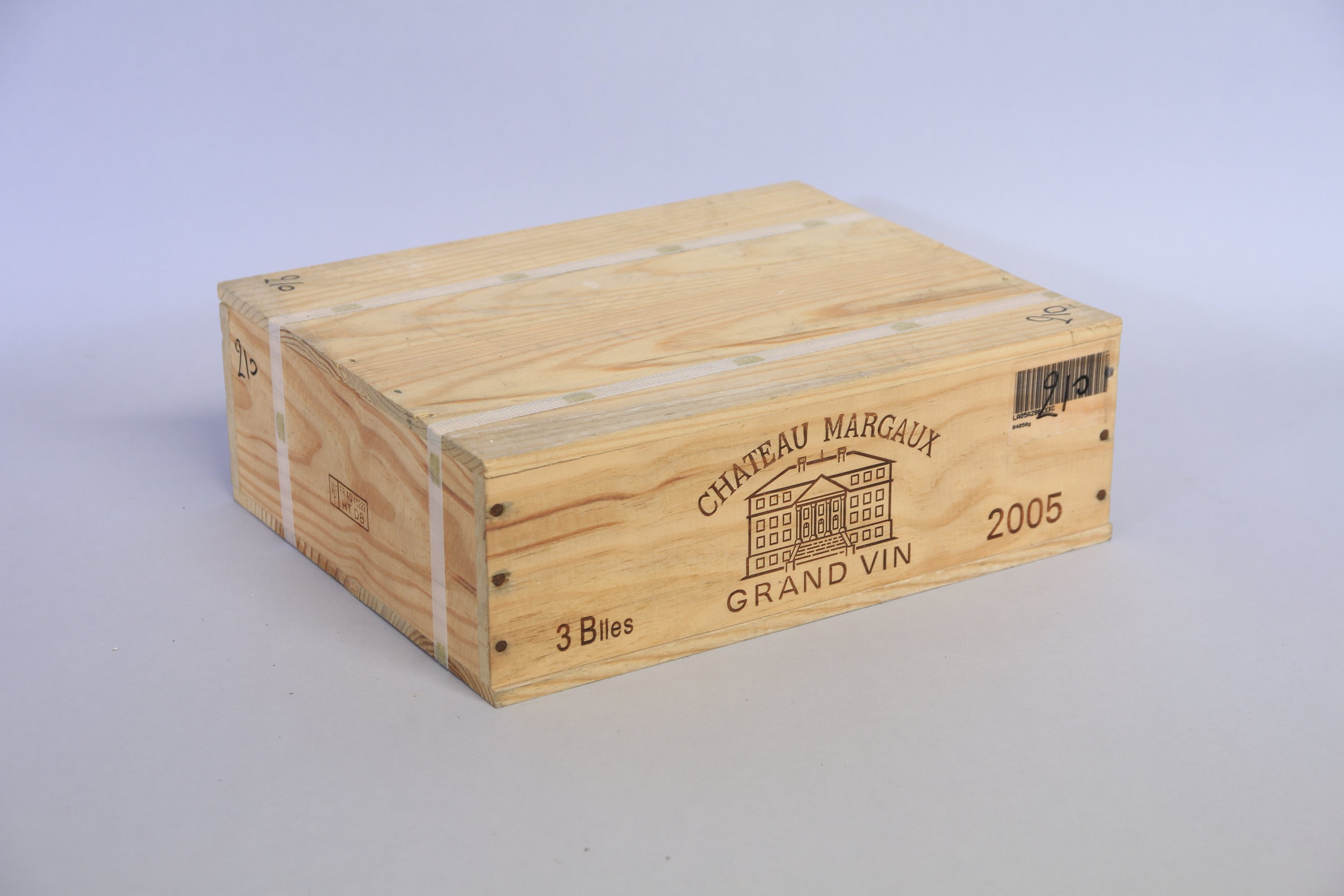 Margaux, Château Margaux, 1er Grand Cru classé, 2005, 3 bouteilles. Caisse en bois d'origine cerclée (numérotation au feutre).