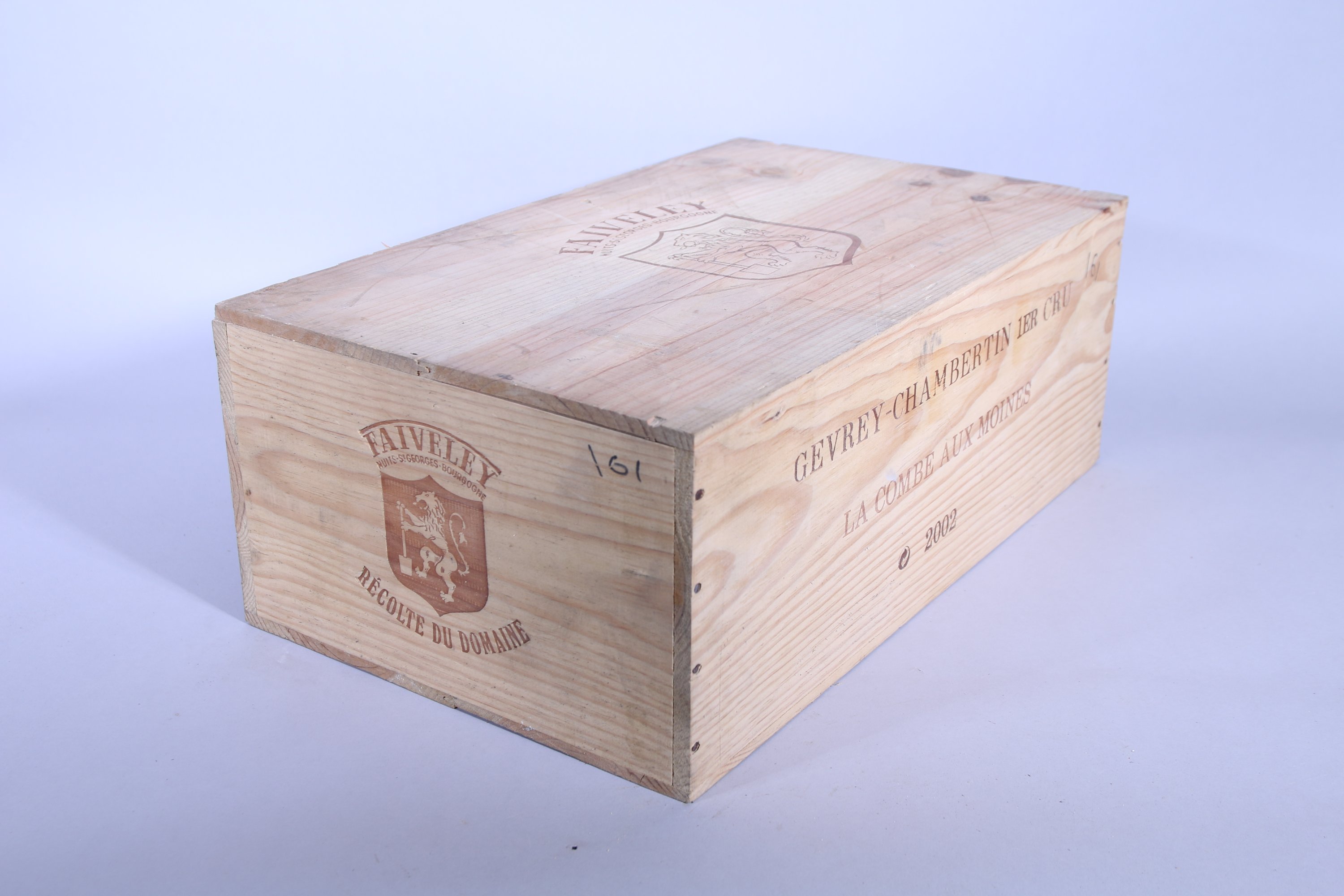 Gevrey-Chambertin, Domaine Faiveley, "La combe aux Moines", 2002, 12 bouteilles. Caisse en bois d'origine (numérotation au feutre).
