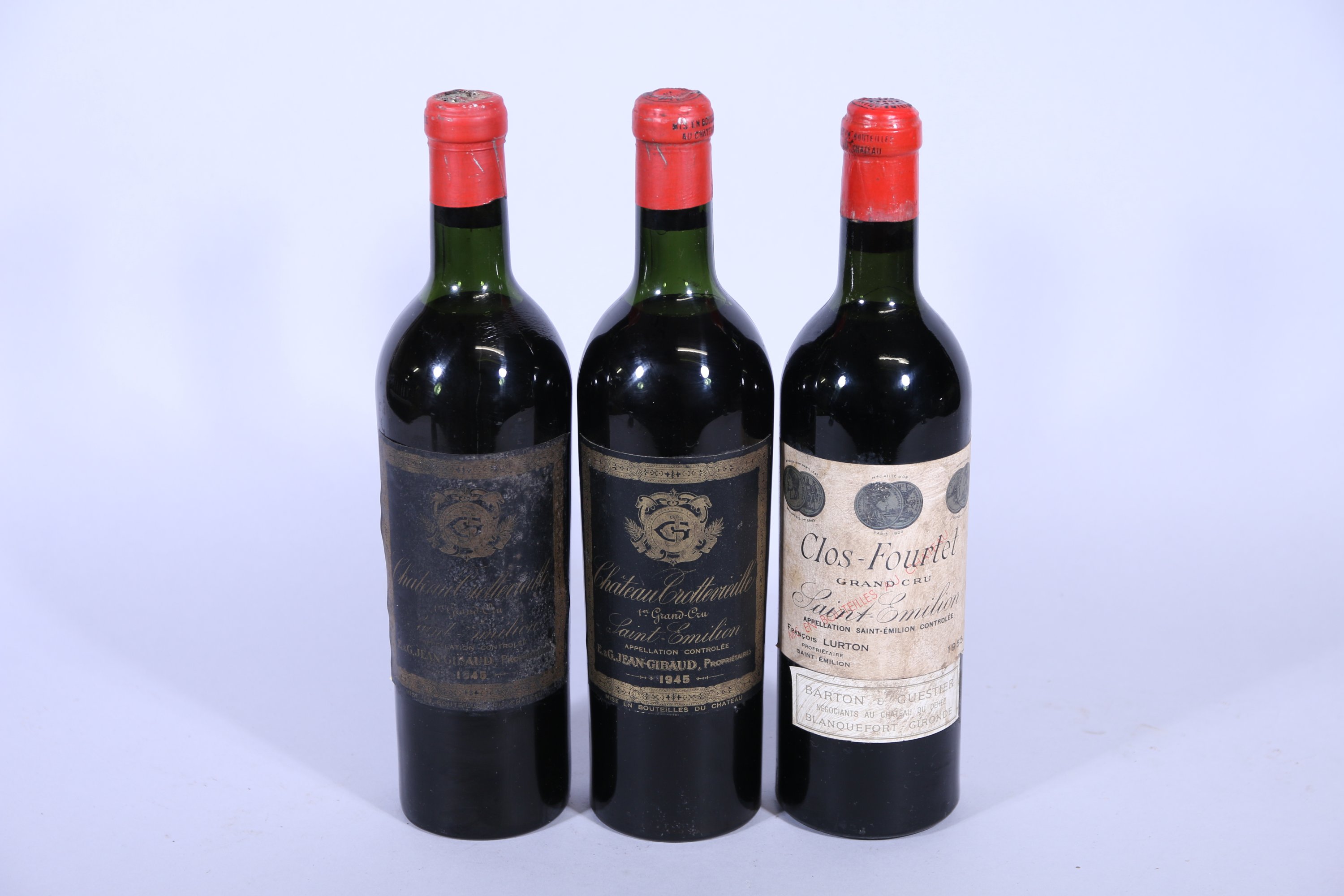 - Clos-Fourtet, 1er Grand Cru classé, 1955. Niveau : Haute épaule. Etiquette : sale. Capsule : légèrement déformée.