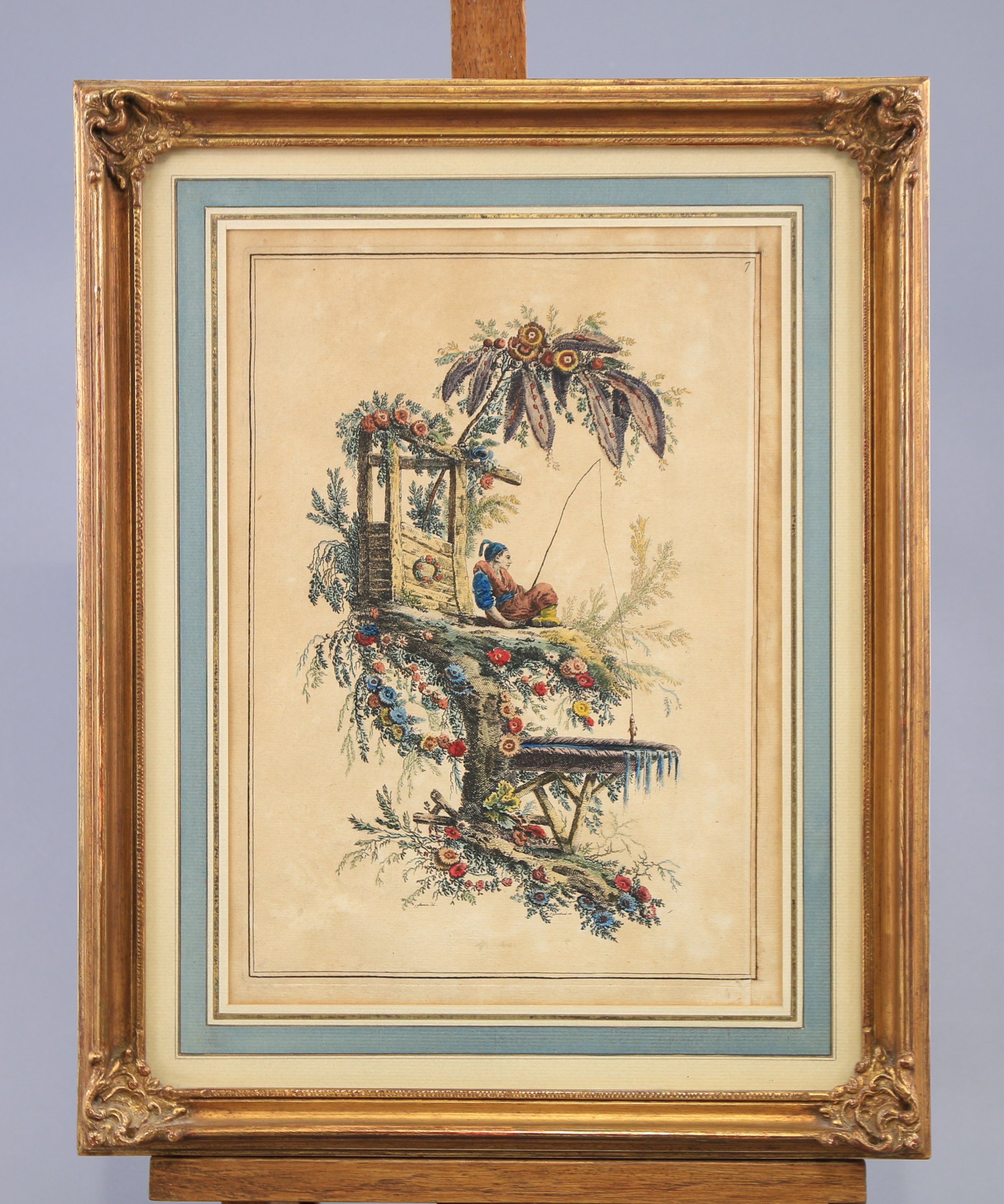 Joints : d'après Jean Pillement (Français, 1728-1808), Pêcheurs chinois, eau-forte avec coloris, condition et tirage similaire. Haut. 32 Larg. 22 cm. (insolation). Cadre de style rocaille. (Haut. 48 Larg. 38 cm).