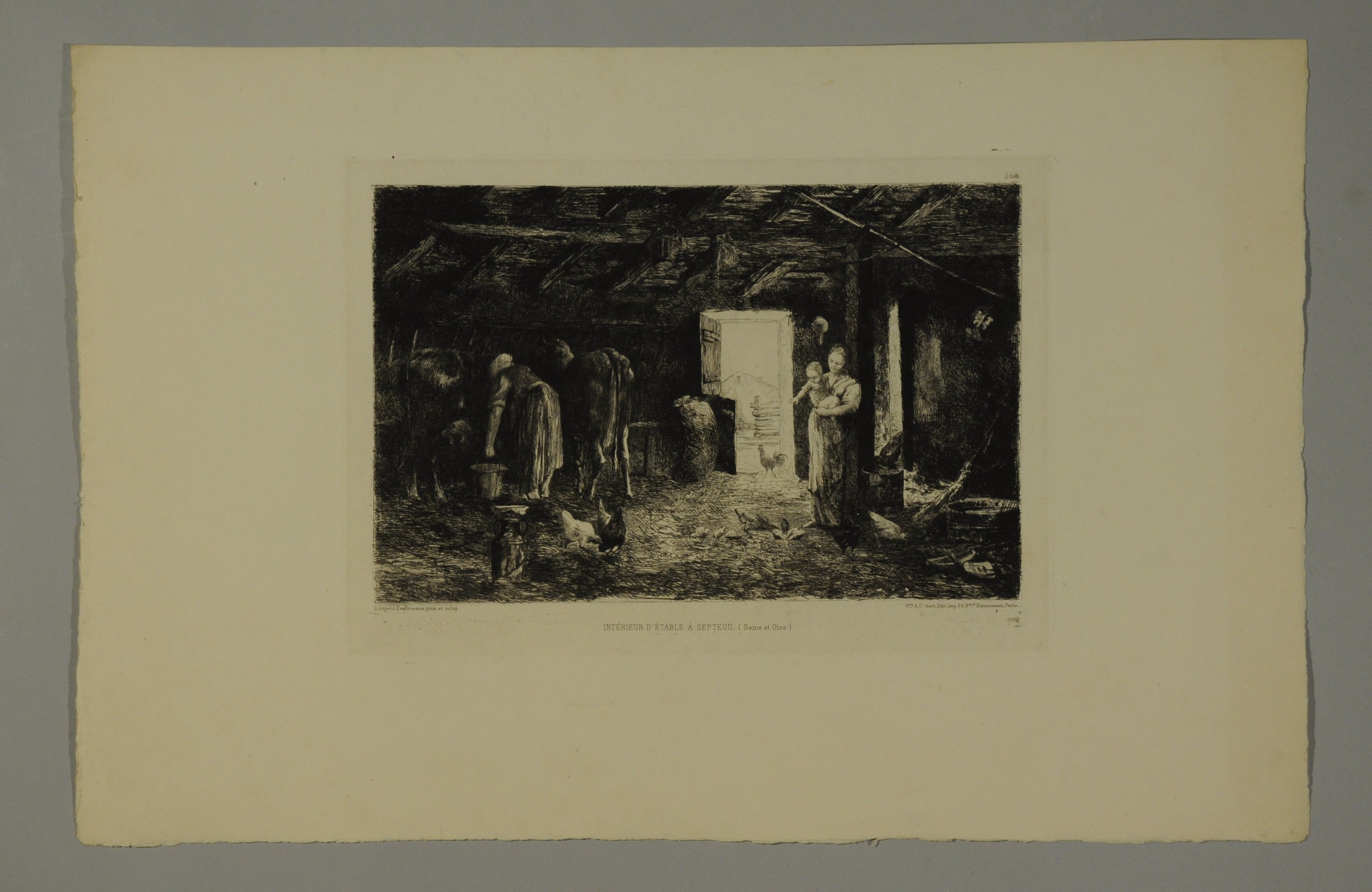 - Léopold Desbrosses (Français, 1821-1908), Intérieur d'étable à Septeuil. Eau-forte signée dans la planche. 48 x 31 cm.