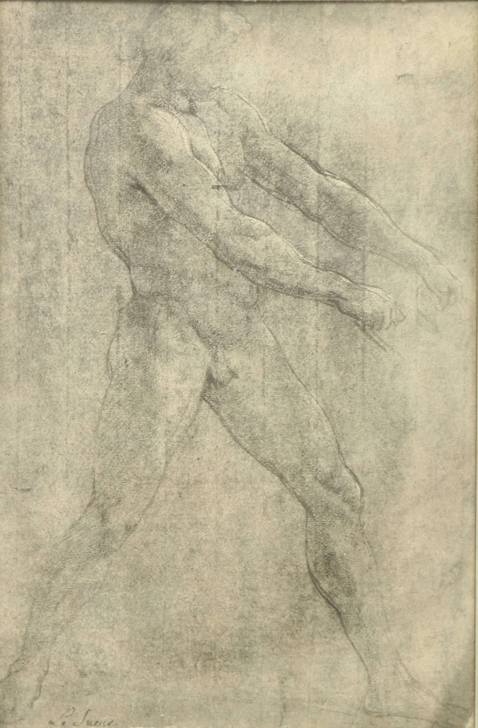 - Reproduction d’après LE SUEUR, Académie d’homme Haut. 36 Larg. 23,5 cm Cadre en stuc doré. Haut. 50 Larg. 37 cm., Reproduction d’un dessin conservé au Louvre