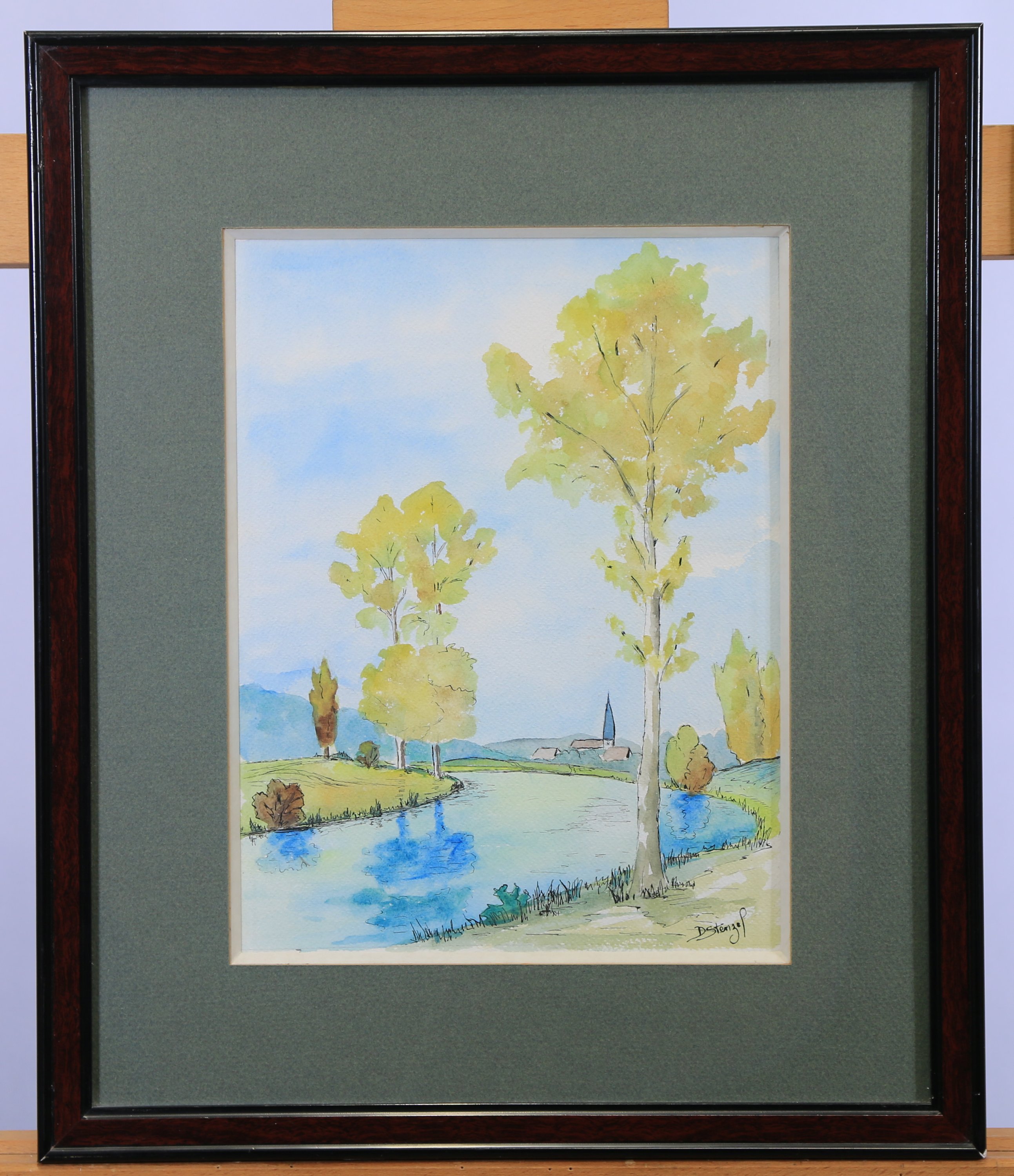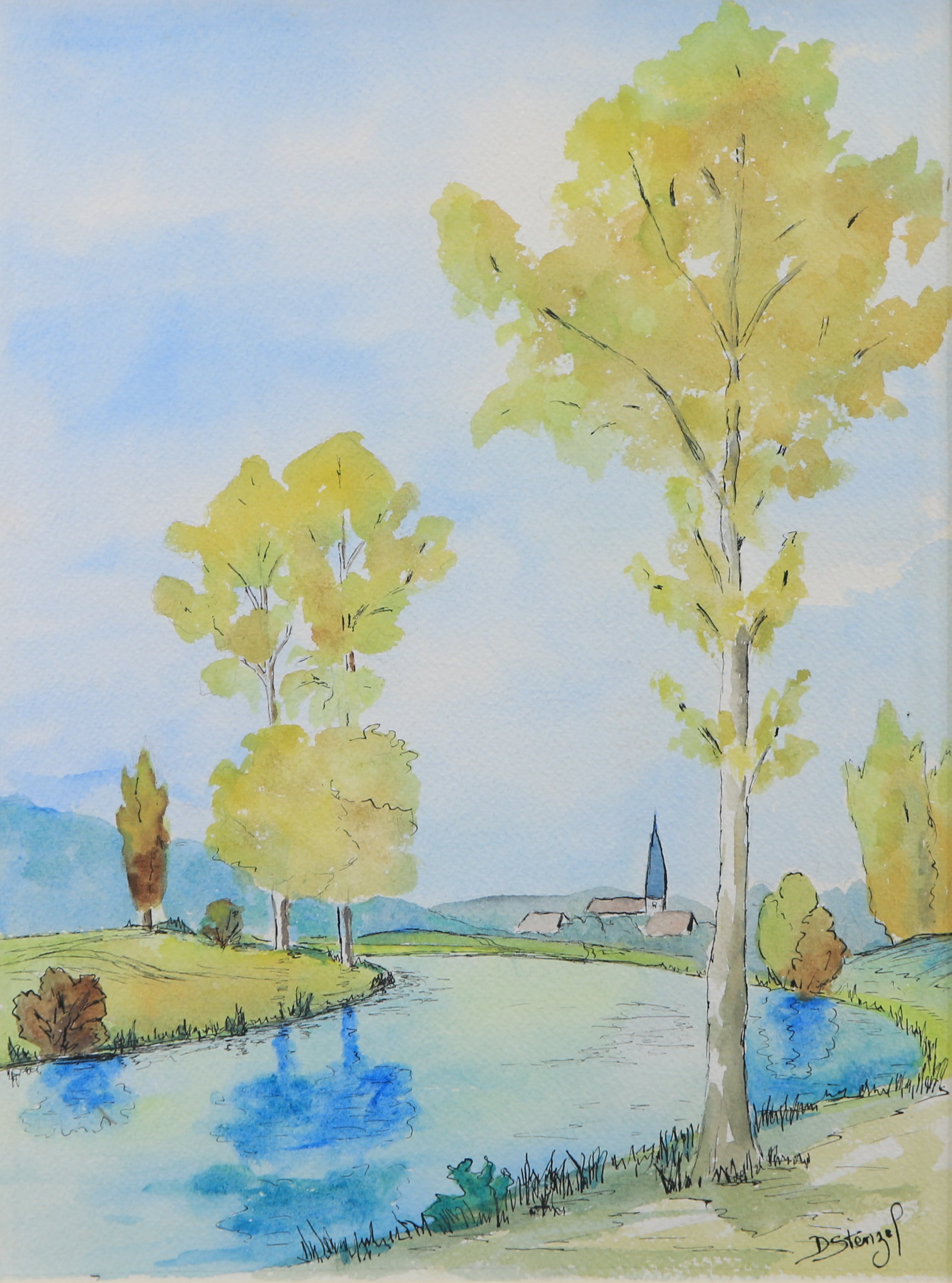 - Ecole du XXème siècle, Bord de rivière et Vue d'une chaumière. Aquarelles sur papier signées en bas à droite "D. Stenzel".
