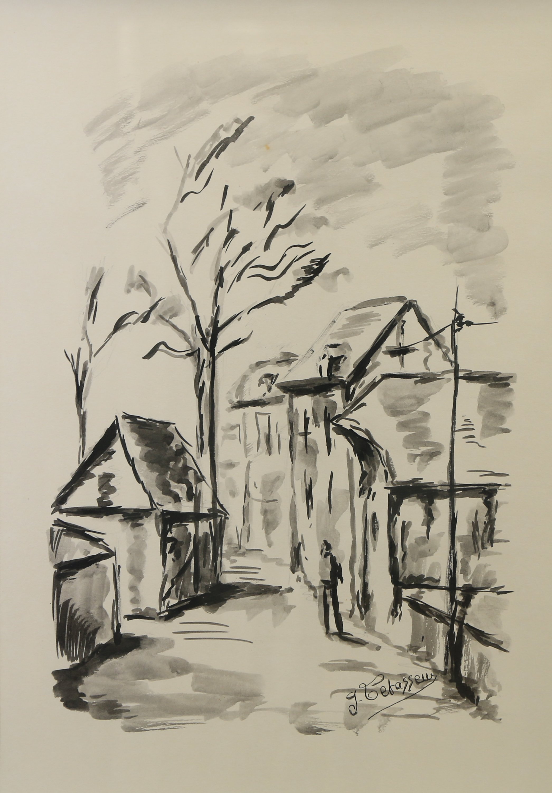 - Ecole du XXème siècle, Rue de village. Encre sur papier signée "J.Levasseur" en bas à droite.