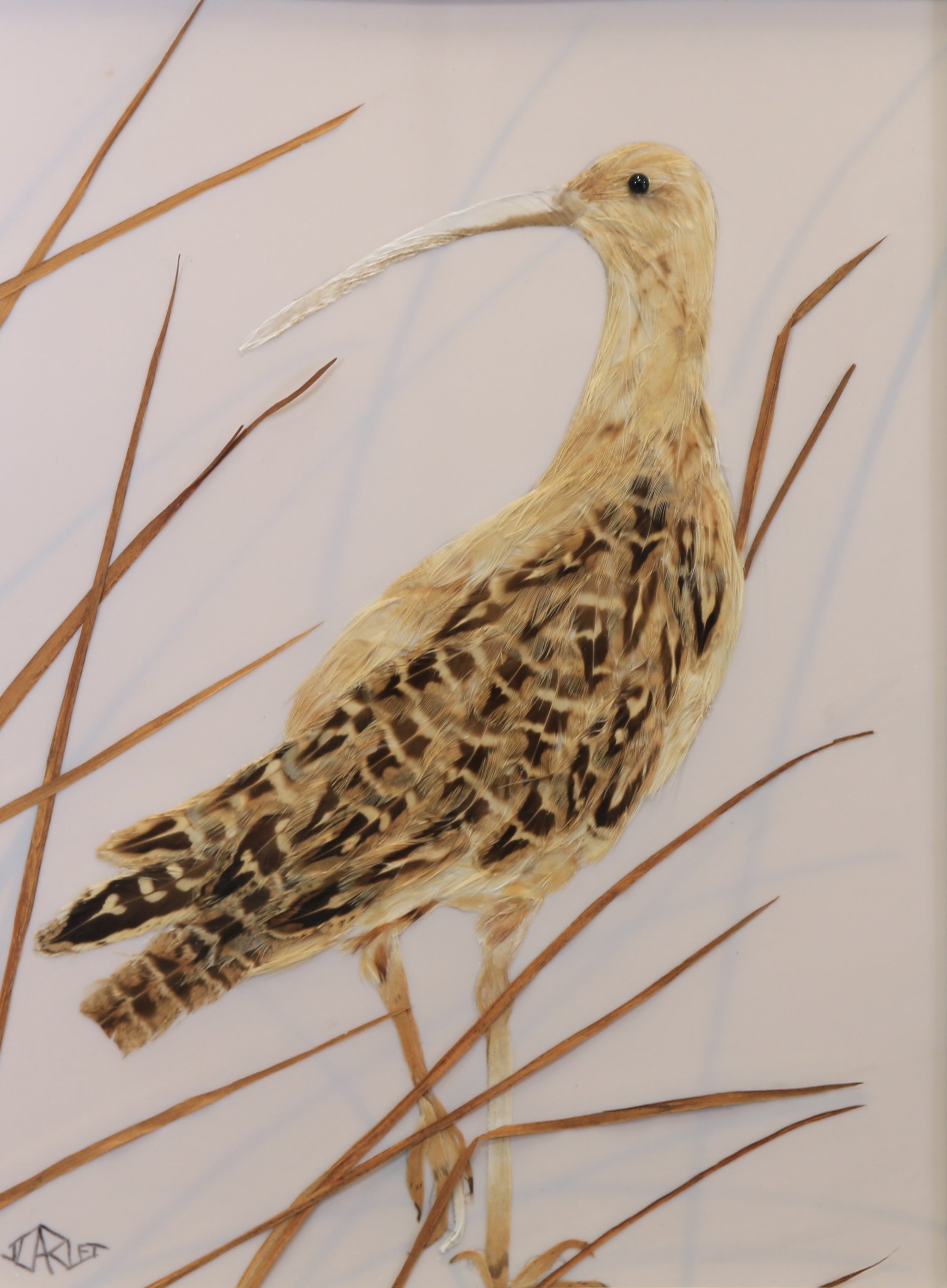 - Ecole du XXème siècle, La bécasse. Assemblage de plumes et herbes sur plexiglas. Signé en bas à gauche " J. Laclet". Haut. 30 Larg. 23 cm.