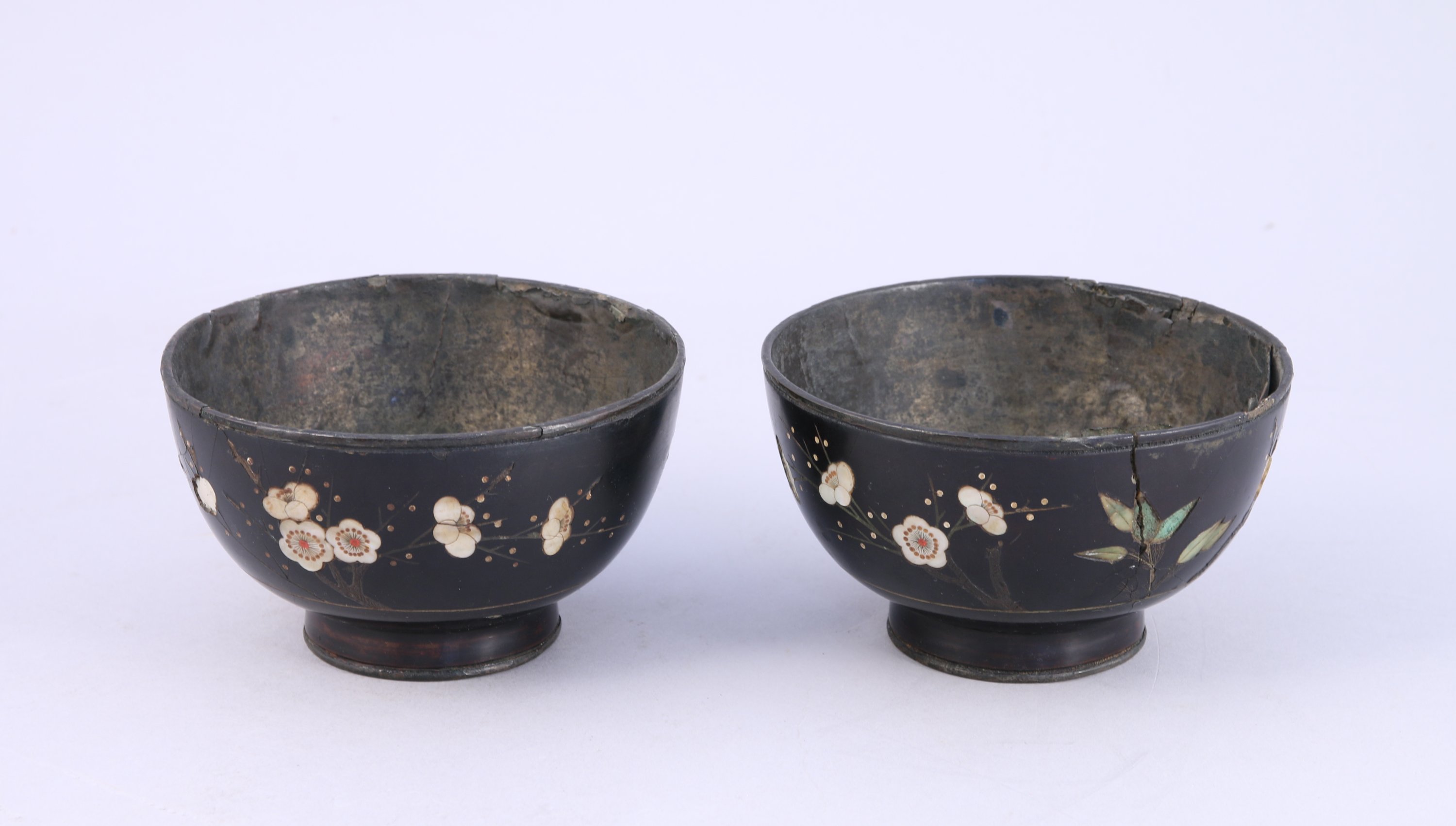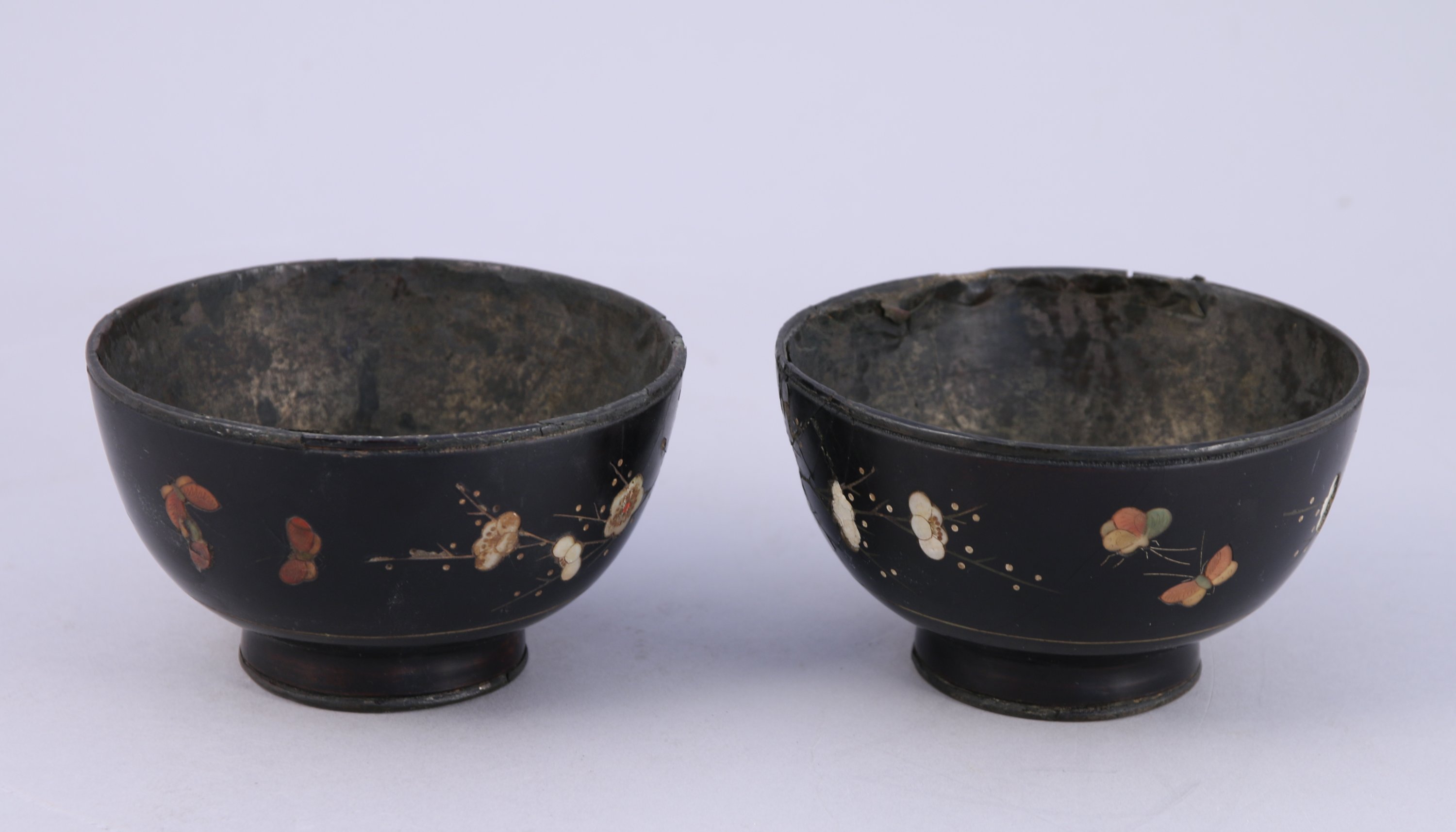 A décor incrusté de stéatite et nacre de branches de cerisiers en fleurs, papillons et bambous. L'intérieur avec une feuille d'argent.