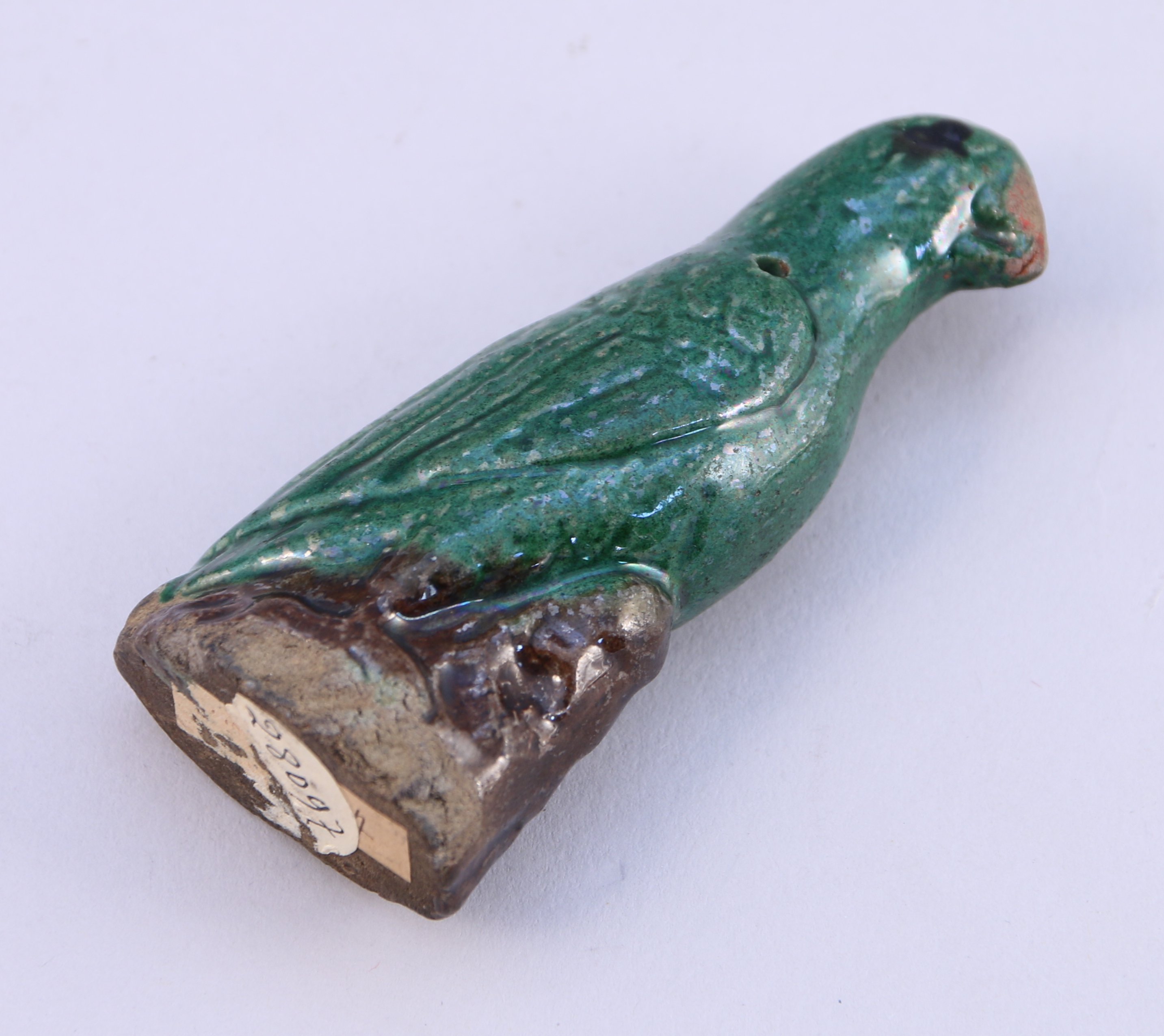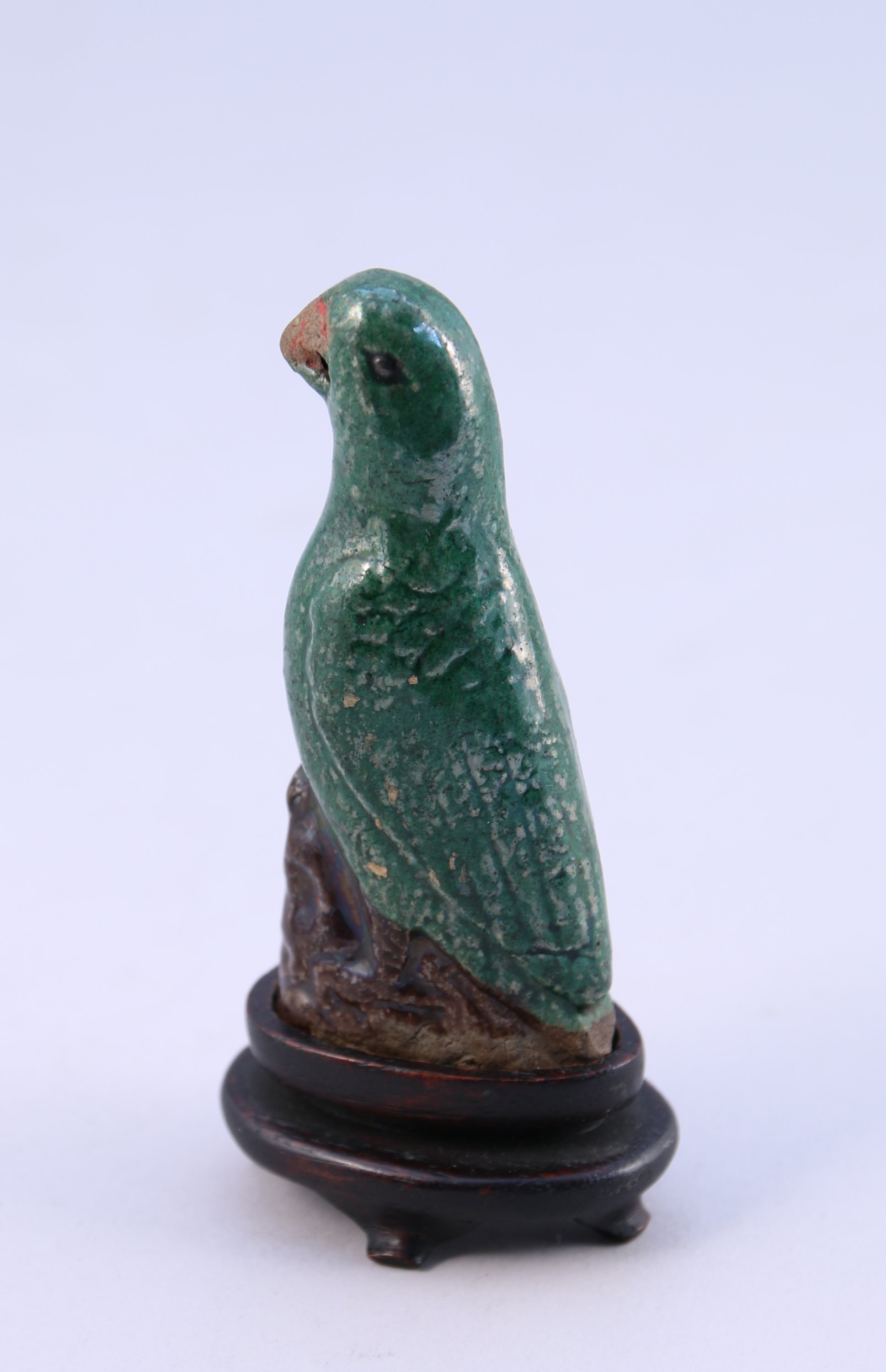 Joint : Chine, époque Kangxi (1662-1722). Petit perroquet en porcelaine émaillée vert et manganèse sur biscuit. Haut. 9 cm.