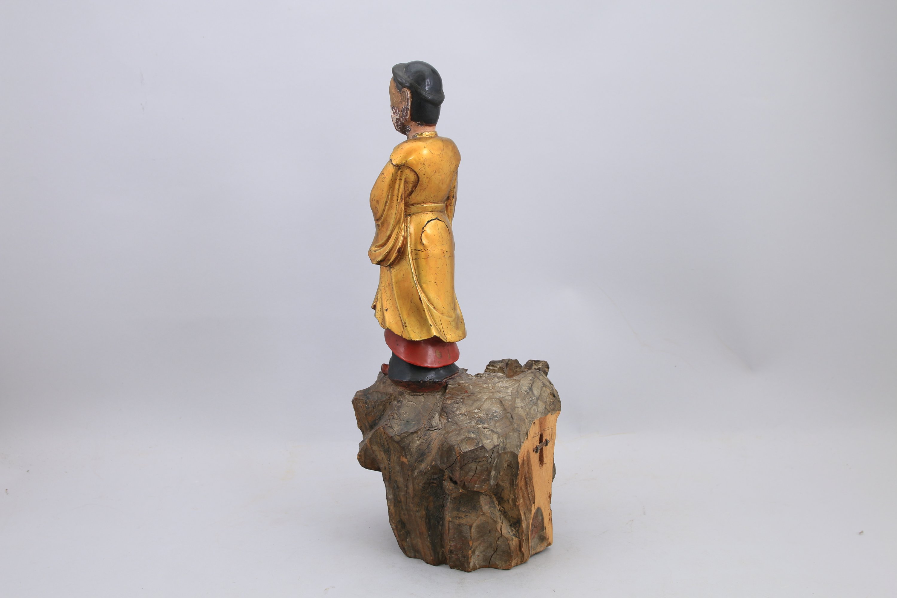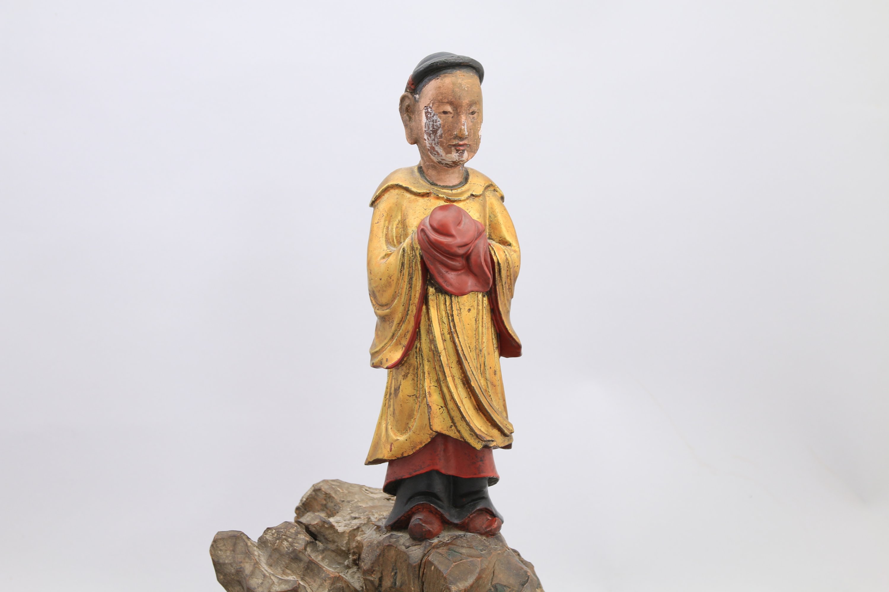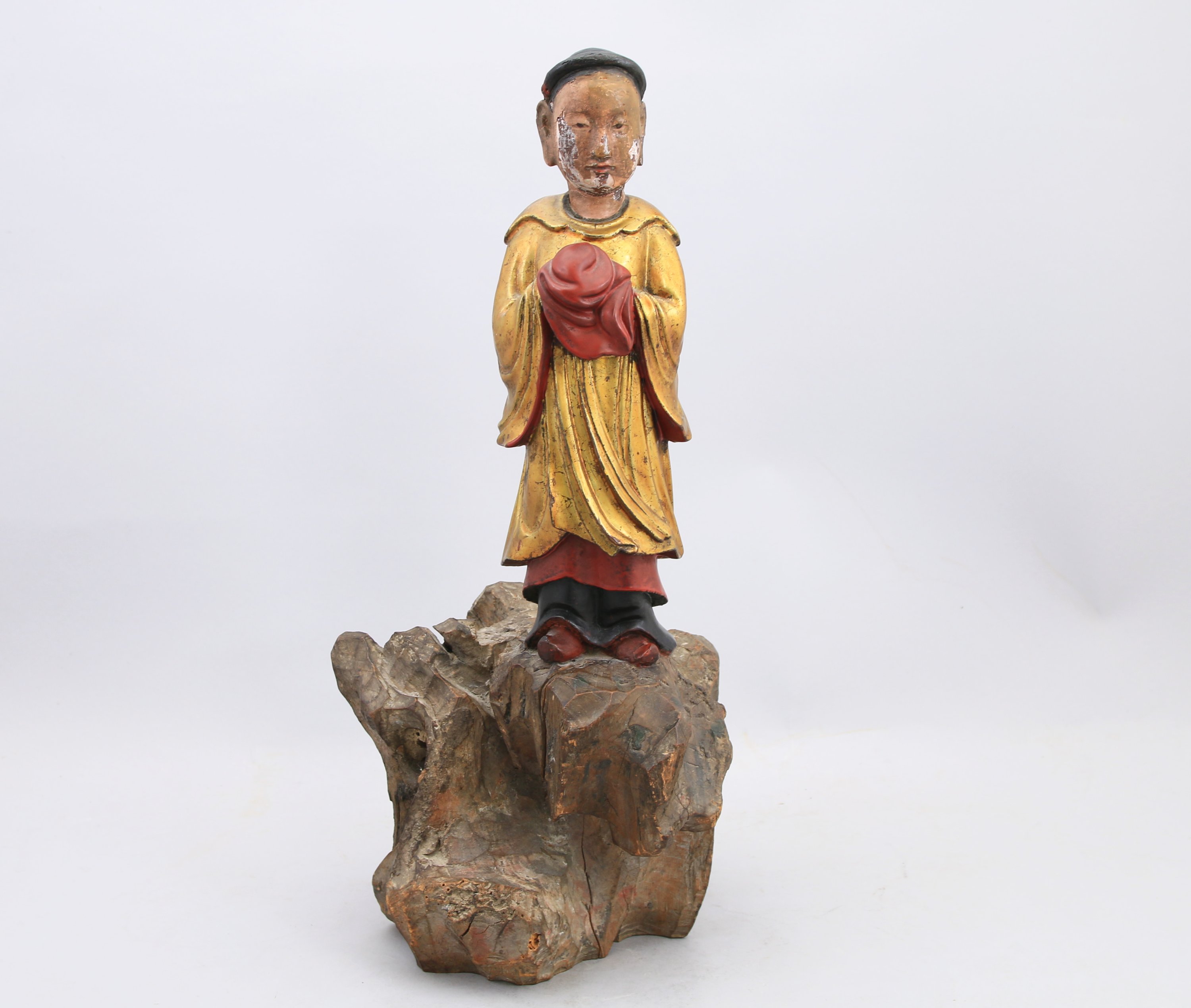 Attendant debout sur un rocher, ses robes flottant, tenant une offrande dans un tissu entre ses mains jointes.