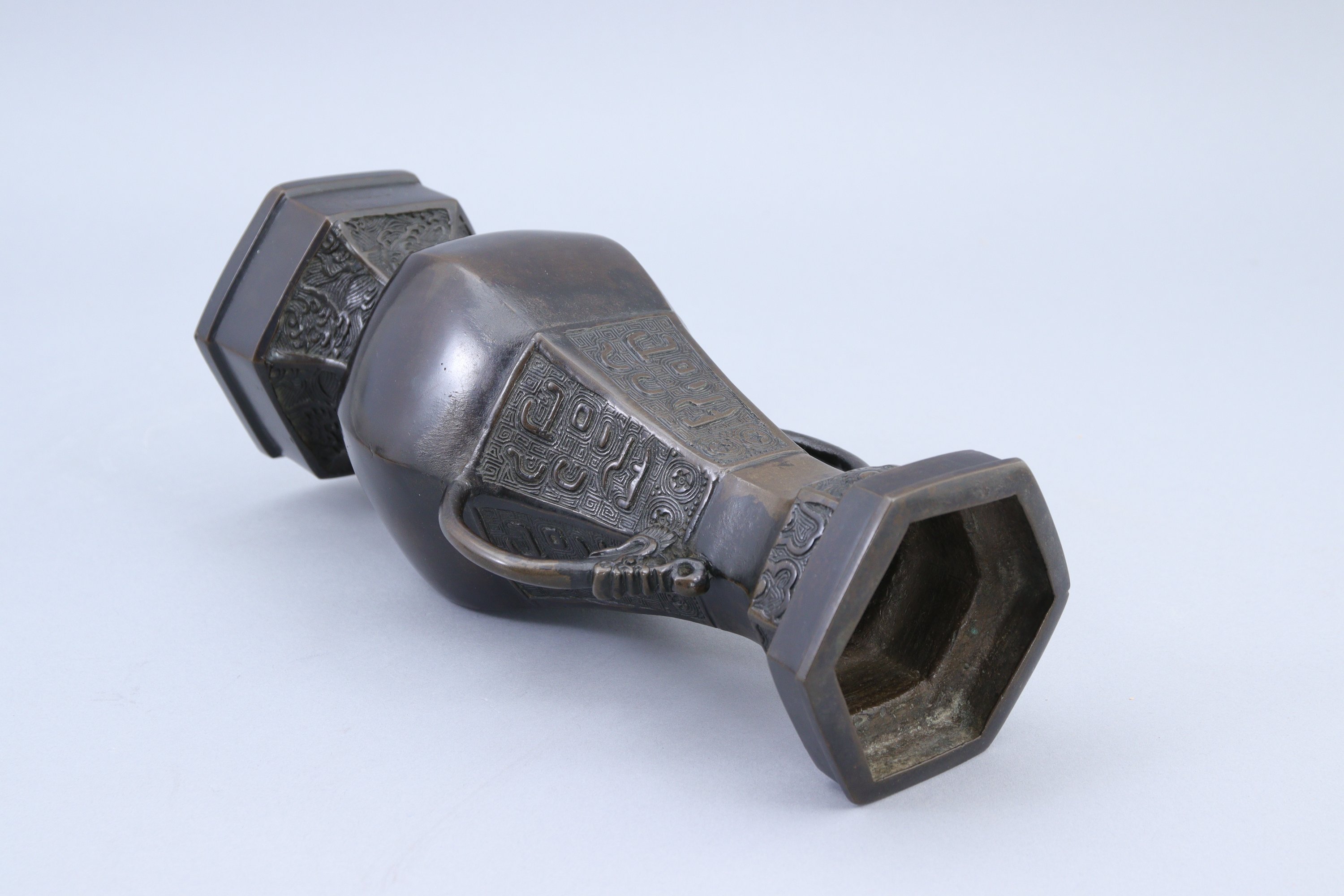 Ciselé de masques de taotie sur fond de leiwen, la partie inférieure ornée de vagues, les deux anses en forme de têtes de qilin.
