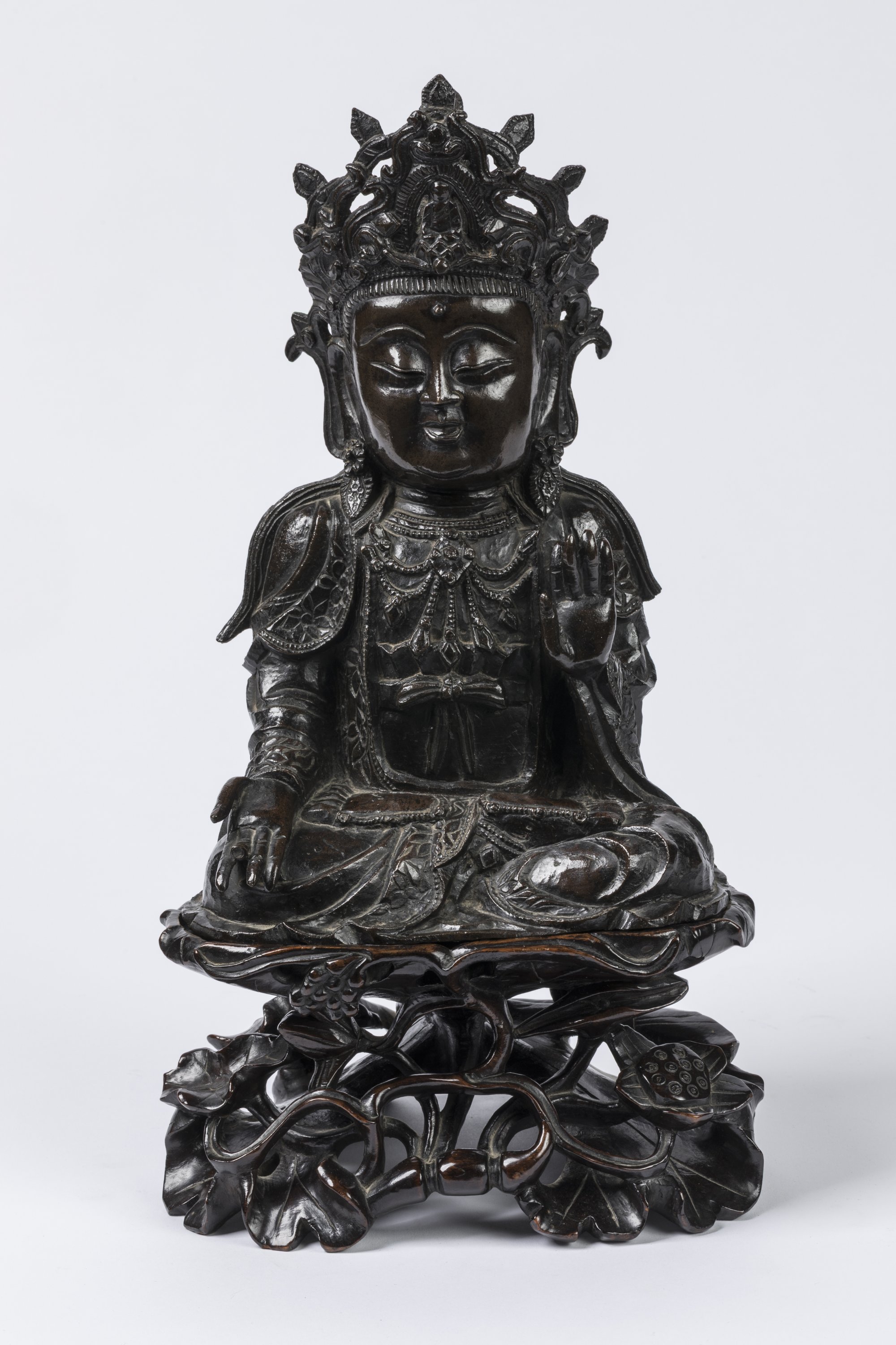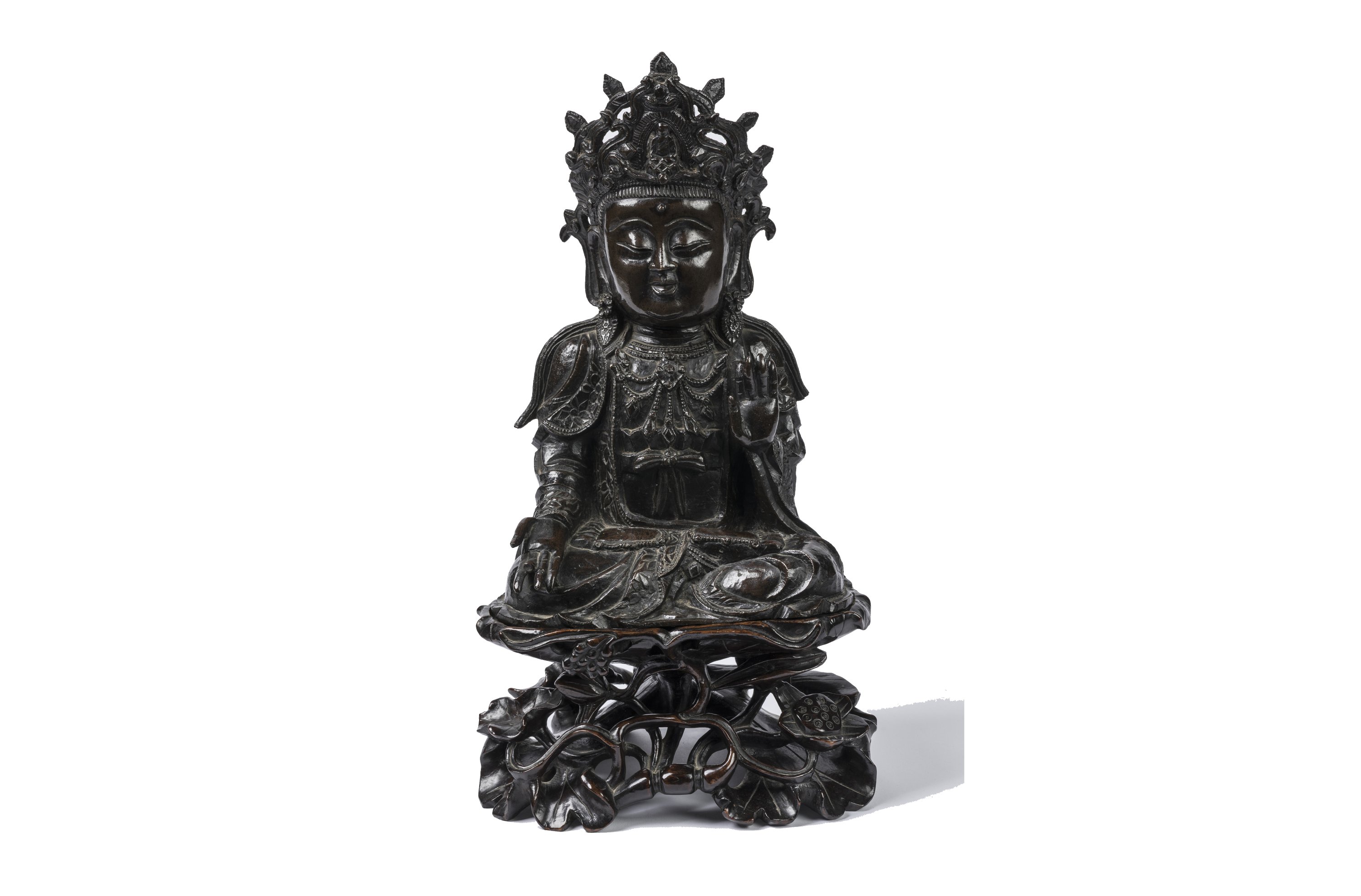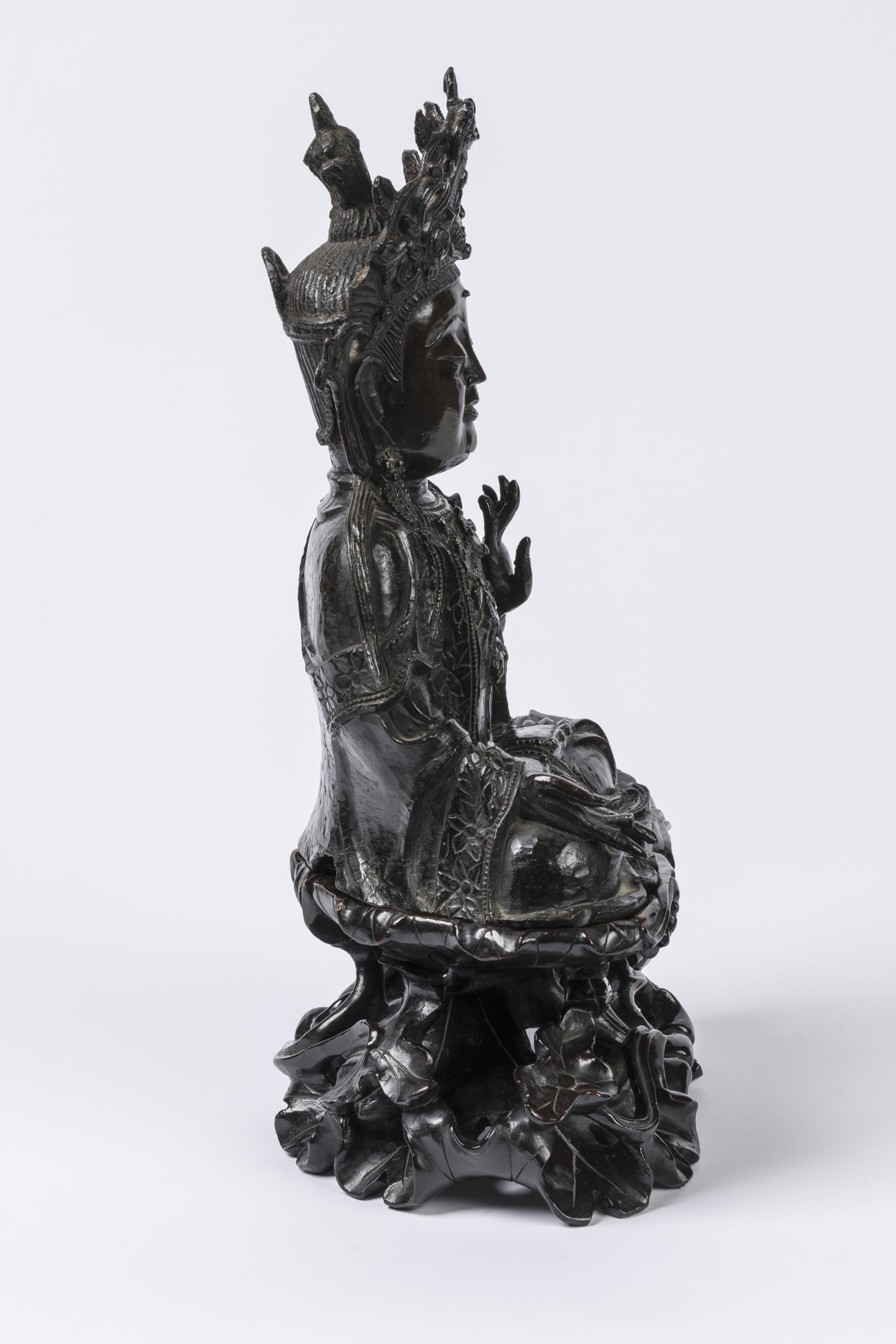 A Chinese bronze statue of Guanyin. On a carved wood base. Ming Dynasty.