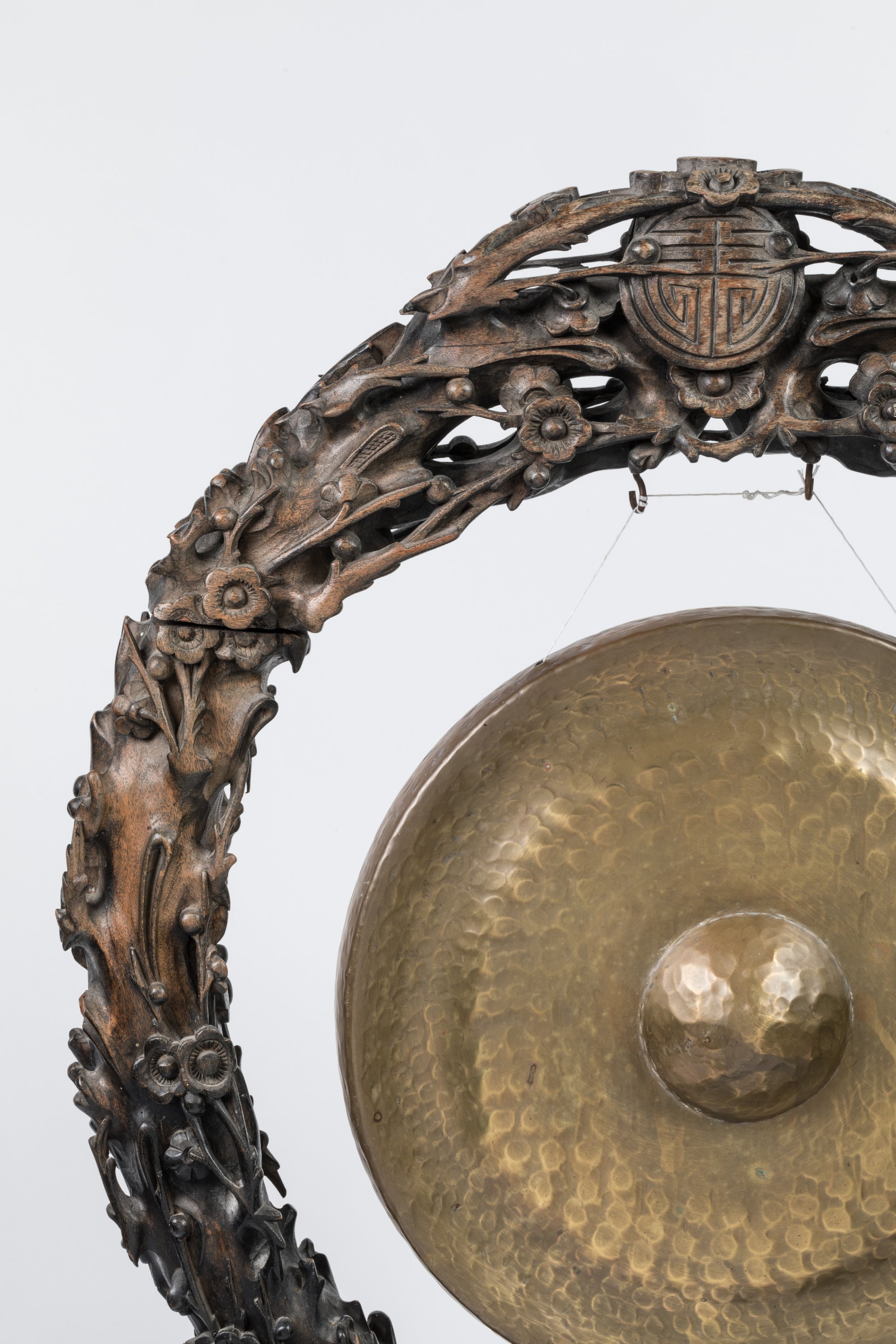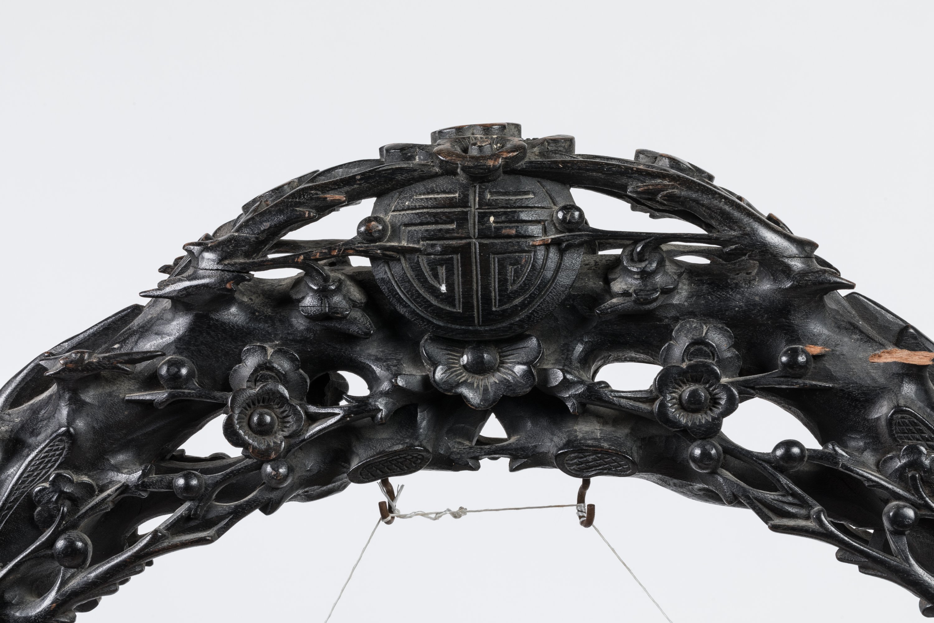 Montant en bois noirci sculpté de branches de prunier en fleurs entourant un caractère « shou ».