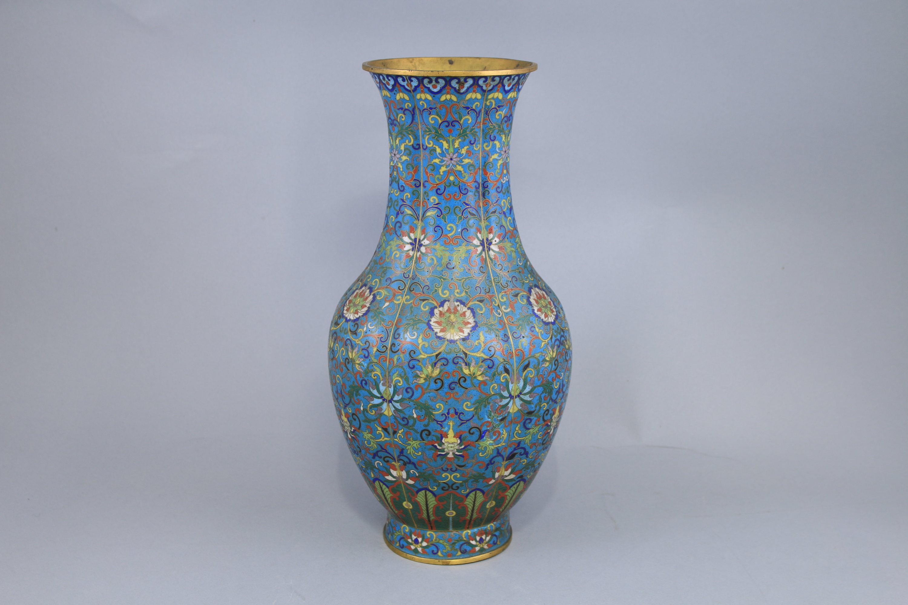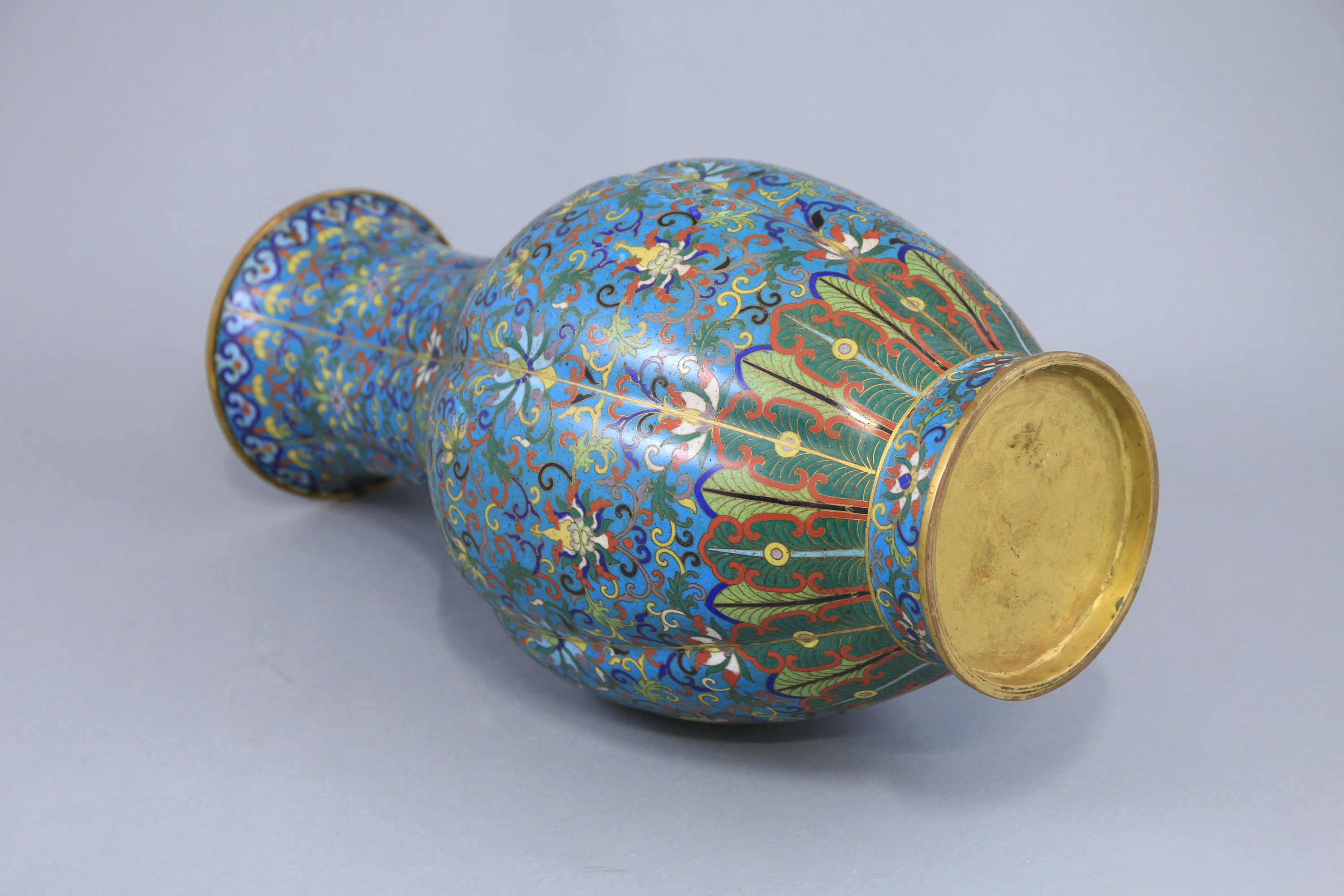 Bronze doré et émaux cloisonnés à décor de fleurs de lotus dans leur feuillage sur fond bleu turquoise.