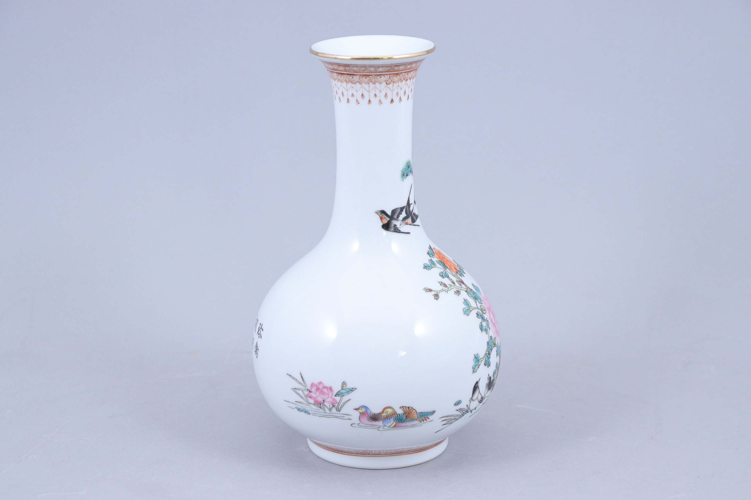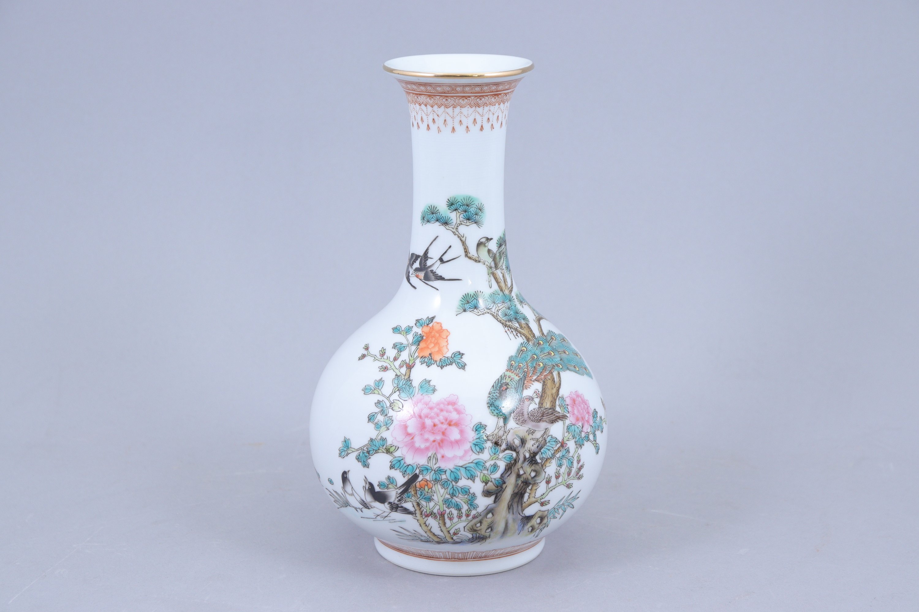 Porcelaine émaillée polychrome. A décor d'oiseaux volant parmi les pivoines et poèmes.