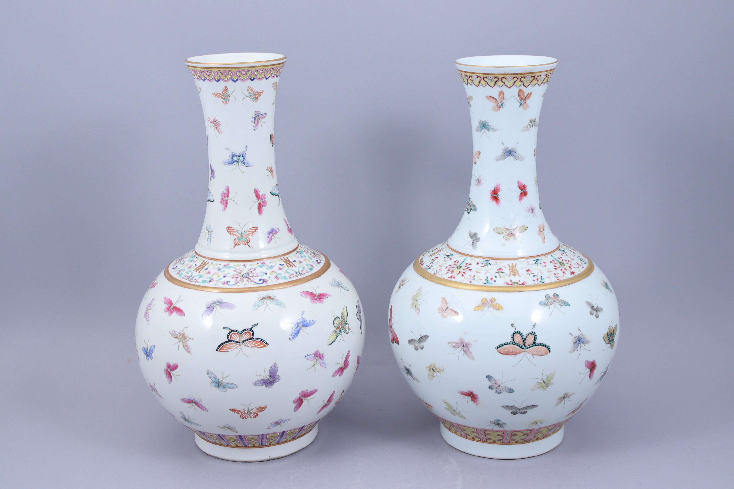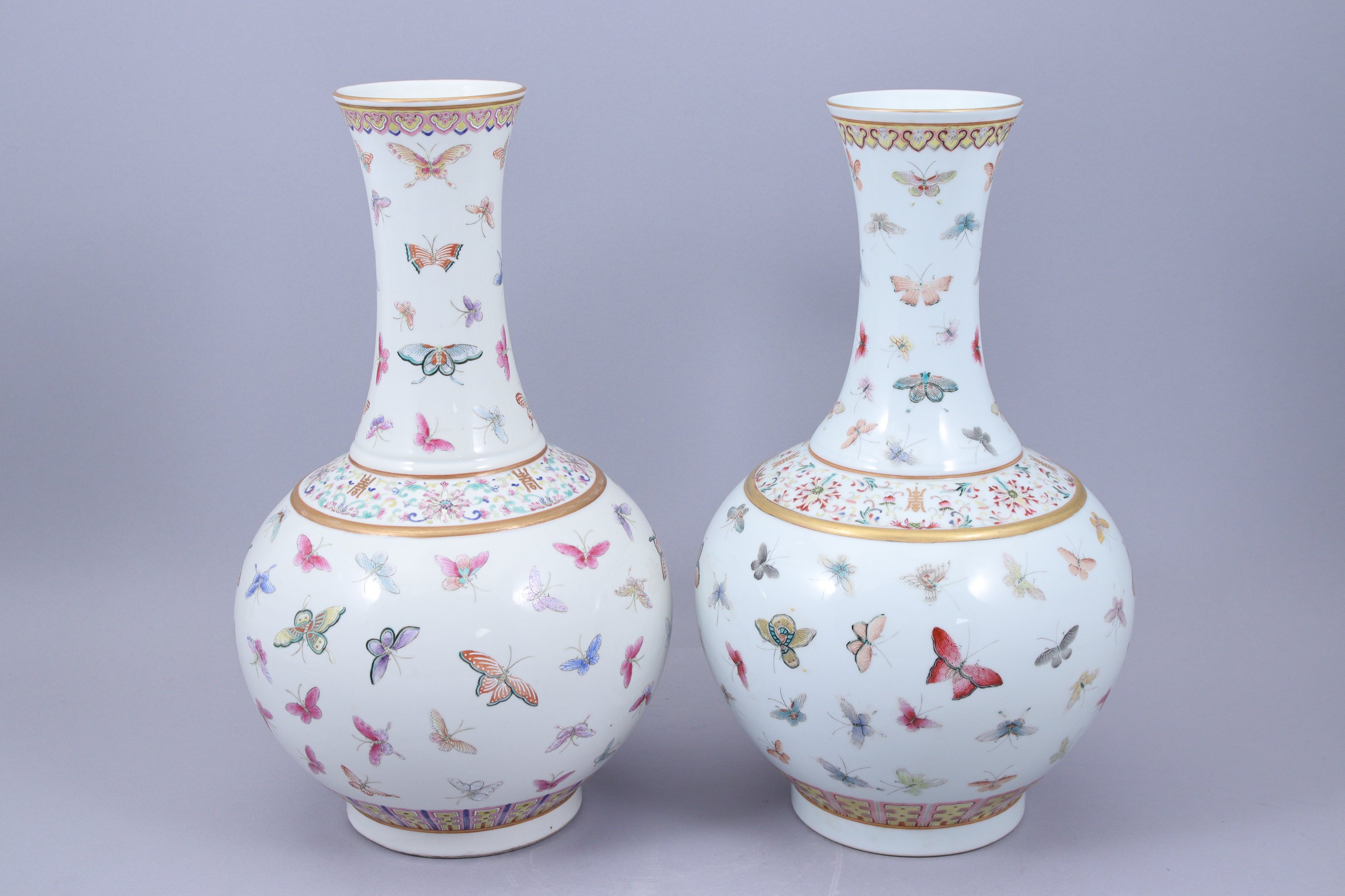 A décor émaillé polychrome et or de diverses espèces de papillons en vol, le pied à décor d'une frise de panneaux de lotus, l'épaule ornée d'une frise de fleurs de lotus et caractères 'shou' (longévité) stylisés dans des rinceaux feuillagés, la lèvre terminée par une frise de têtes de ruyi.
