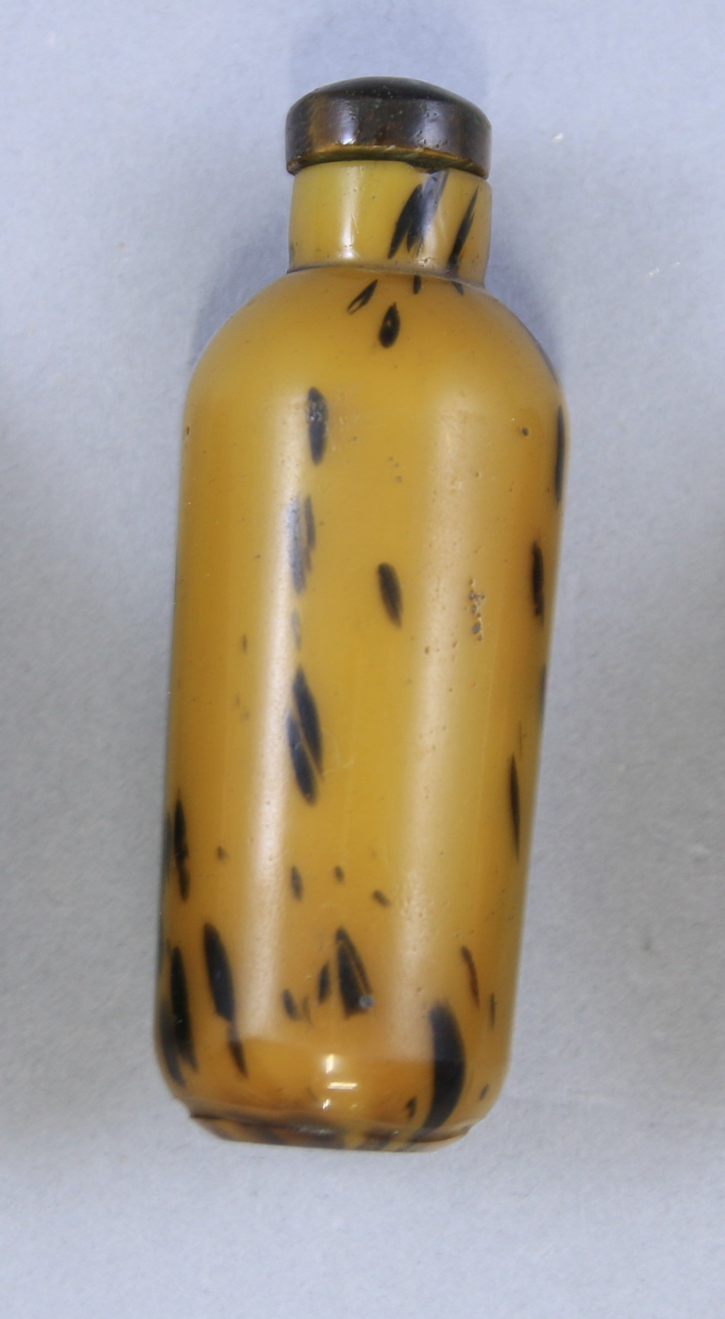 Joint : un flacon tabatière tubulaire en verre jaune translucide tacheté de brun. Bouchon en agate oeil-de-tigre. Haut. 7 cm. (éclats au col).