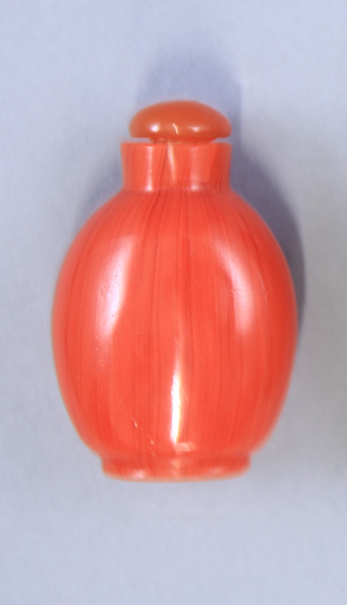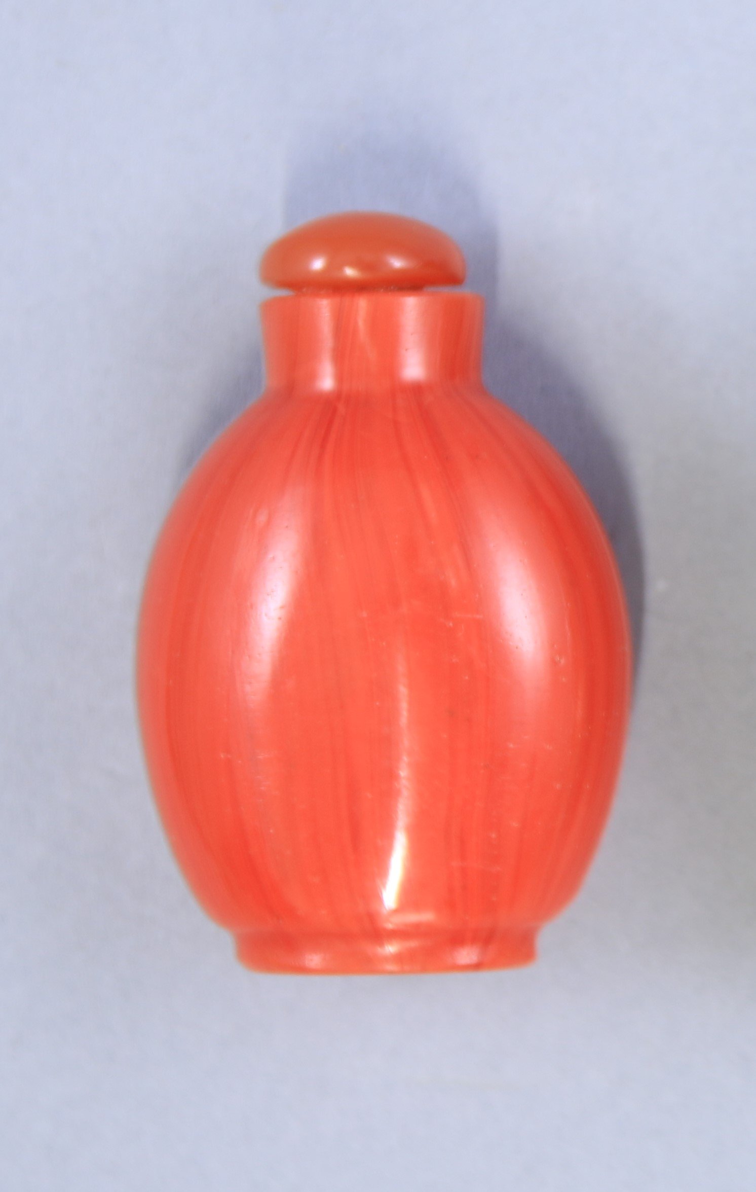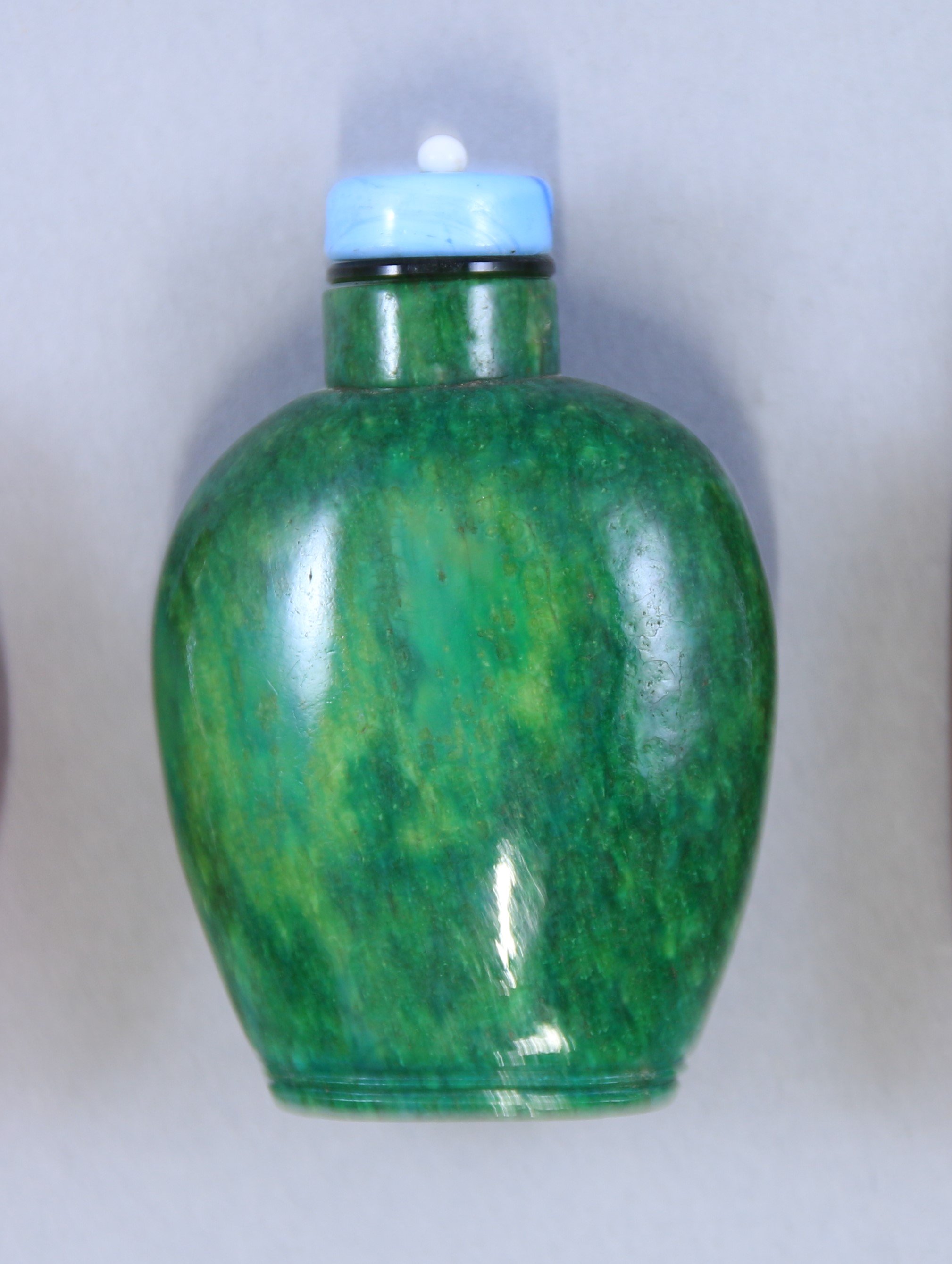 Joint : un flacon tabatière balustre en pierre dure verte. Bouchon en verre bleu ciel. XXe siècle. H. 6,2 cm.