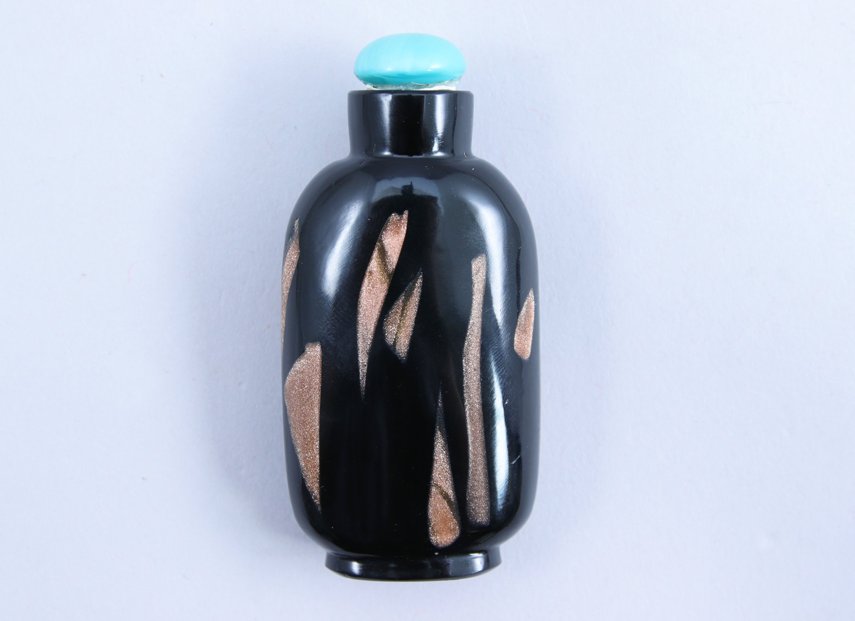 - Flacon tabatière rectangulaire à col droit en verre noir parsemé d'inclusions d'aventurine. Bouchon en verre turquoise. Haut. 7,1 cm. (décollé de la pelle)