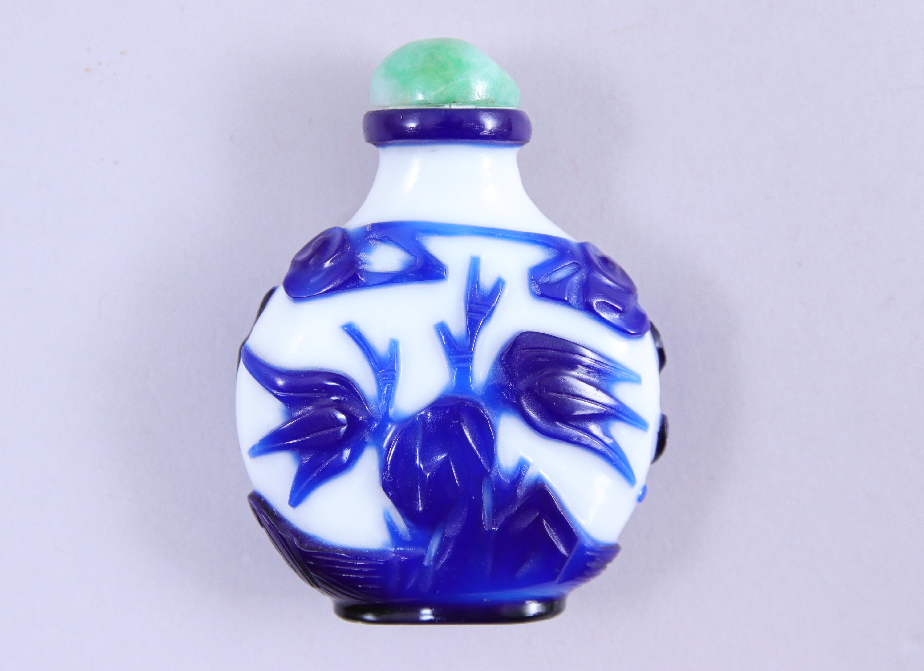 - Flacon tabatière arrondi à col ouvert en verre overlay bleu foncé sur fond blanc opaque, à décor stylisé de rochers, bambou et chauve-souris en vol. Bouchon en jadéite. Haut. 5,9 cm. (manque de pelle)
