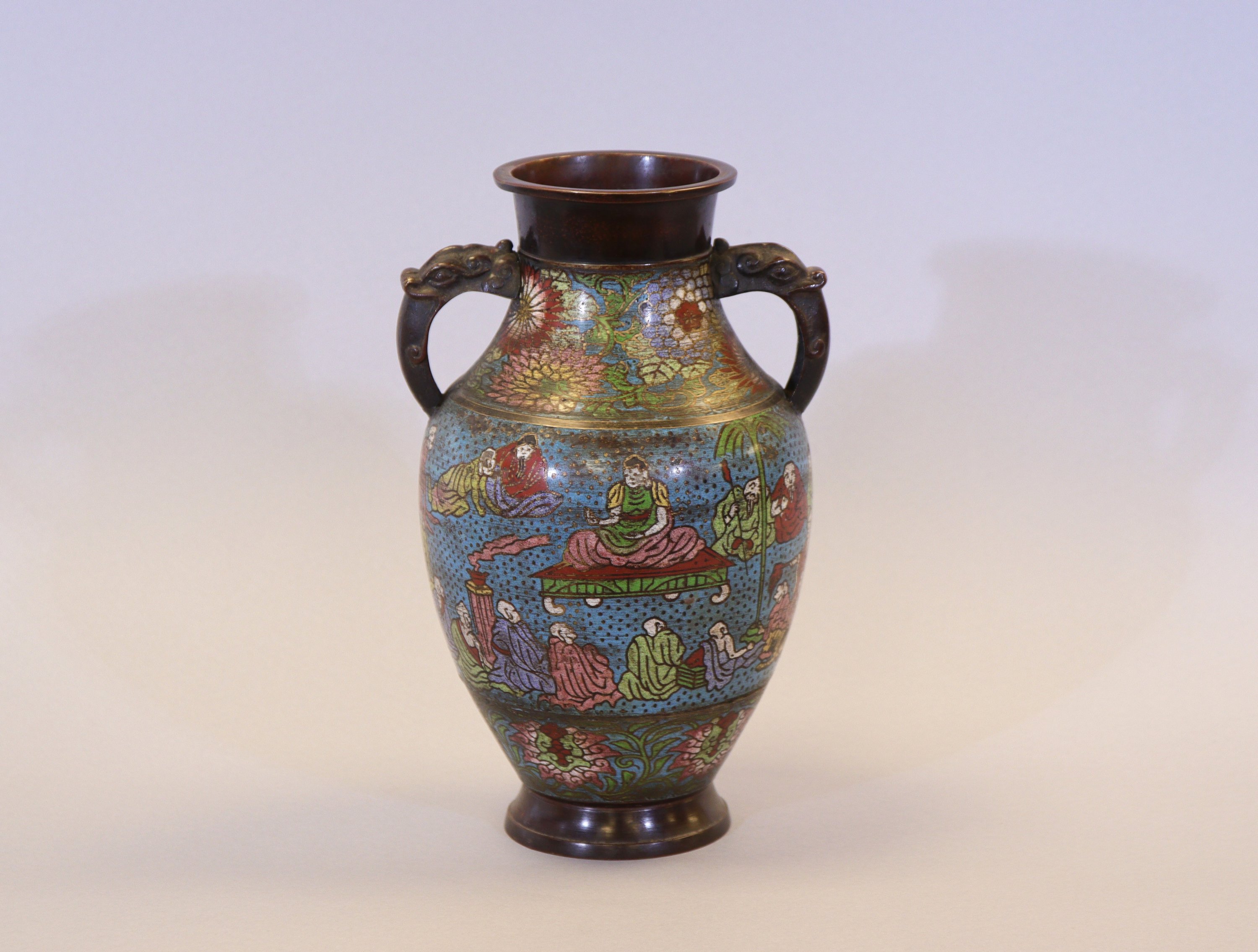 Bronze à patine brune et émaux cloisonnés, à décor de bouddha et rakan.