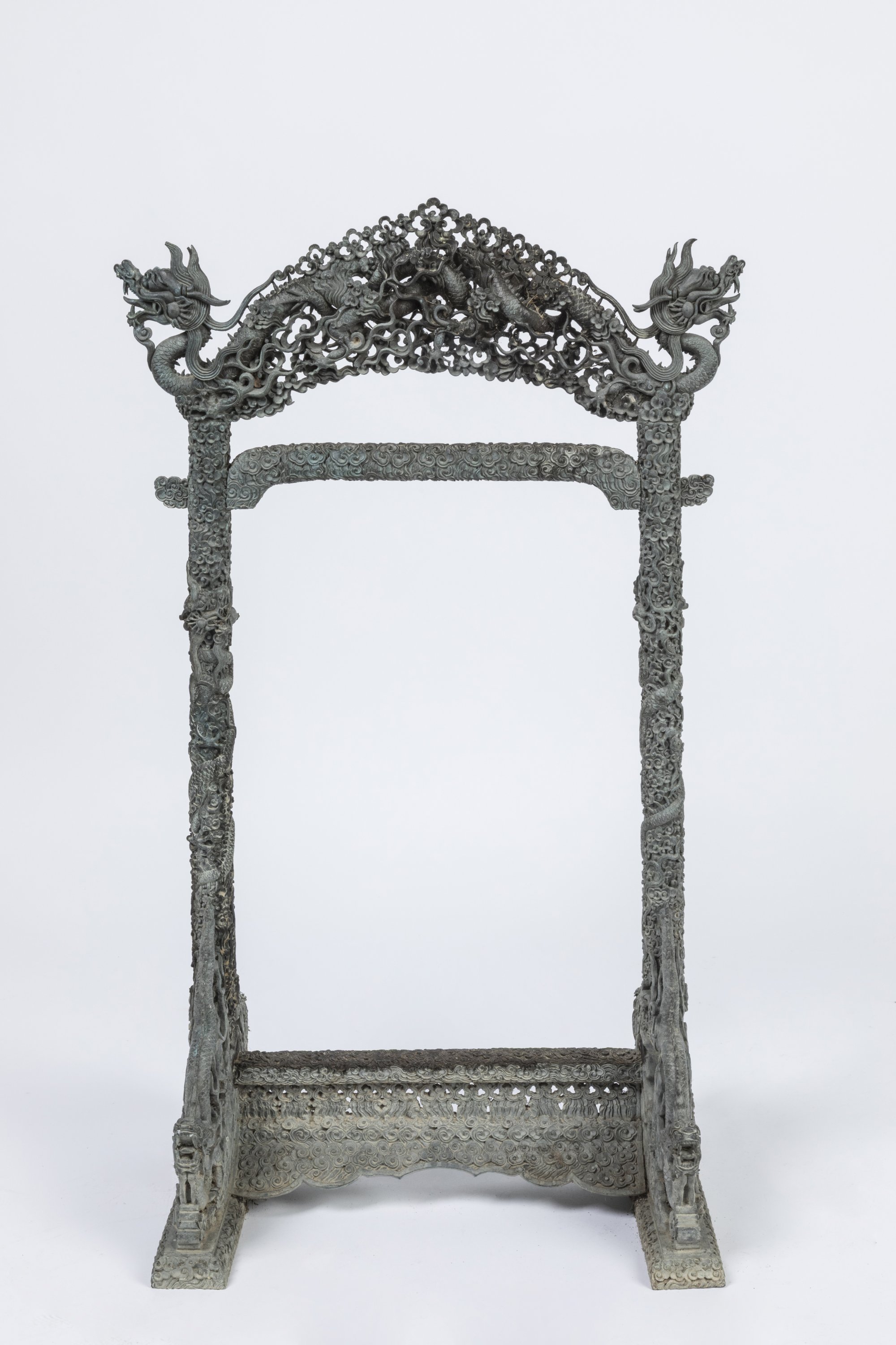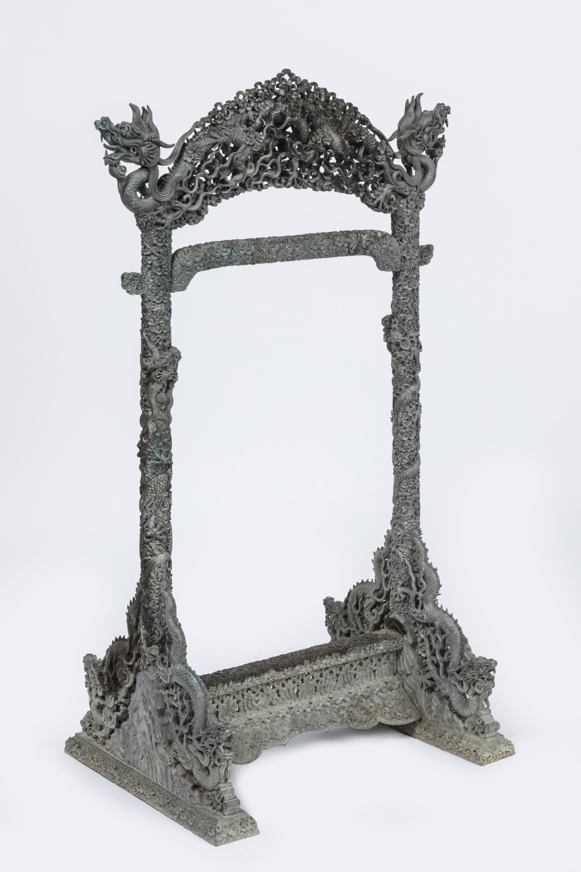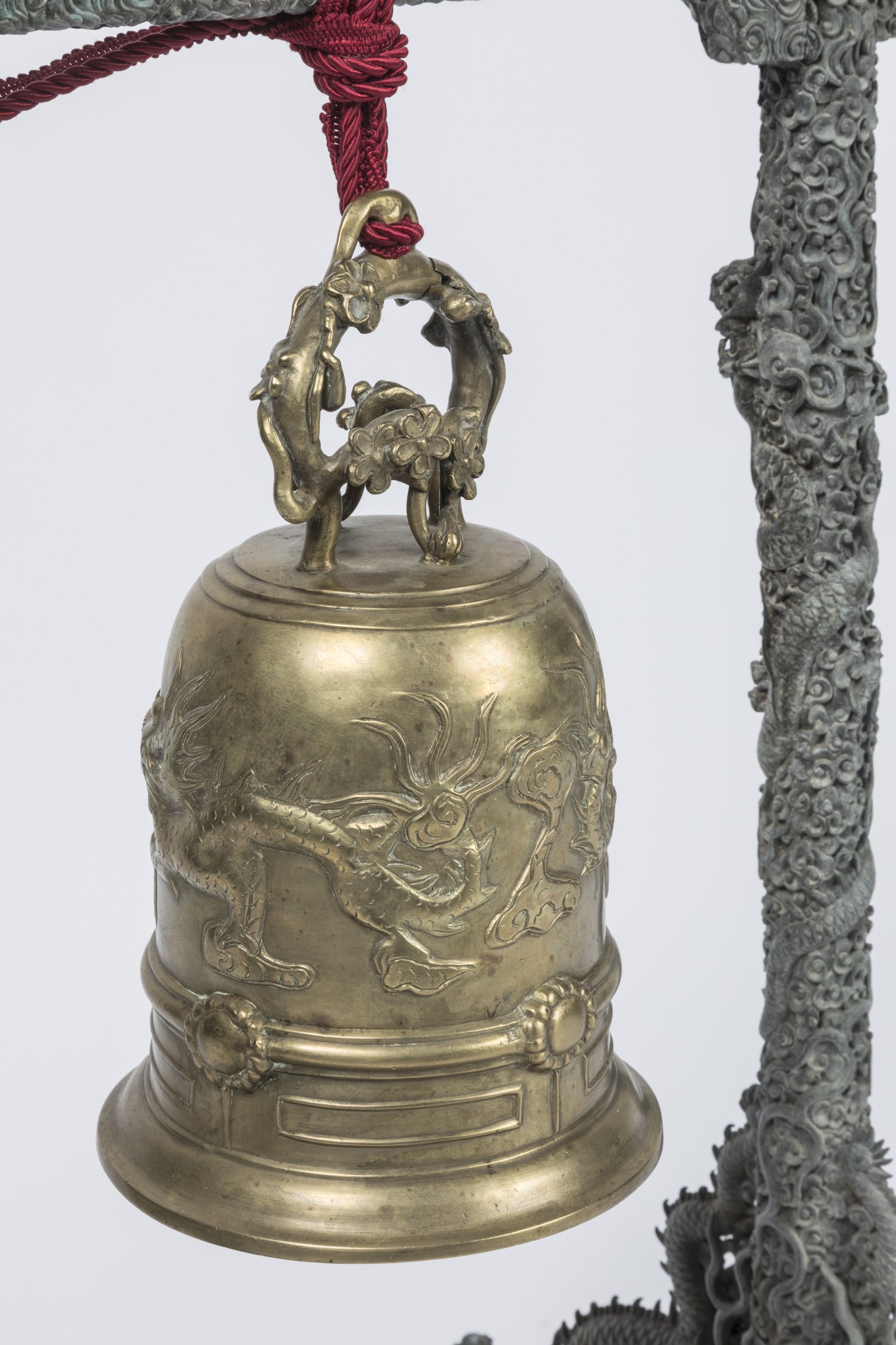 Suspendue à un support en bronze finement orné de multiples dragons dans les nuées formant les pieds et terminant le fronton supérieur, leurs gueules ouvertes, leurs corps s'enroulant autour des montants du support. Haut. 81 Larg. 41 Prof. 32 cm.