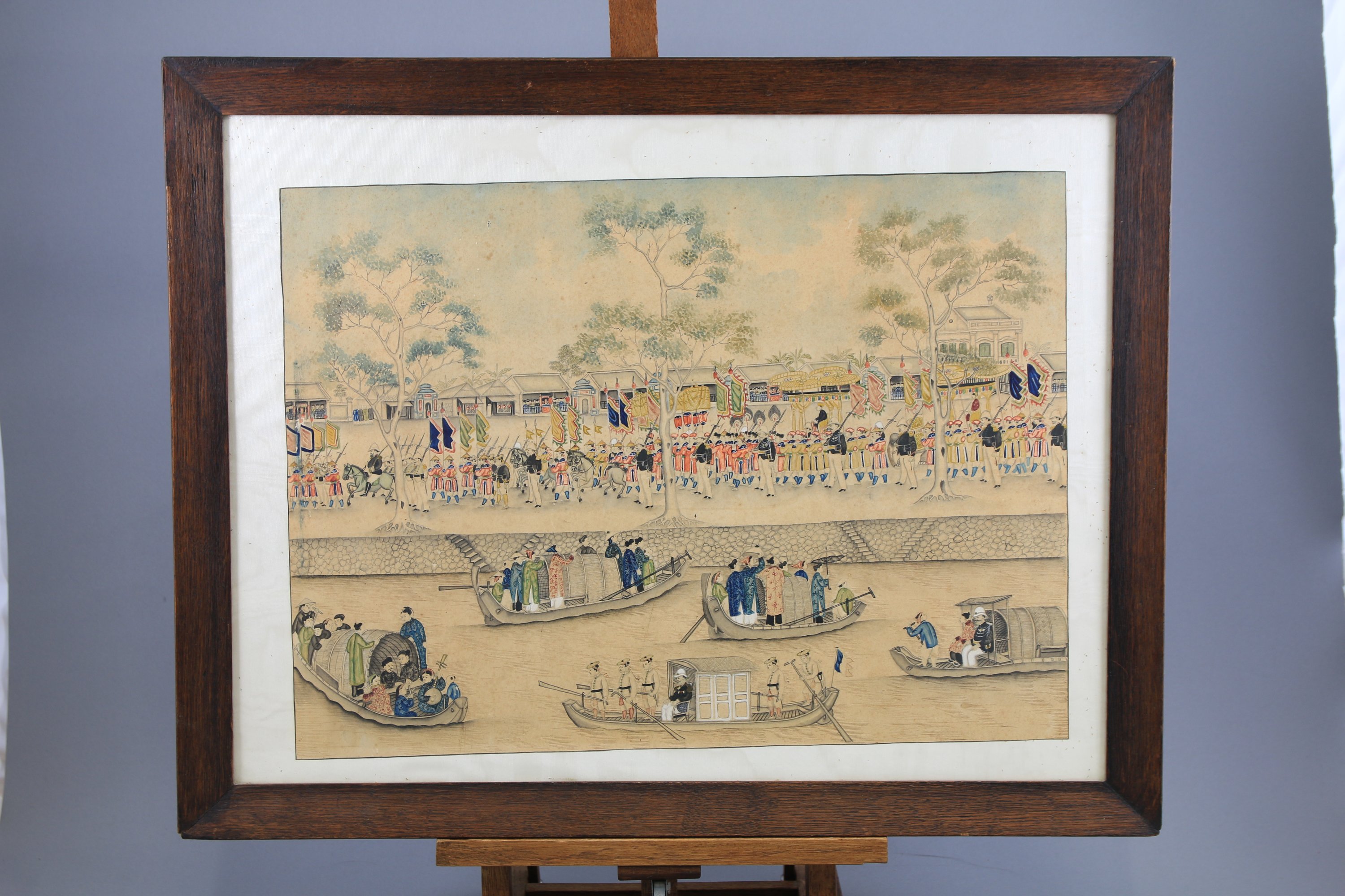 Défilé militaire sur un port montrant des soldats vietnamiens et européens, des personnages européens et vietnamiens dans des barques