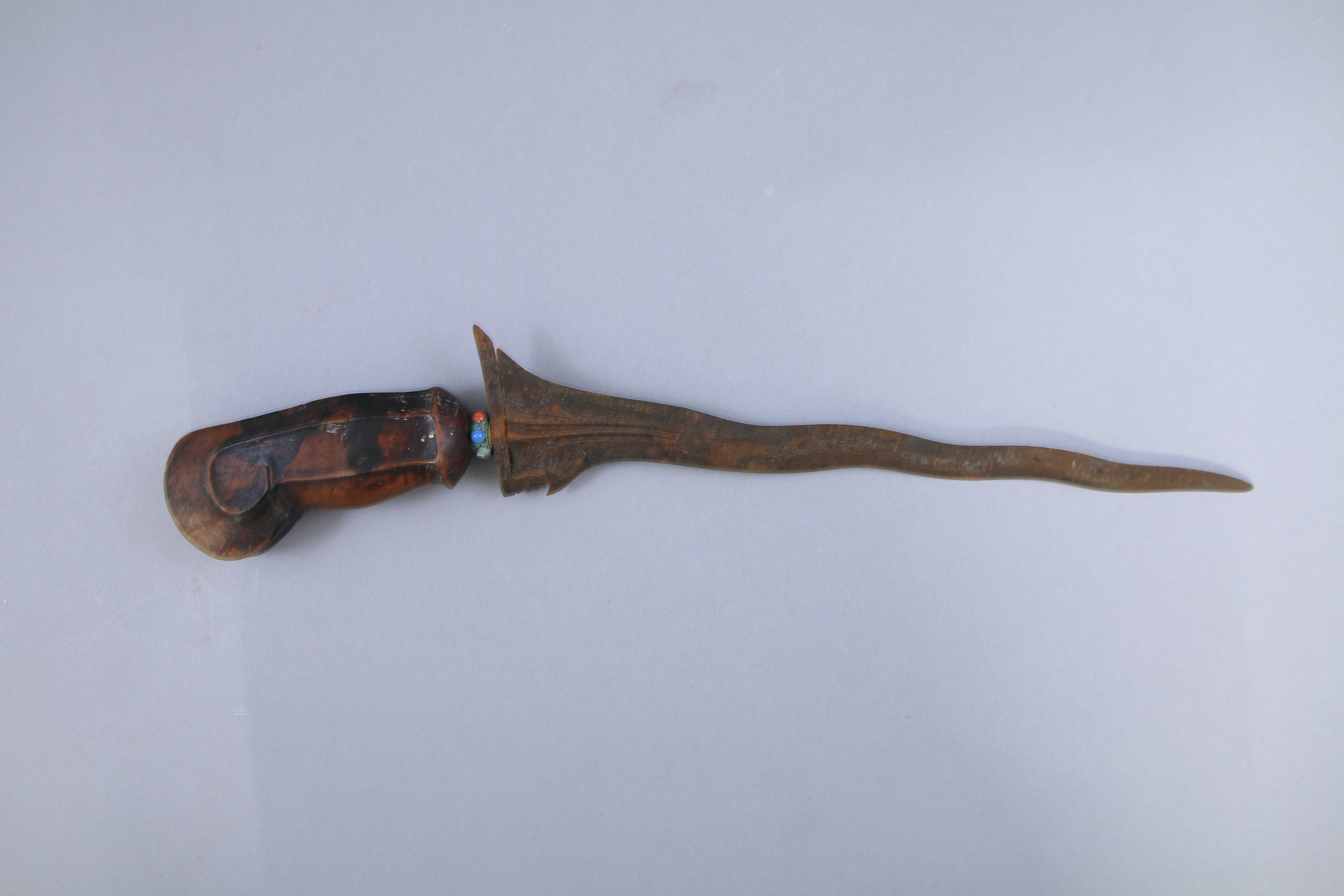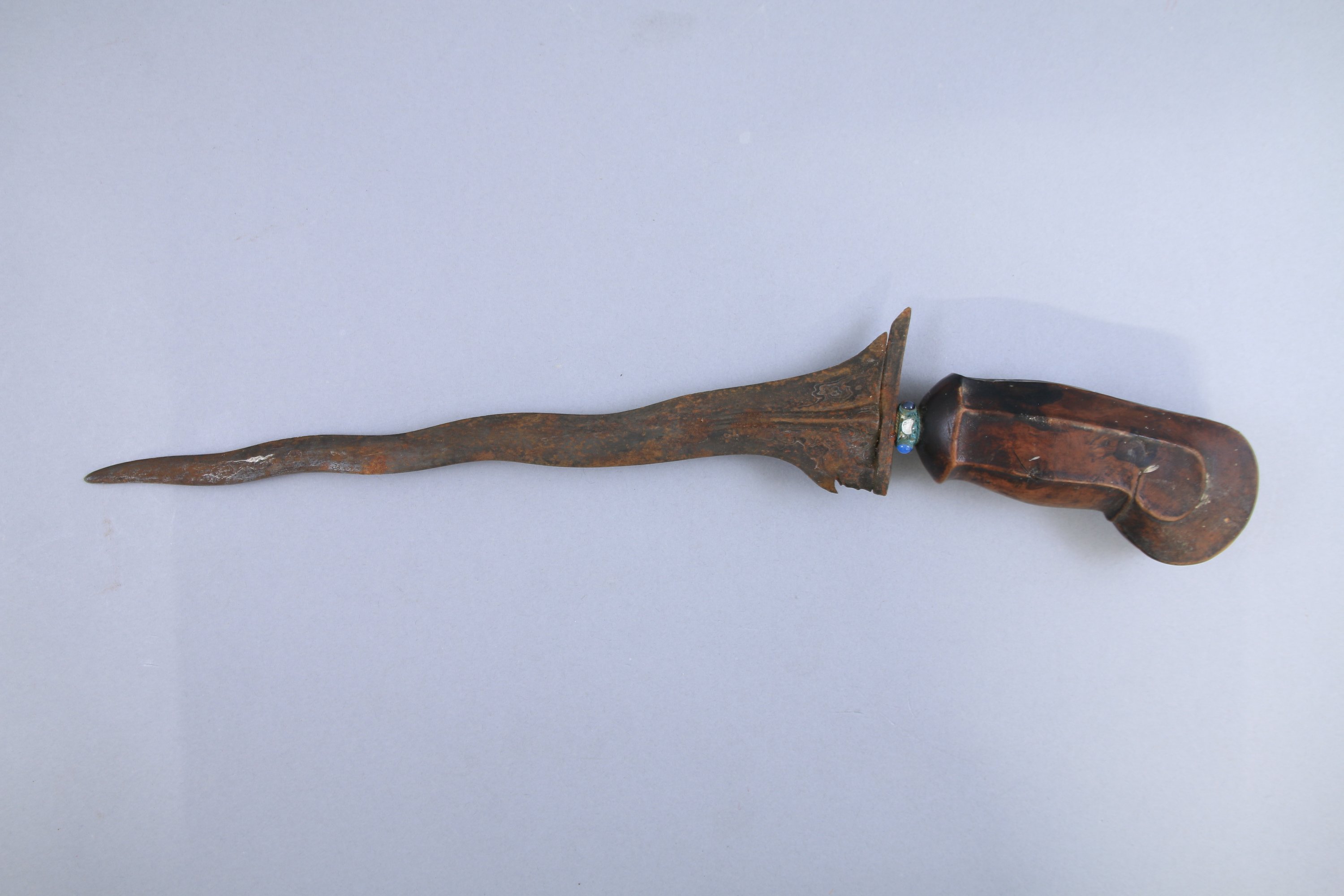 Poignée et fourreau en bois. Virole à décor de verroterie. Lame flamboyante en acier pamor.