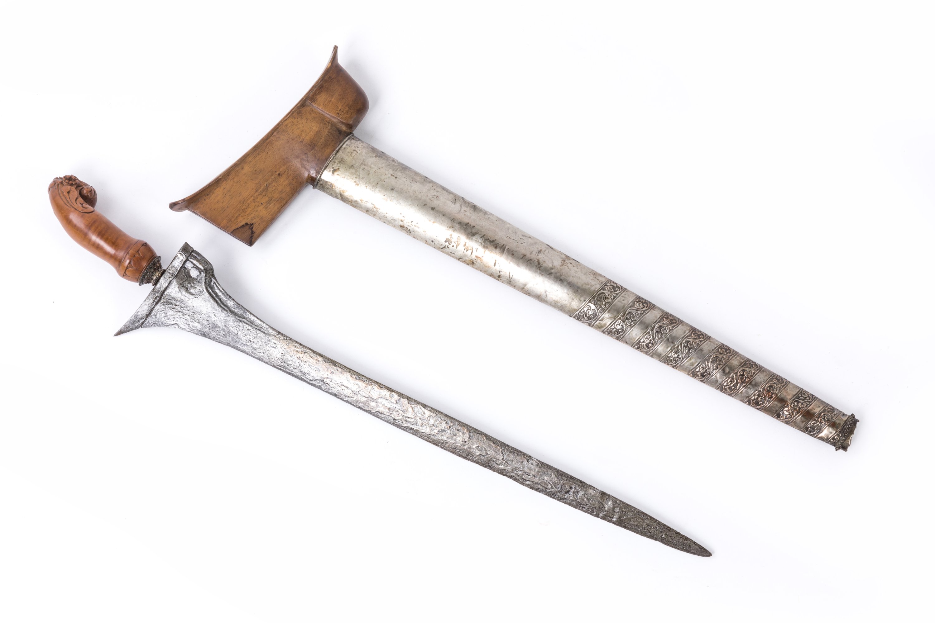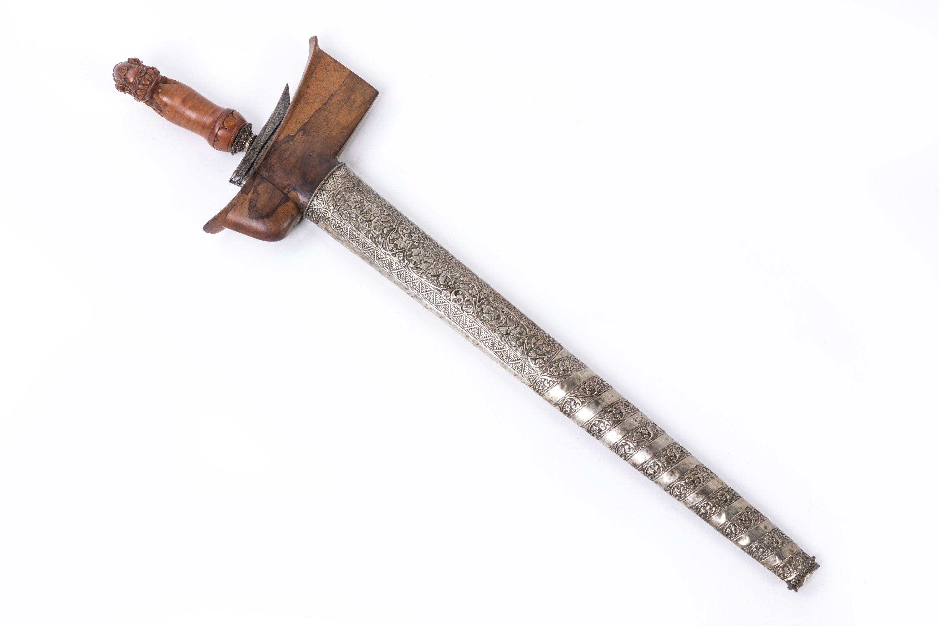 Poignée en bois clair sculpté. Lame droite en acier pamor. Fourreau en bois recouvert en partie d’une plaque d’argent repoussé à décor de fleurs et feuillages.