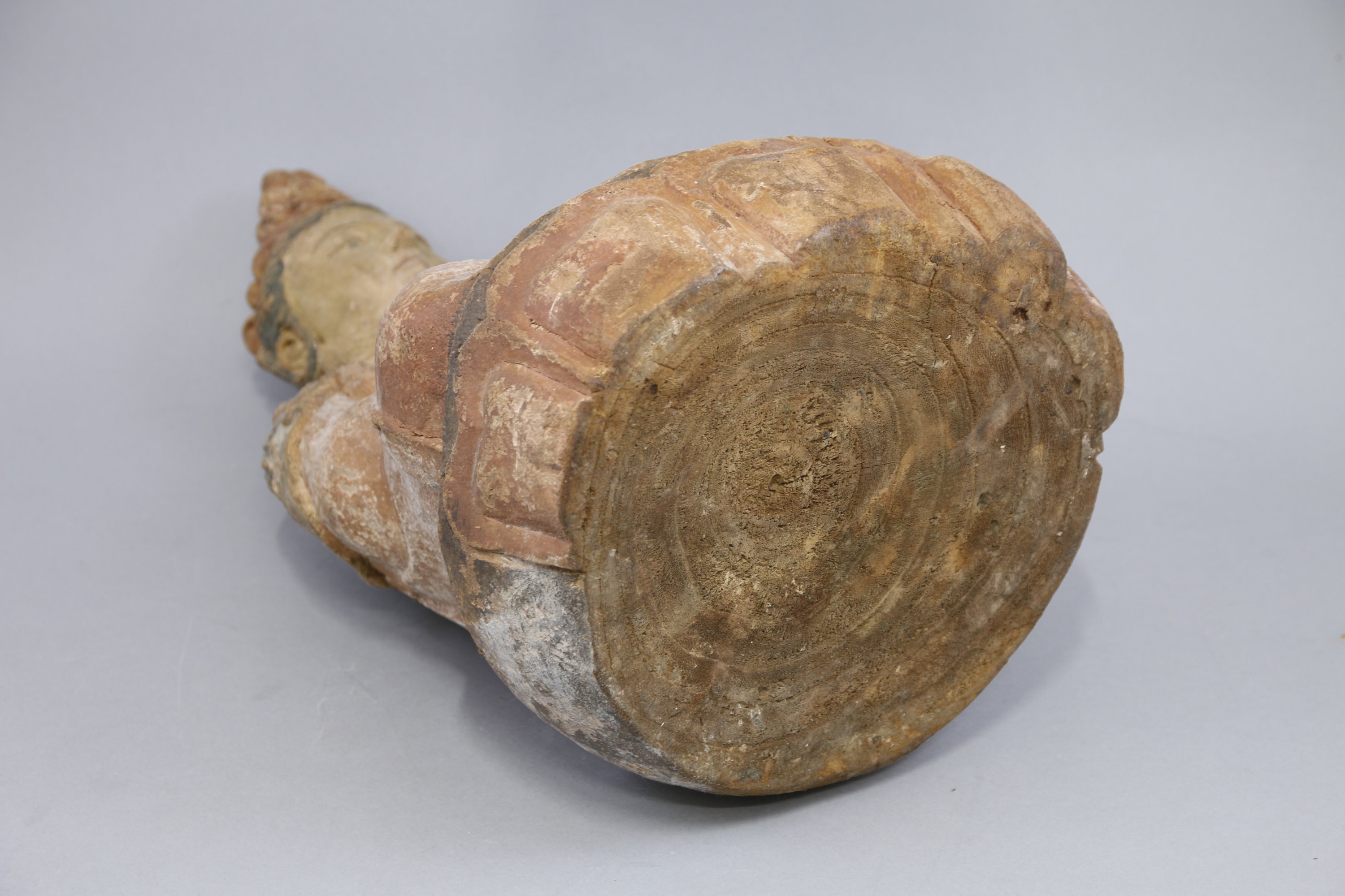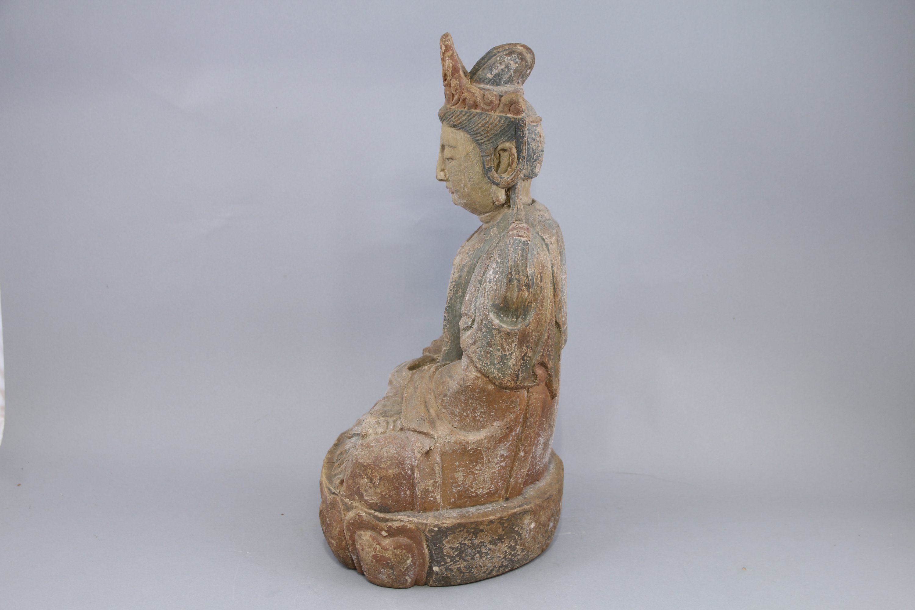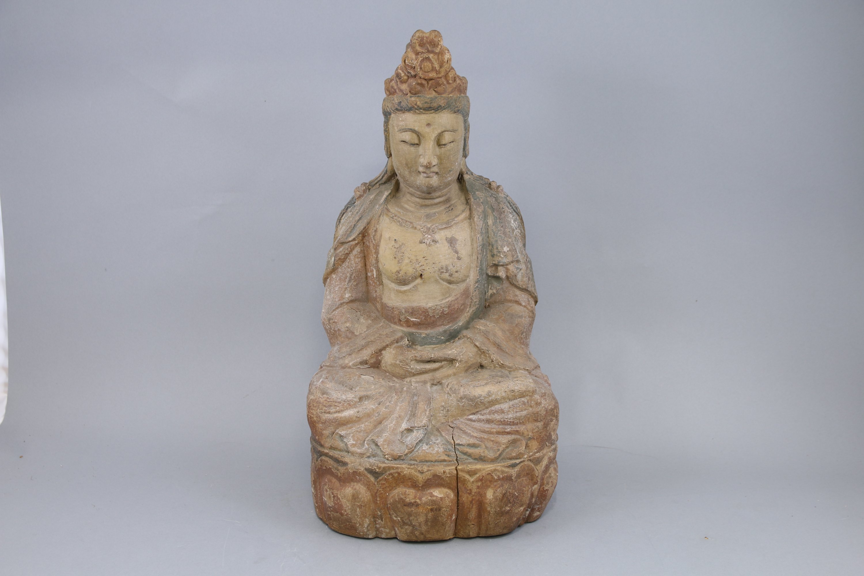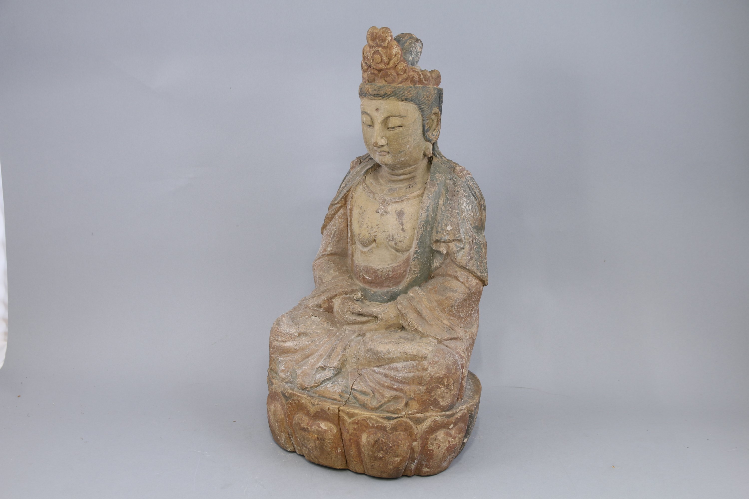 Bois sculpté à traces de laque rouge et vert. Représentée assise en padmasana sur un lotus, les mains en dhyana mudra (geste de méditation).