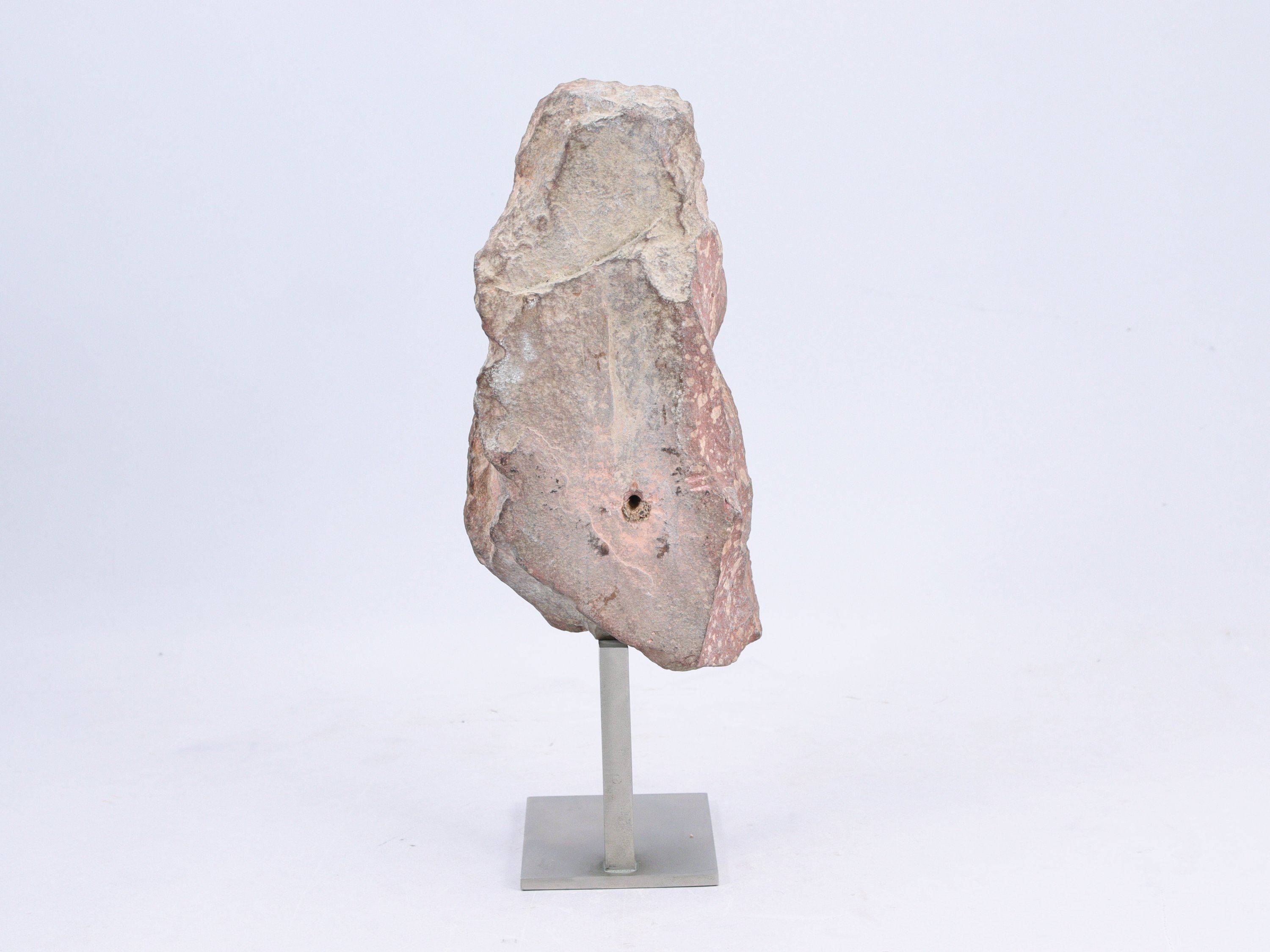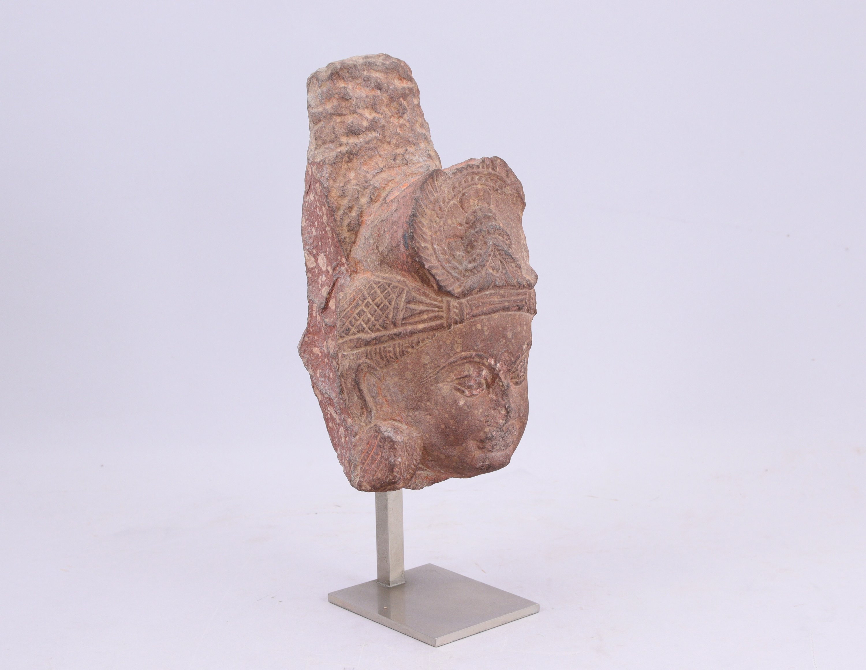 Les yeux ouverts en amande, la coiffe ornée d'un turban noué sur le devant formant fleur.
