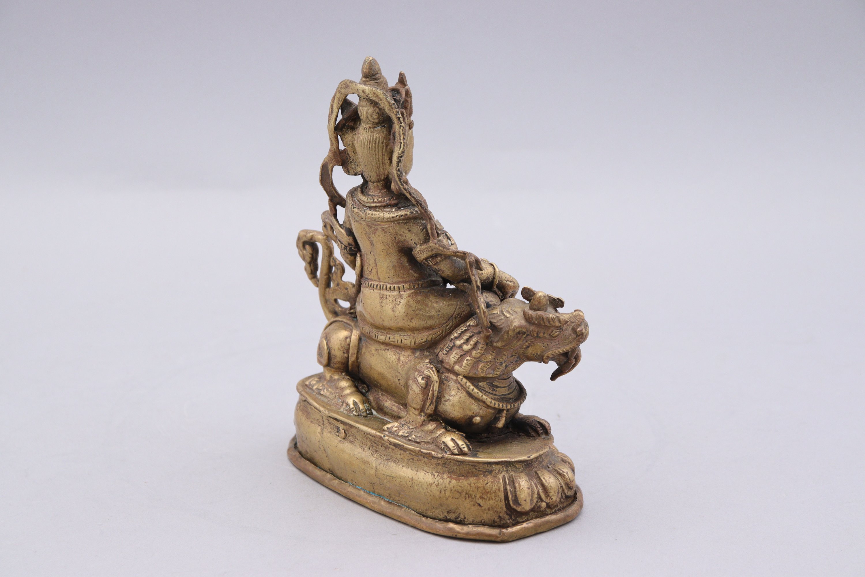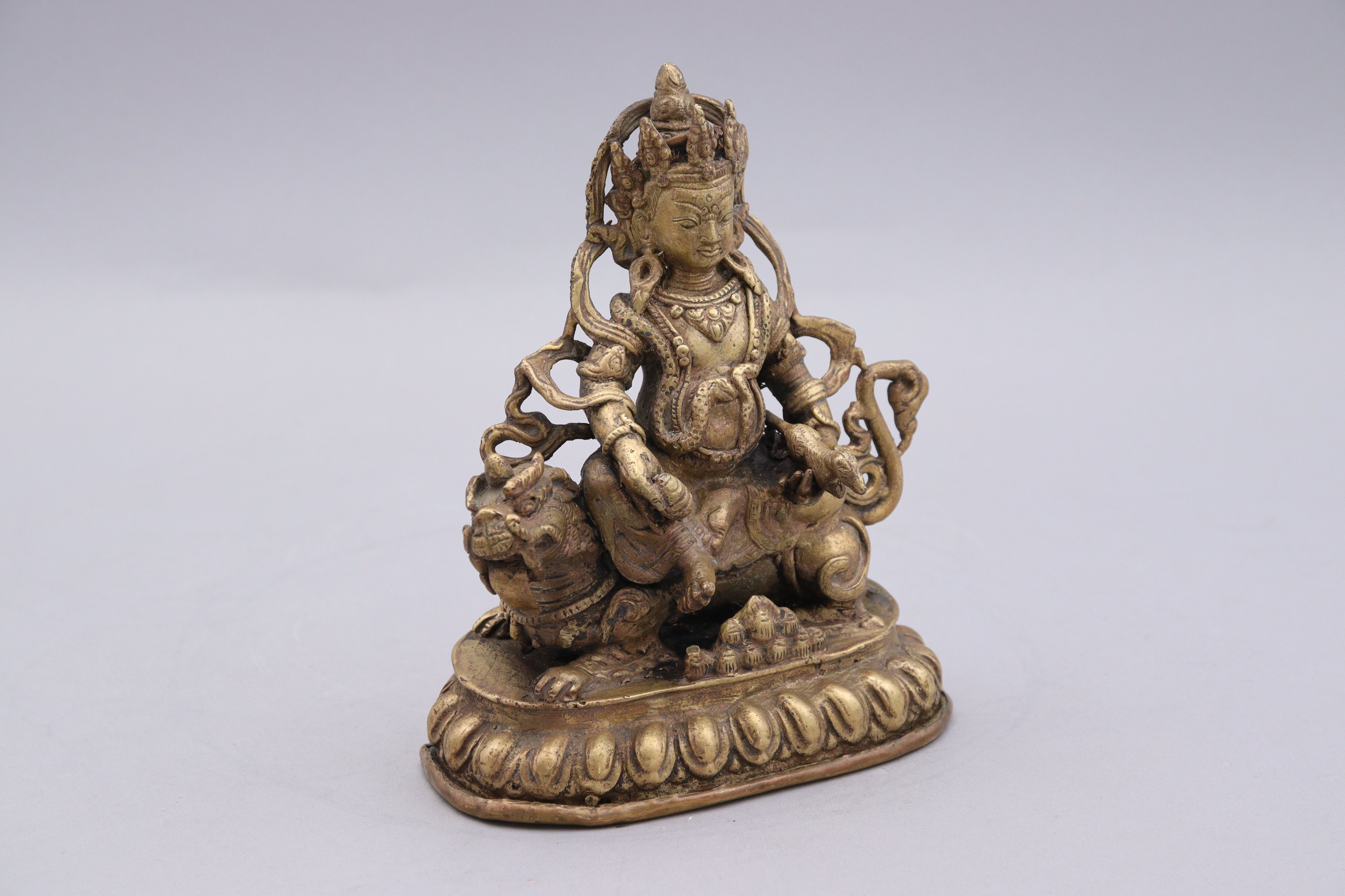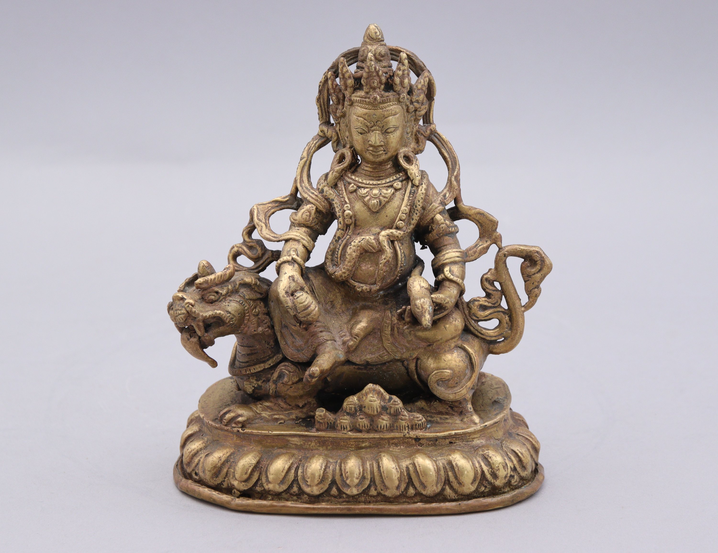 Bronze doré, assis sur une qilin couchée sur un socle en forme de lotus et tenant le nakula crachant des joyaux.