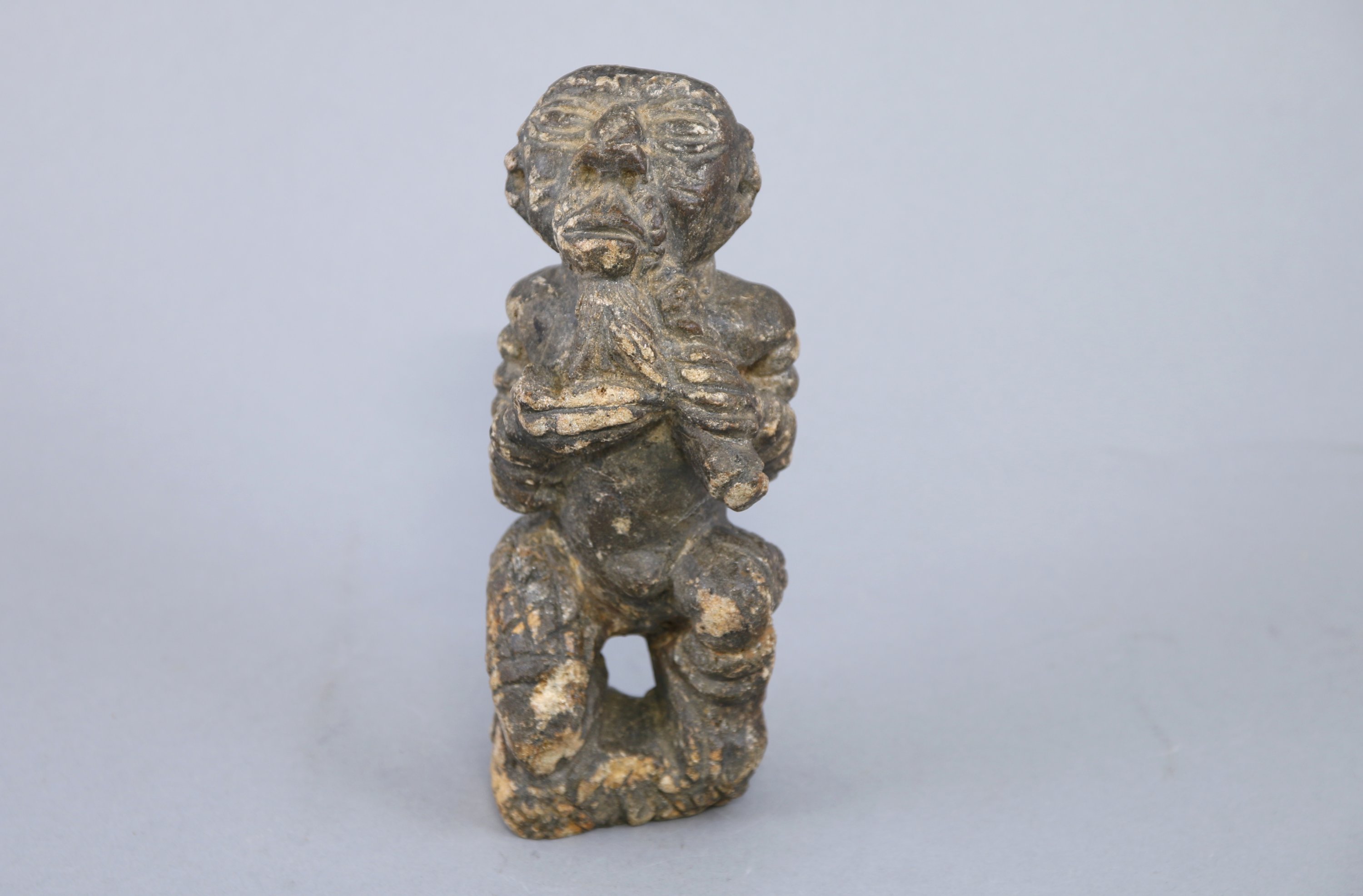 Ancienne sculpture « Pomdo » liée au culte des ancêtres et représentant un personnage, genou droit à terre.