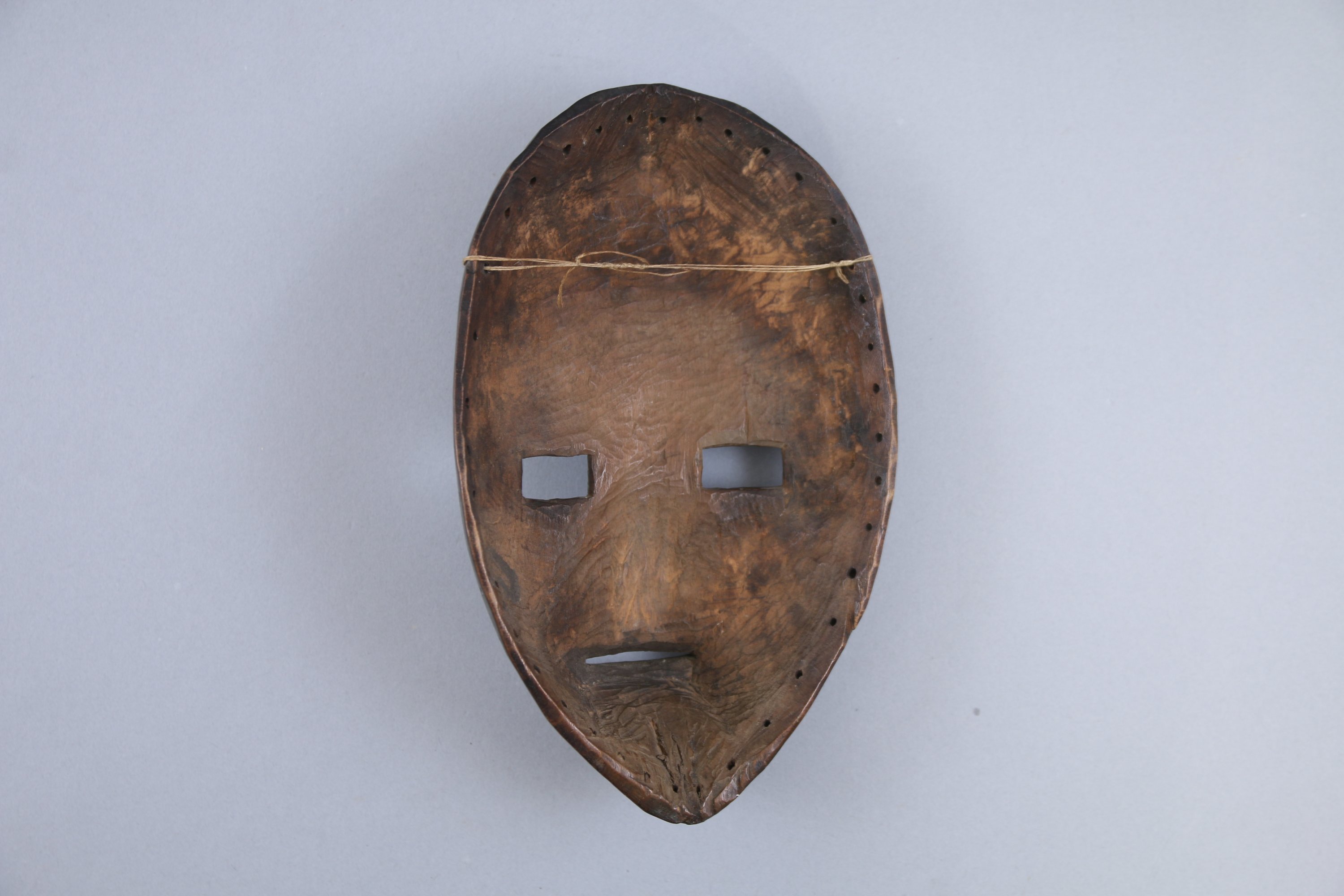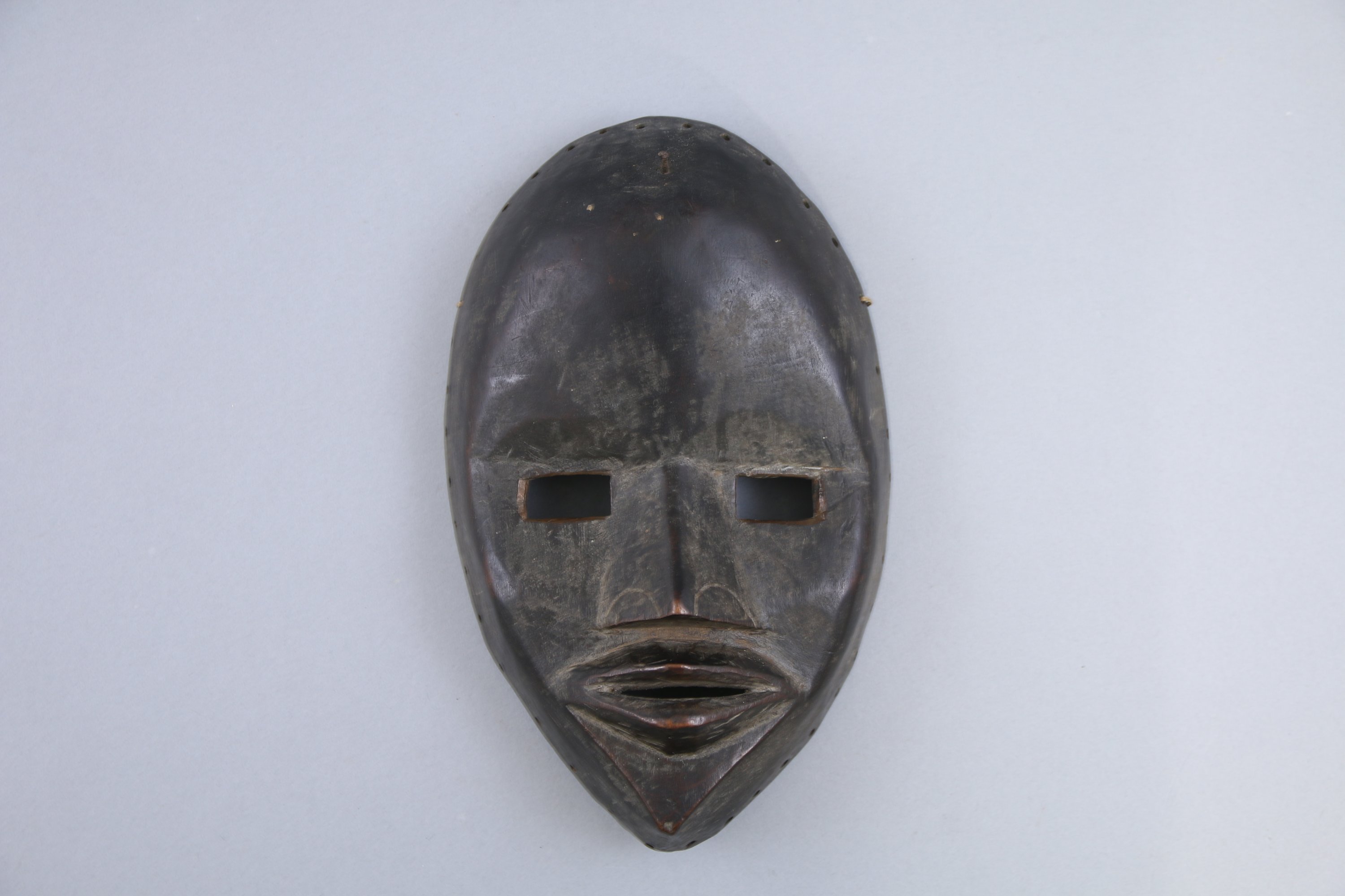 Masque de danse au visage ovale et menton pointu, le large front domine des yeux rectangulaires larges et la bouche entrouverte.