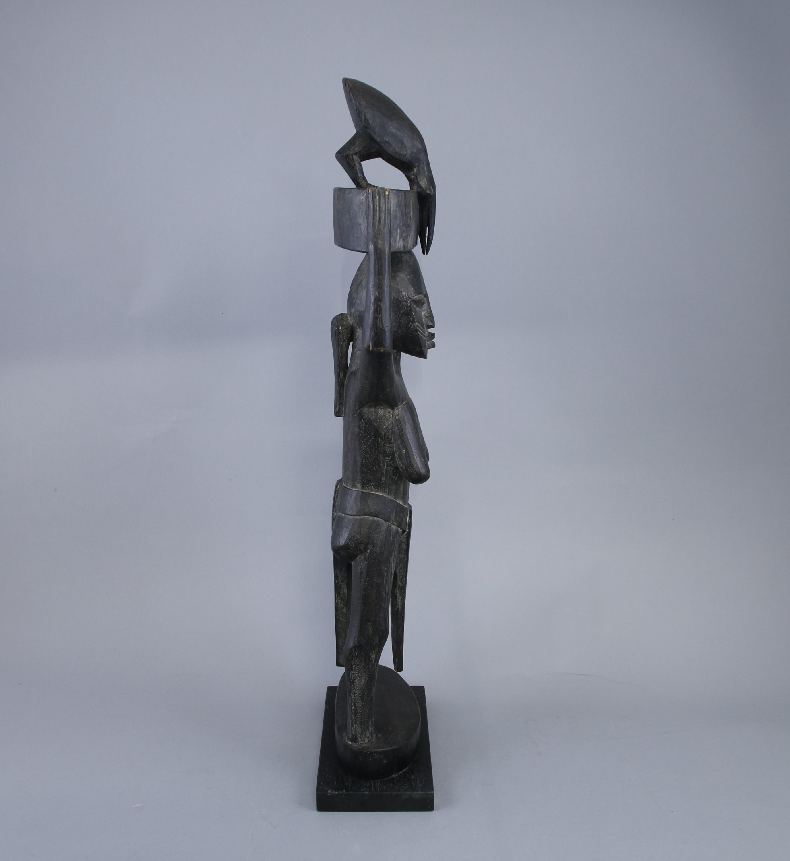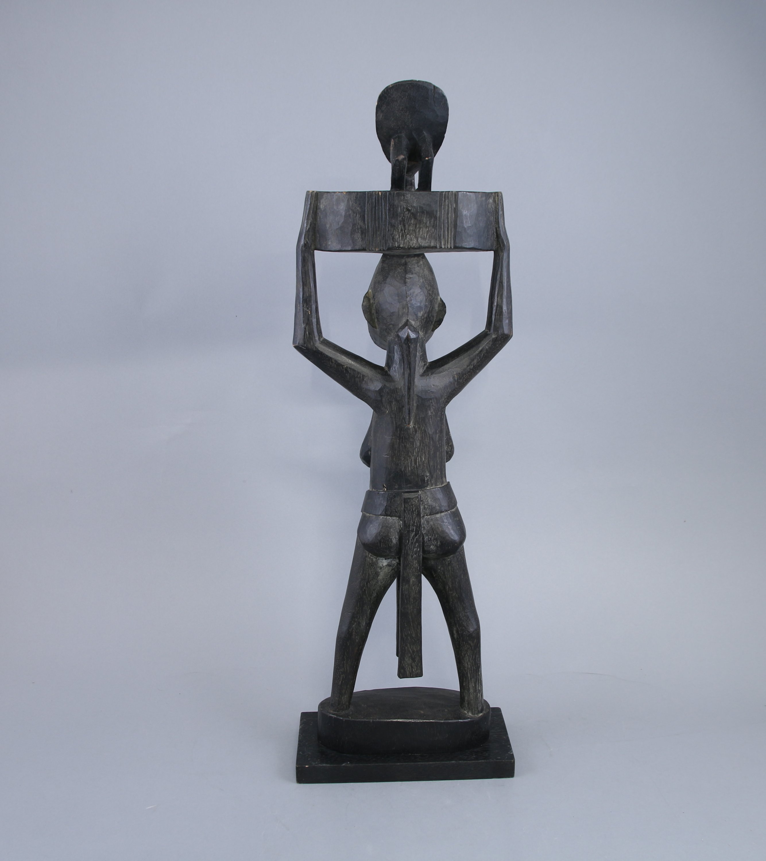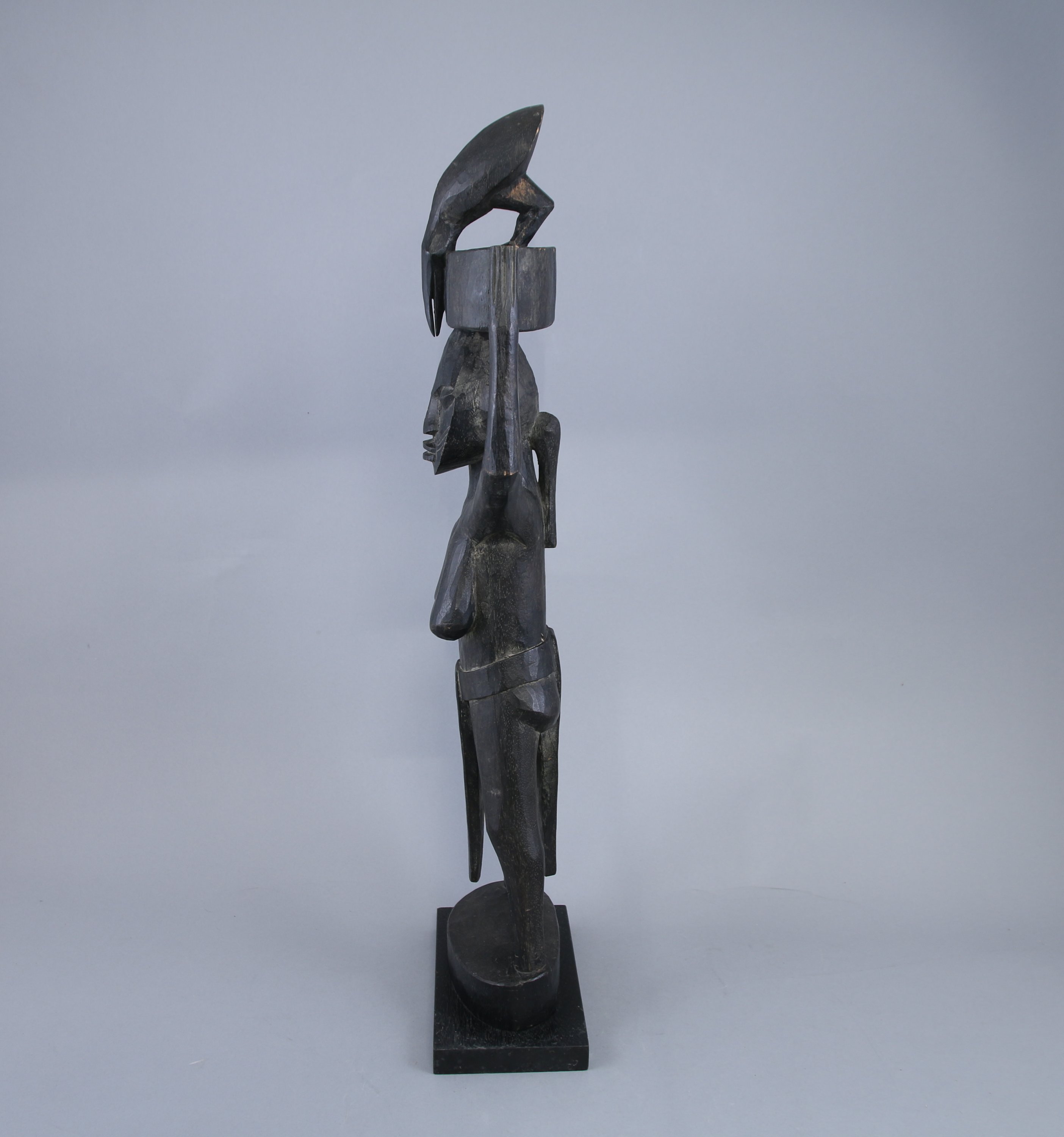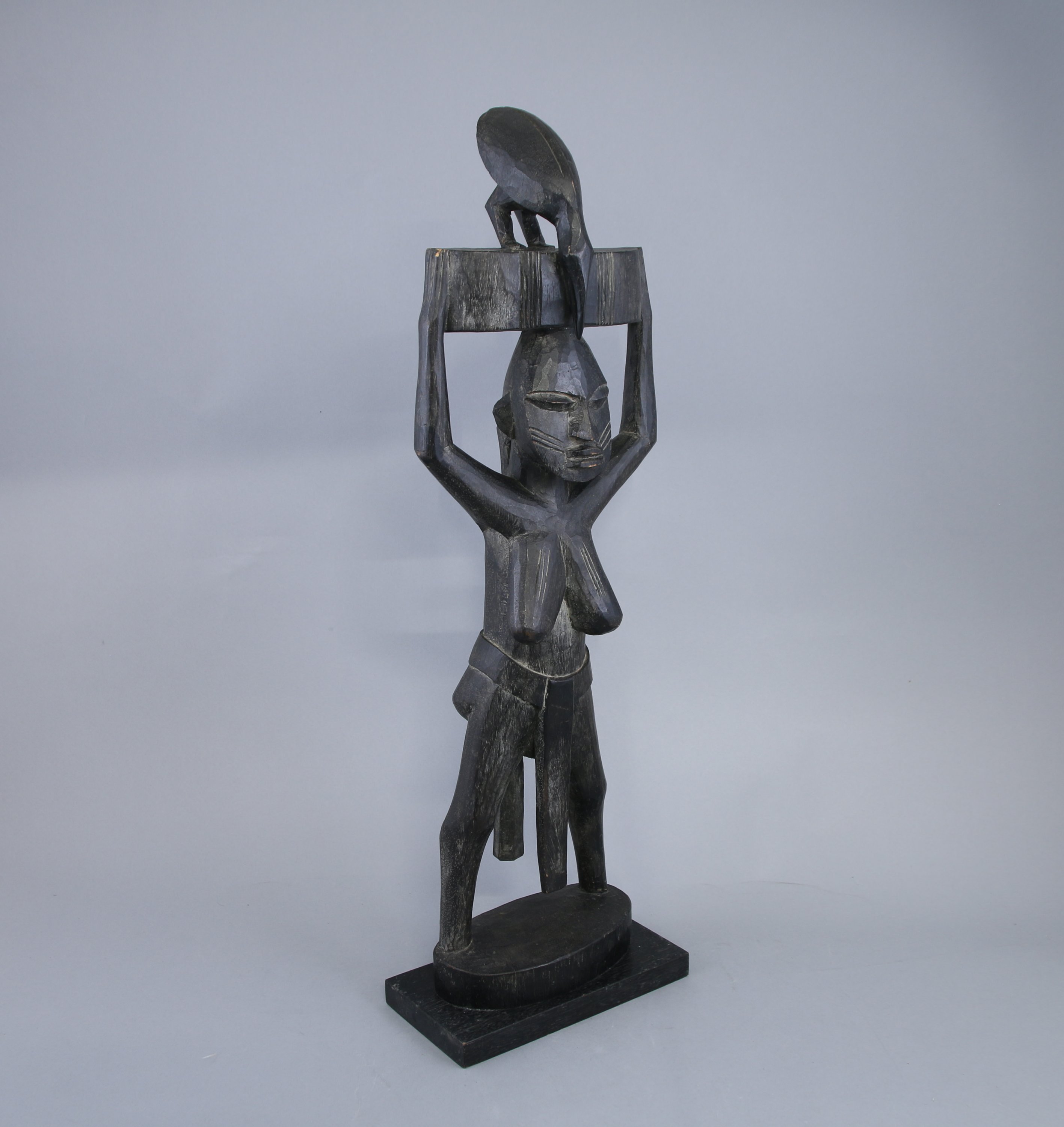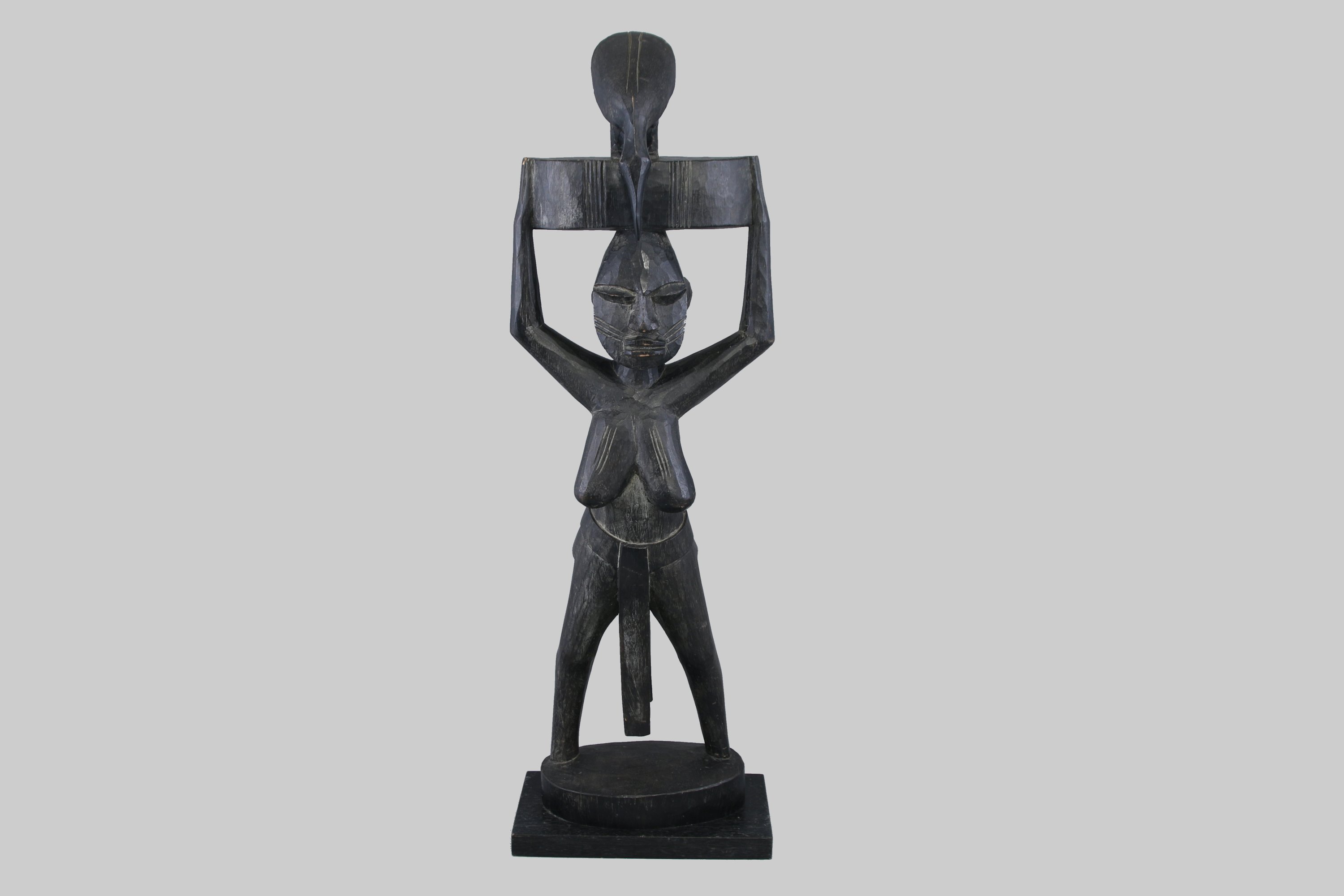 Statue féminine debout à la poitrine généreuse, les bras levés soutiennent une charge surmontée d’un oiseau.