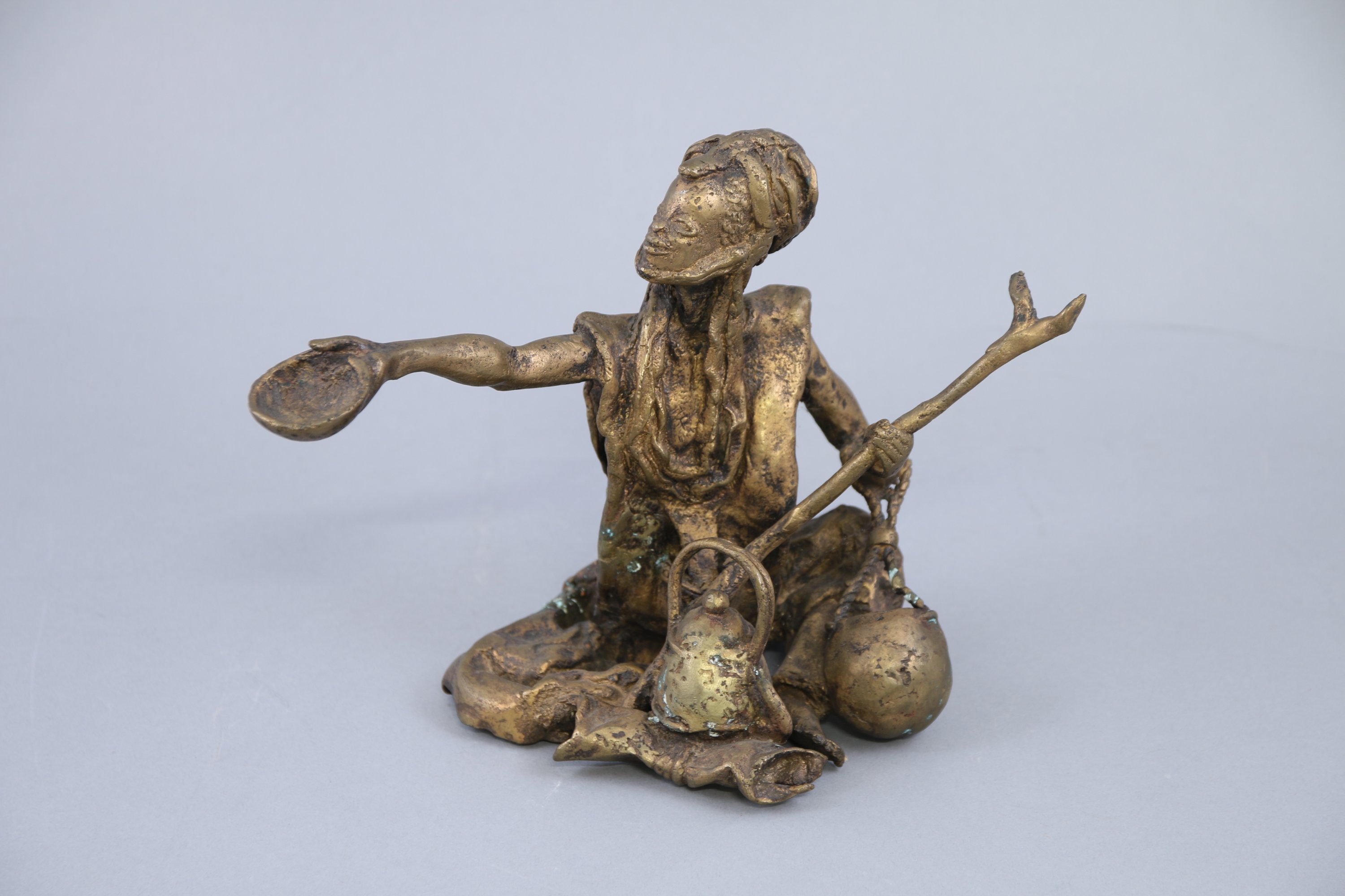 Sculpture représentant un mendiant assis, le bras droit tendu demandant l’aumône