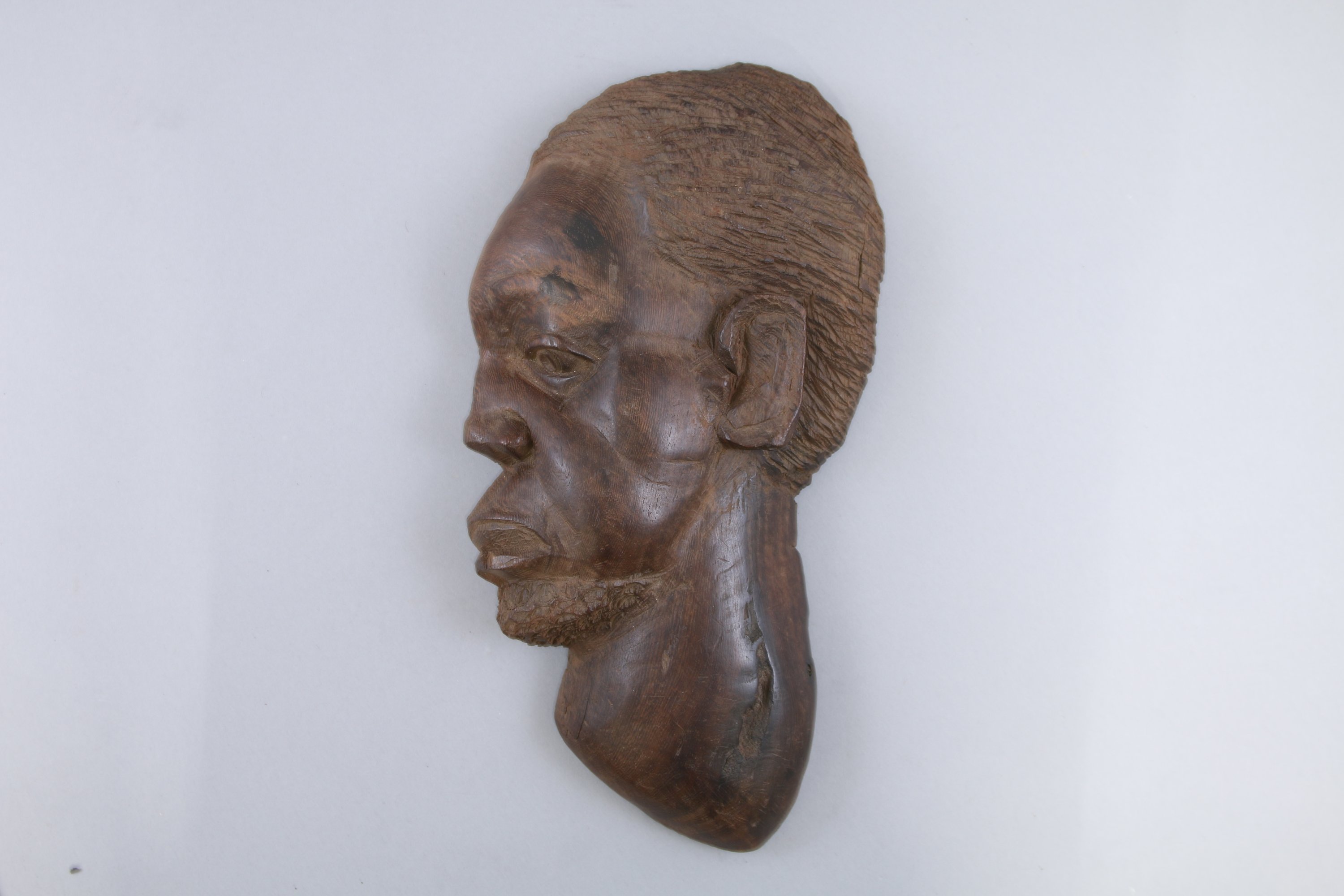 Sculpture en bois exotique représentant une tête d’africain portant une barbe
