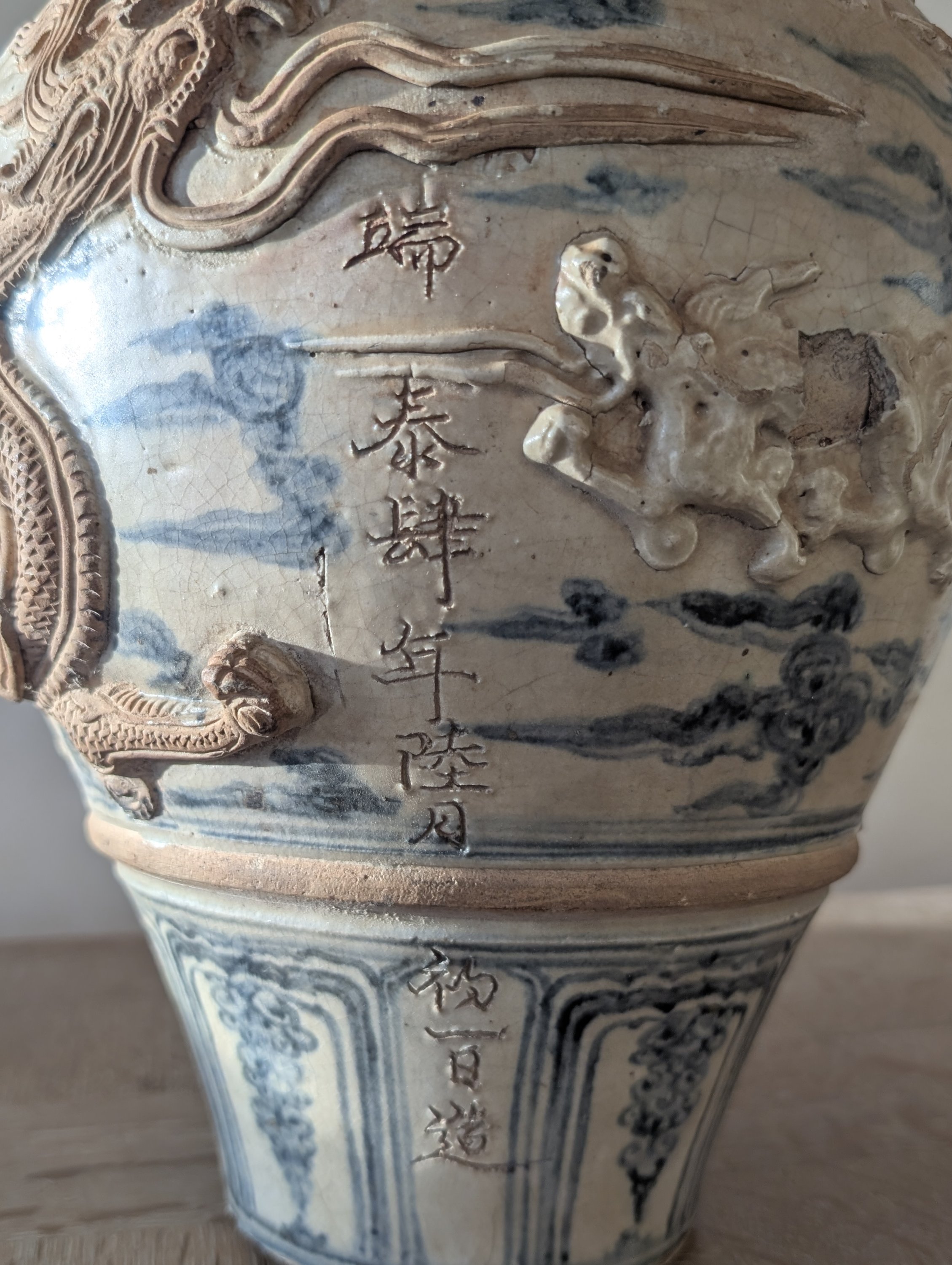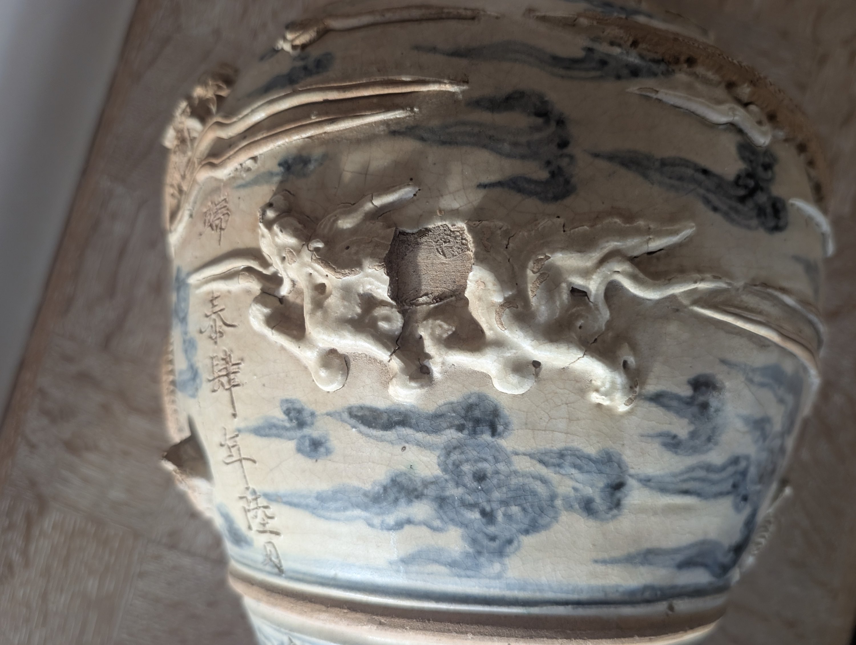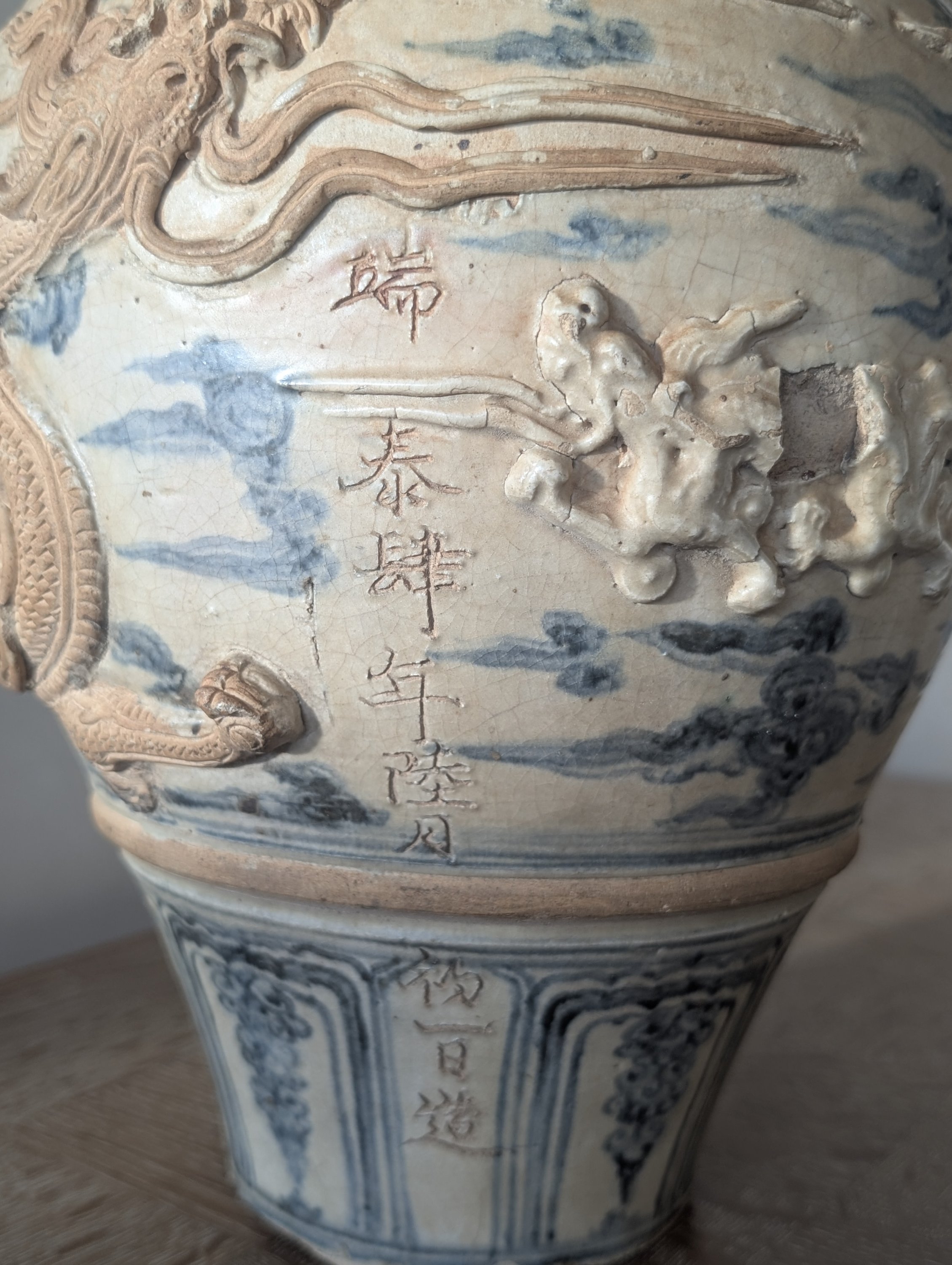 Décor en relief appliqué de dragons volant dans les nuages.