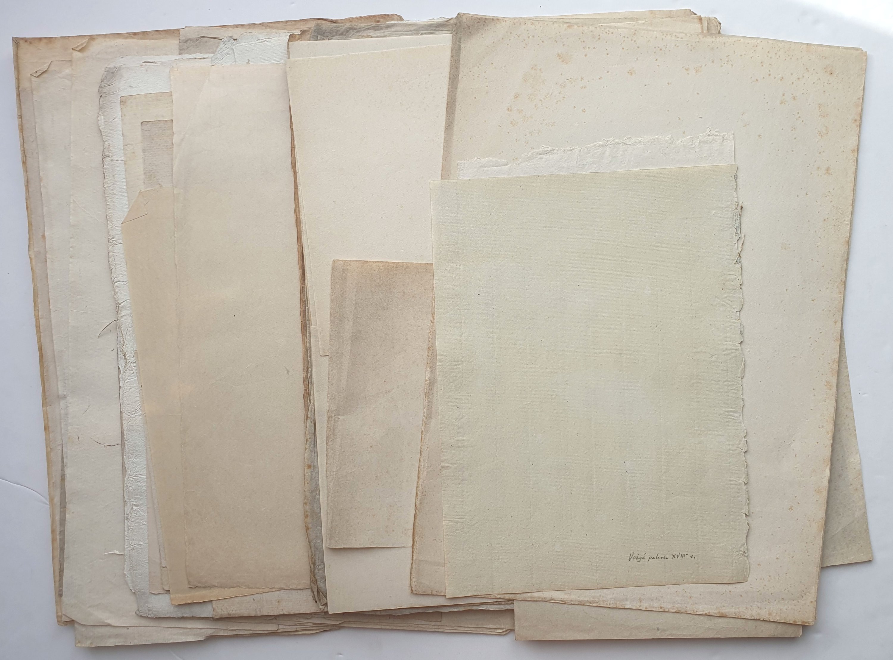 Rarissime réunion de + de 230 feuilles vierges, fabrication artisanale, à vergeures, certaines filigranées, formats divers (54 x 40 cm pour les plus grandes), comprenant notamment :