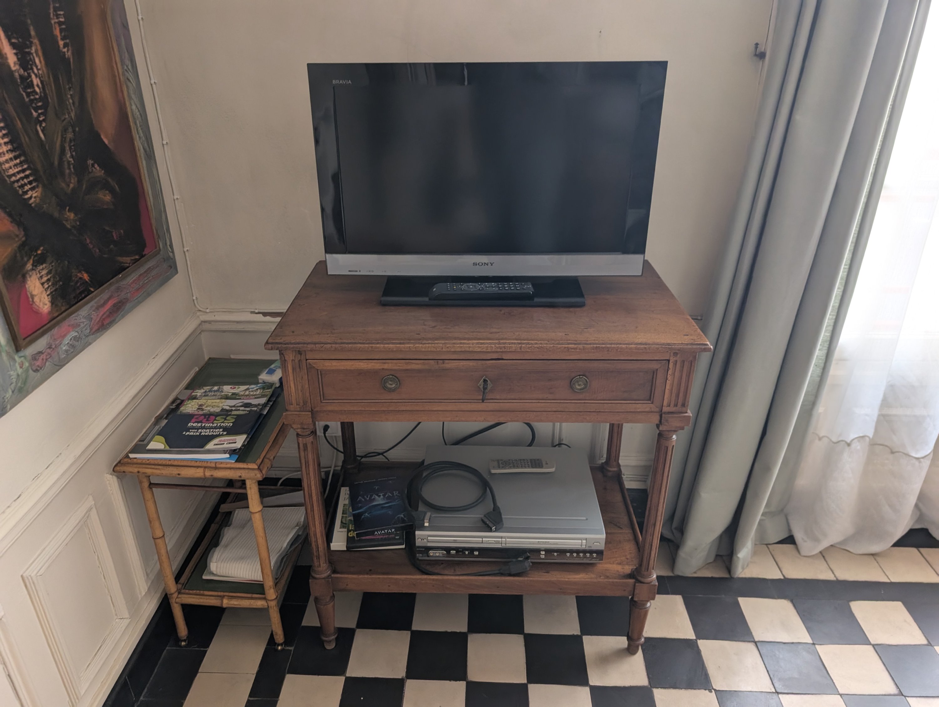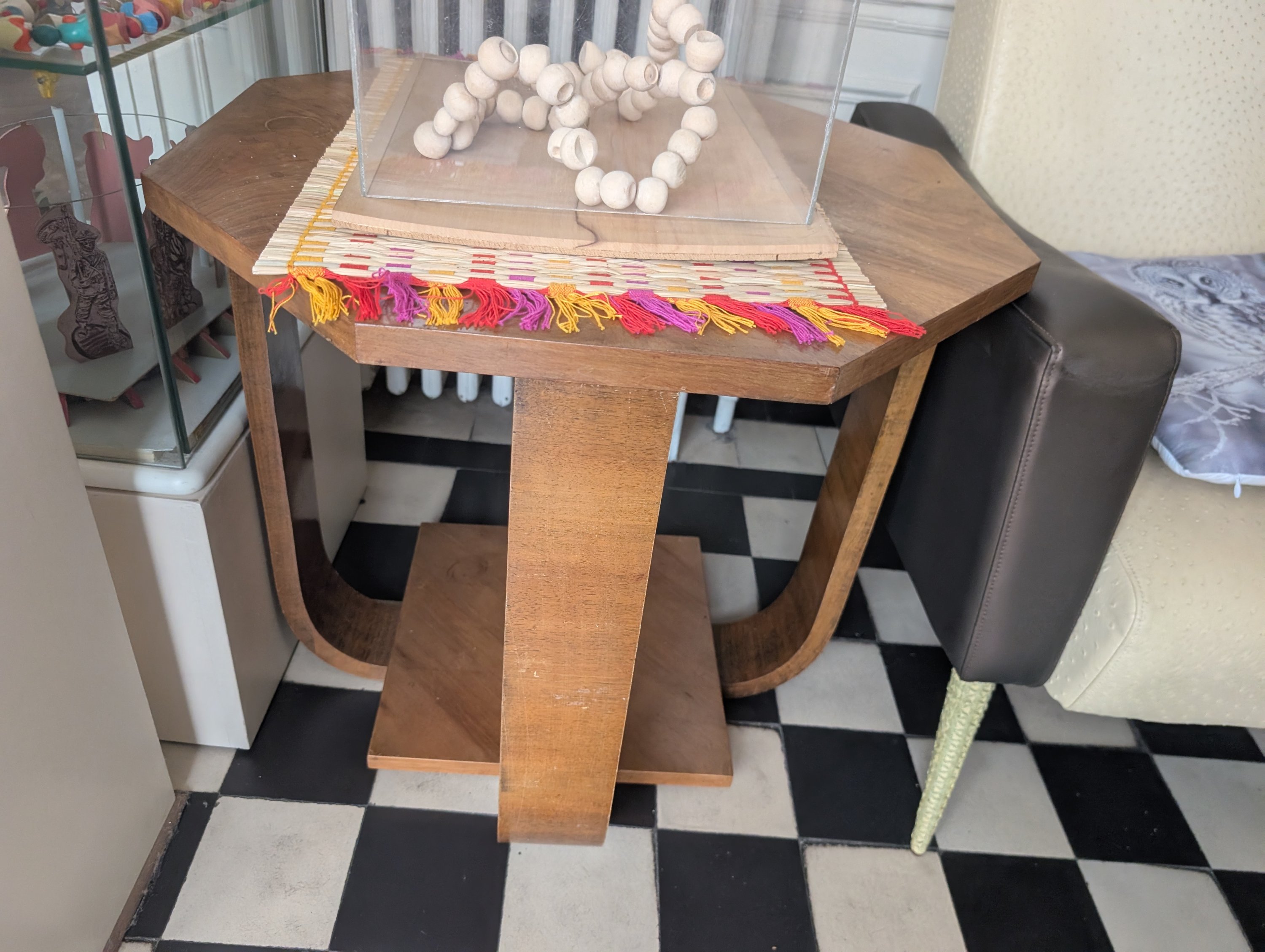 Joint : petite table d'appoint en bambou, fauteuil et tabouret pour regarder la télévision et console au plateau octogonal. Epoque art déco. Haut. 68 Diam 60 cm.