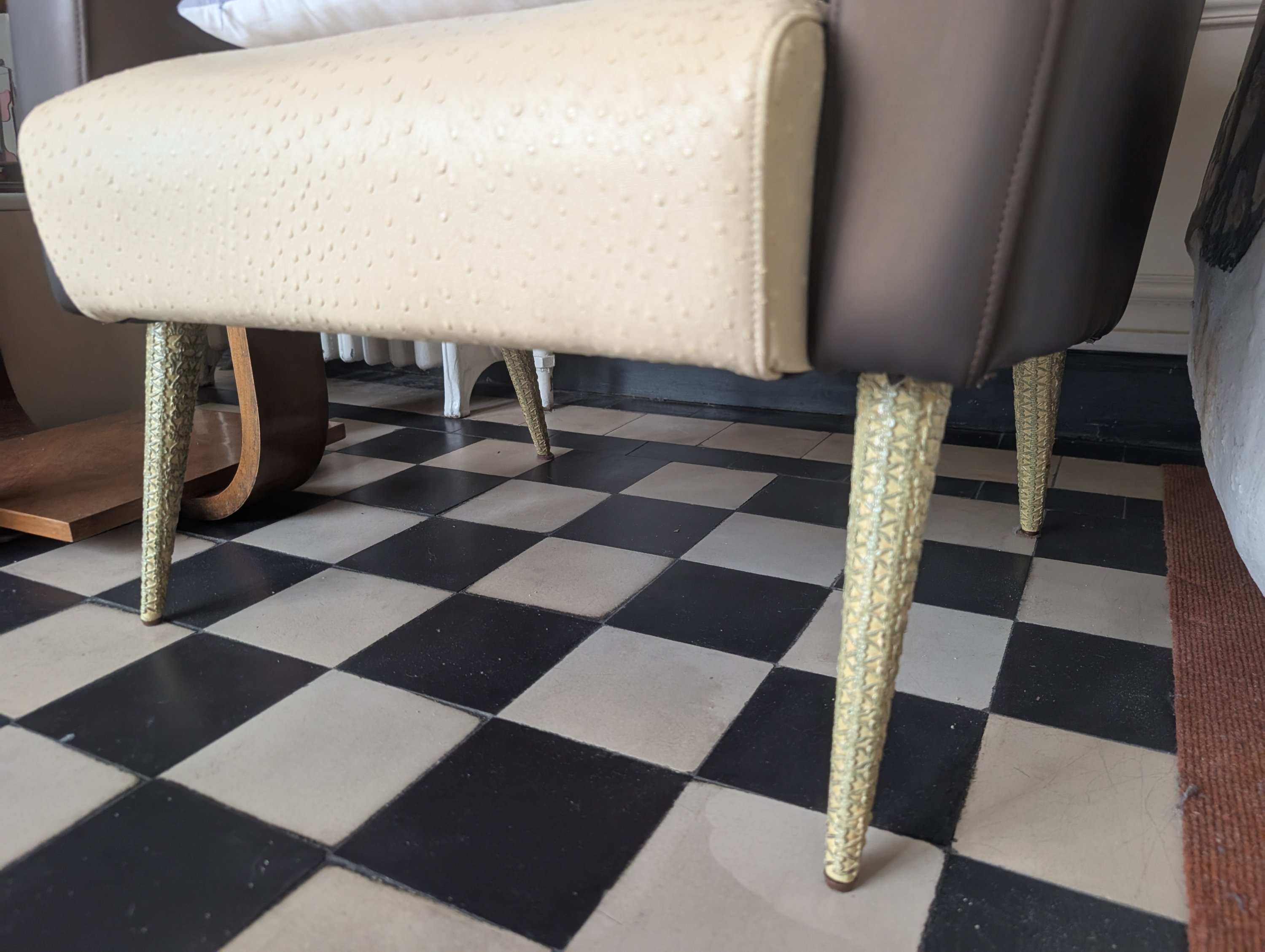 Tablette d'entrejambe. Elle repose sur quatre pieds, fuselés et bagués pour un.