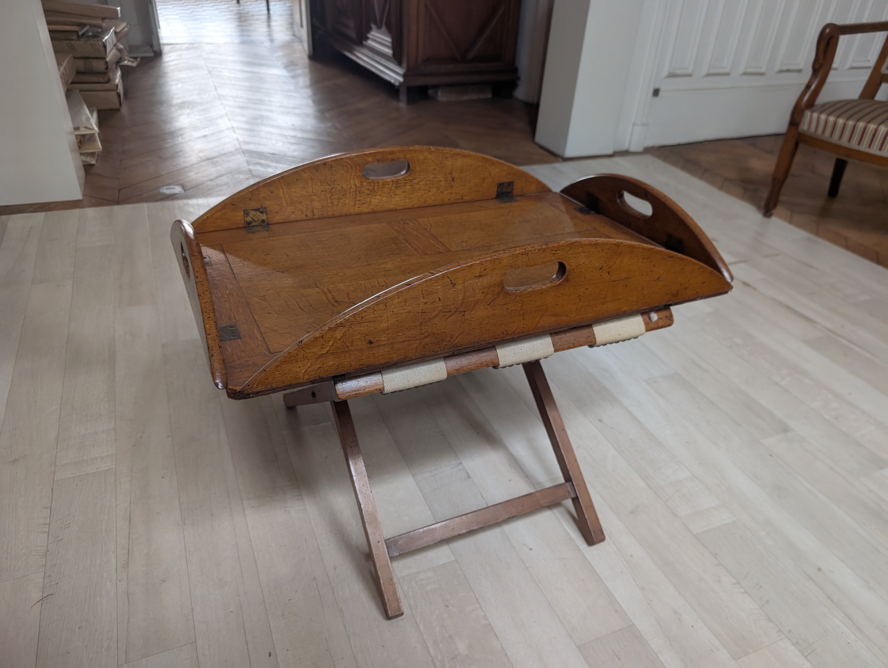 Sur son pietement en X sanglé. Haut. totale 46 cm.