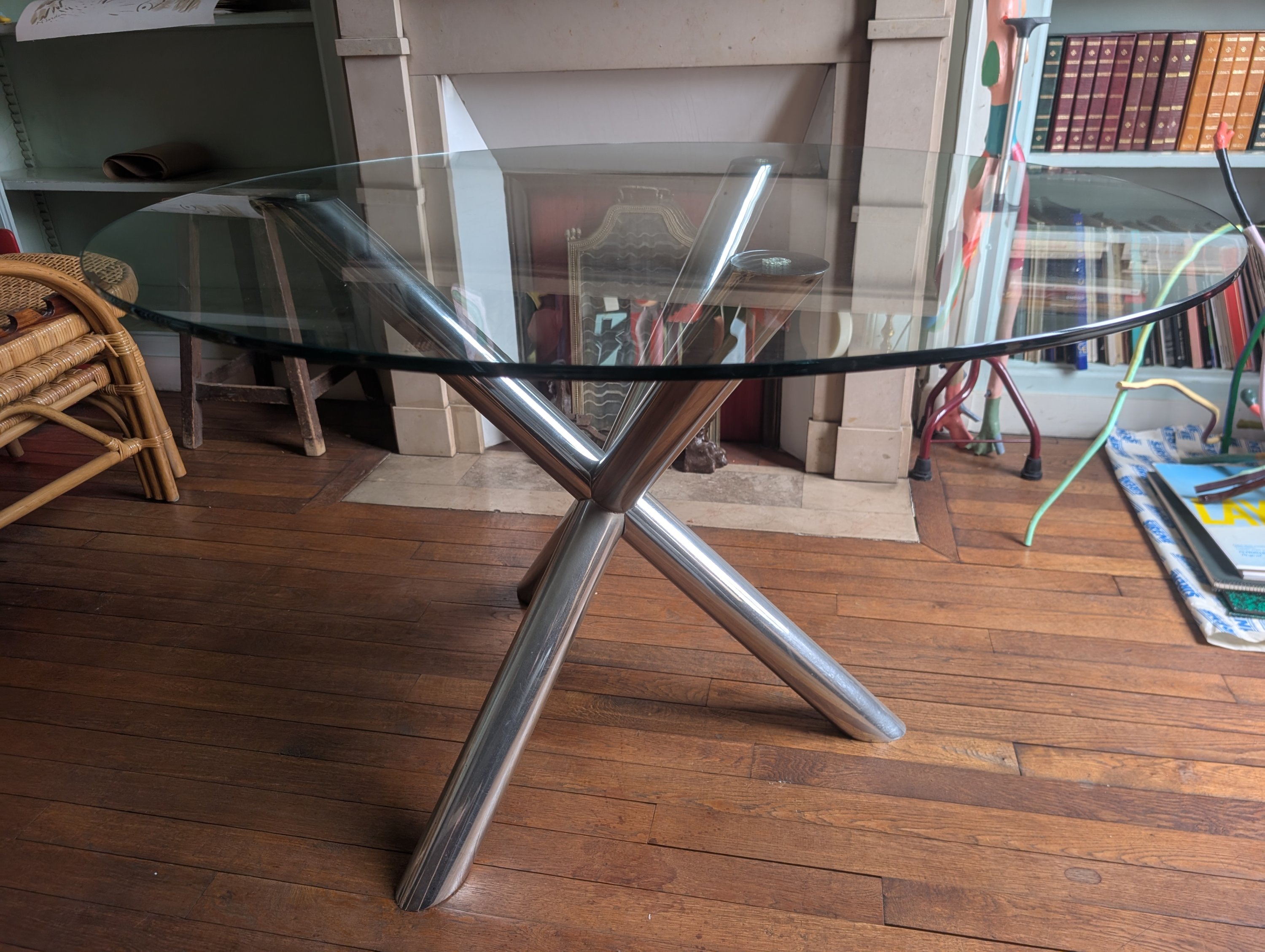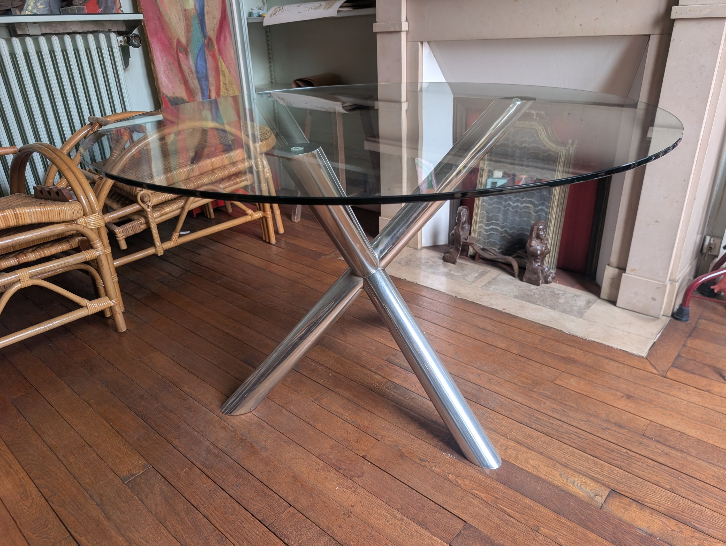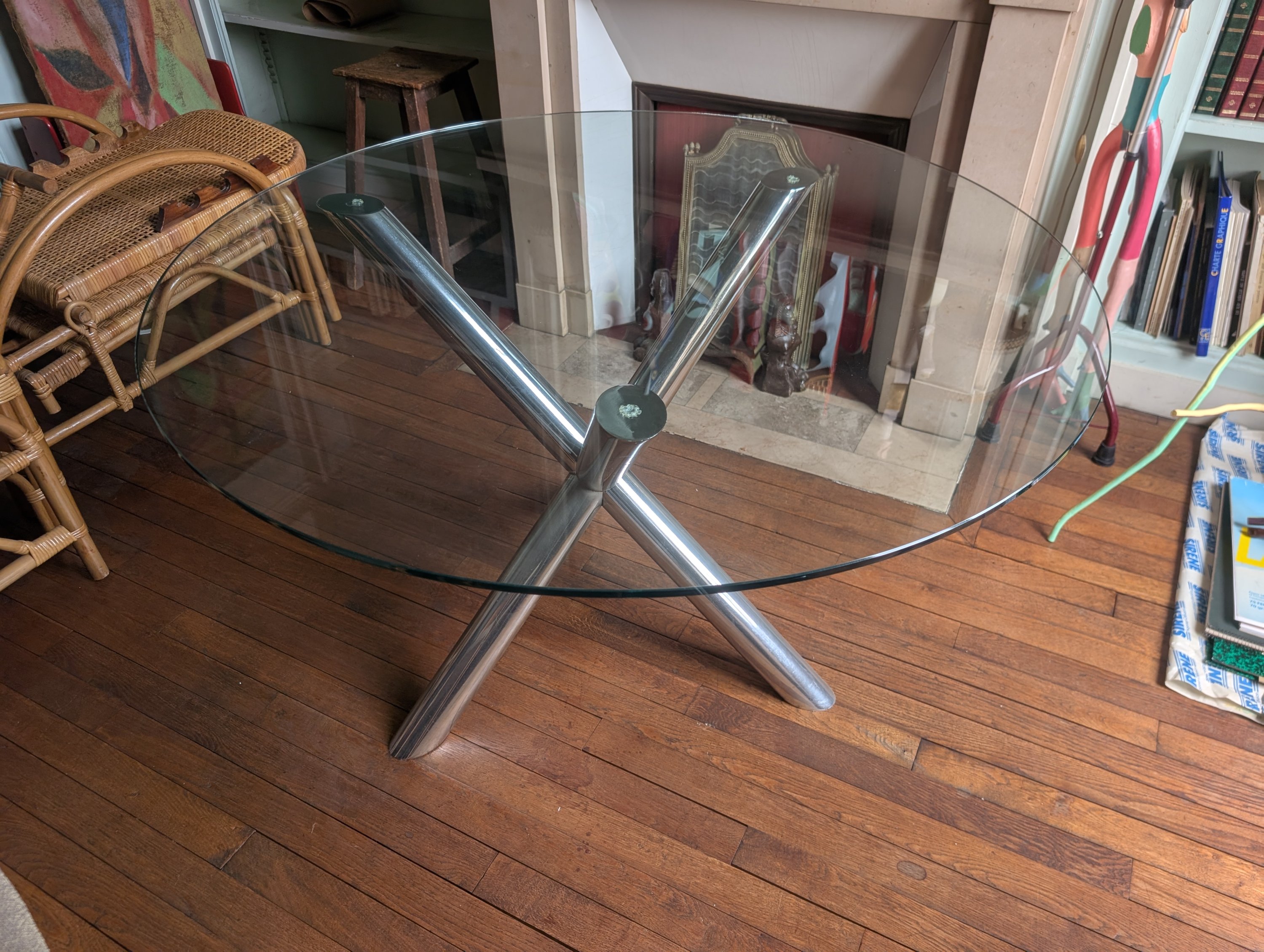 Table au plateau en verre rond sur un piètement tripode en croix en inox chromé.