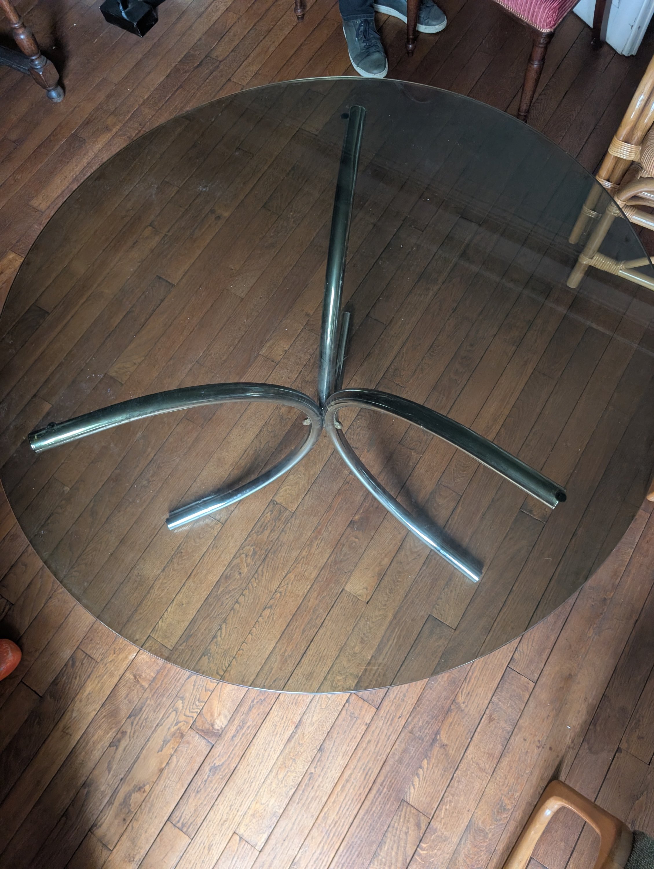 Piétement tripode en métal, nickelée, le plateau de forme circulaire en verre fumé.