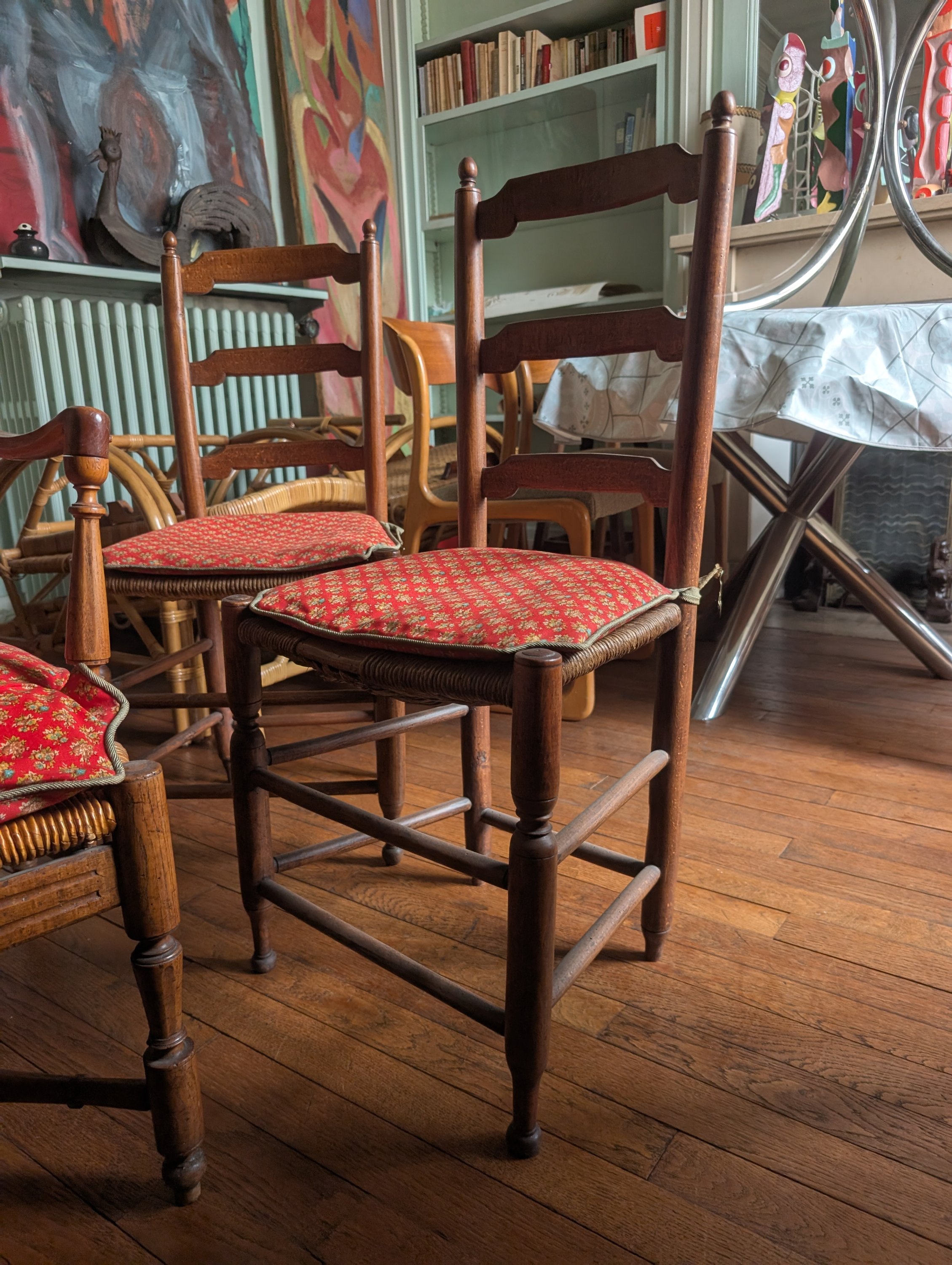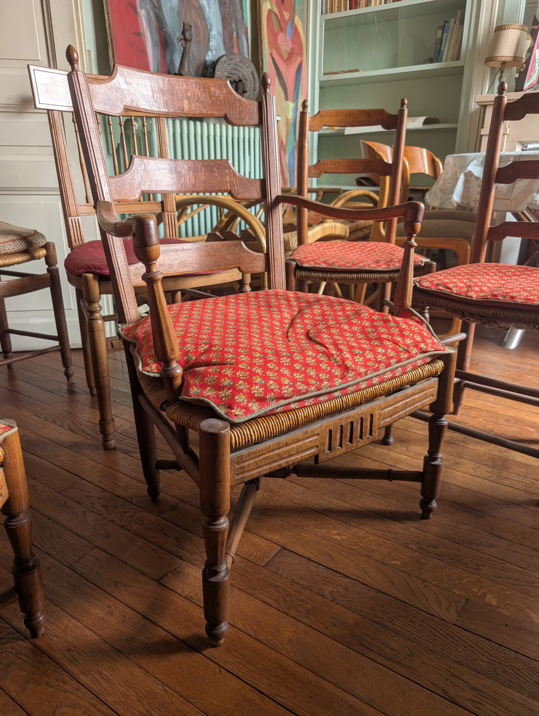 Paire de chaises Louis XVI avec leur dossier à barreaux, paire de fauteuils provençaux avec leurs entretoises en X une paire de chaises au dossier surmonté d'une pomme de pin et une chaise au dossier légèrement cabriolet.